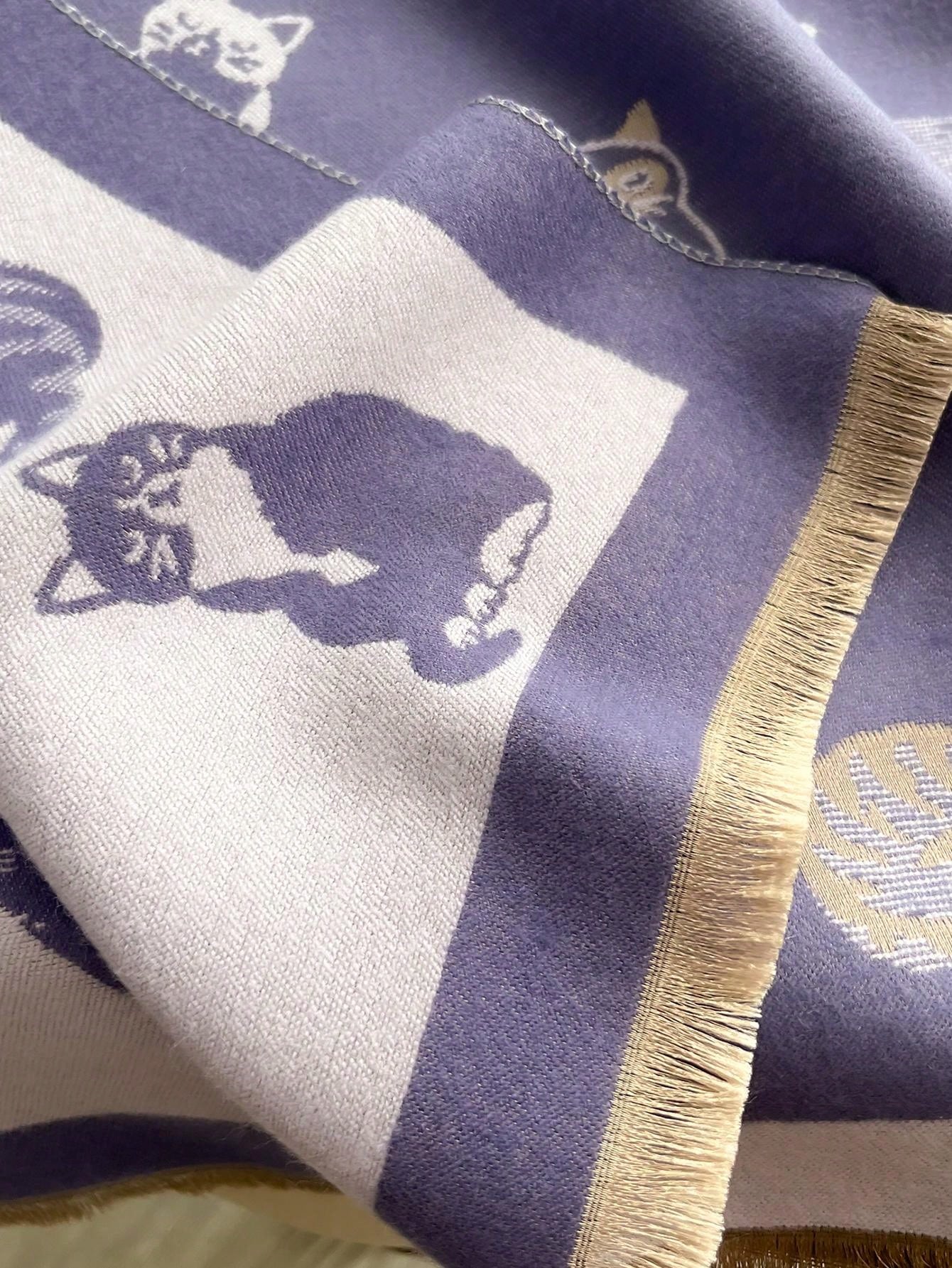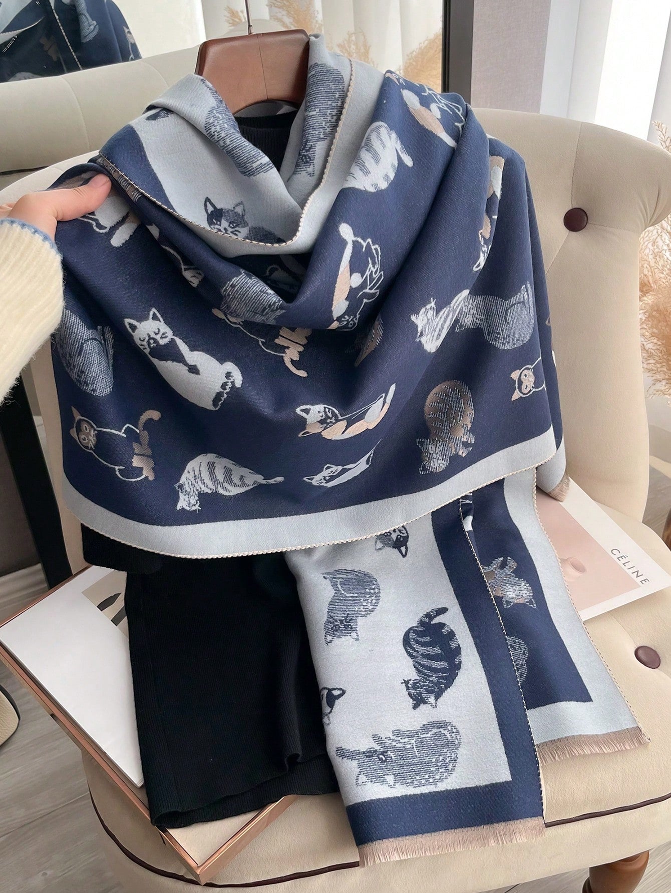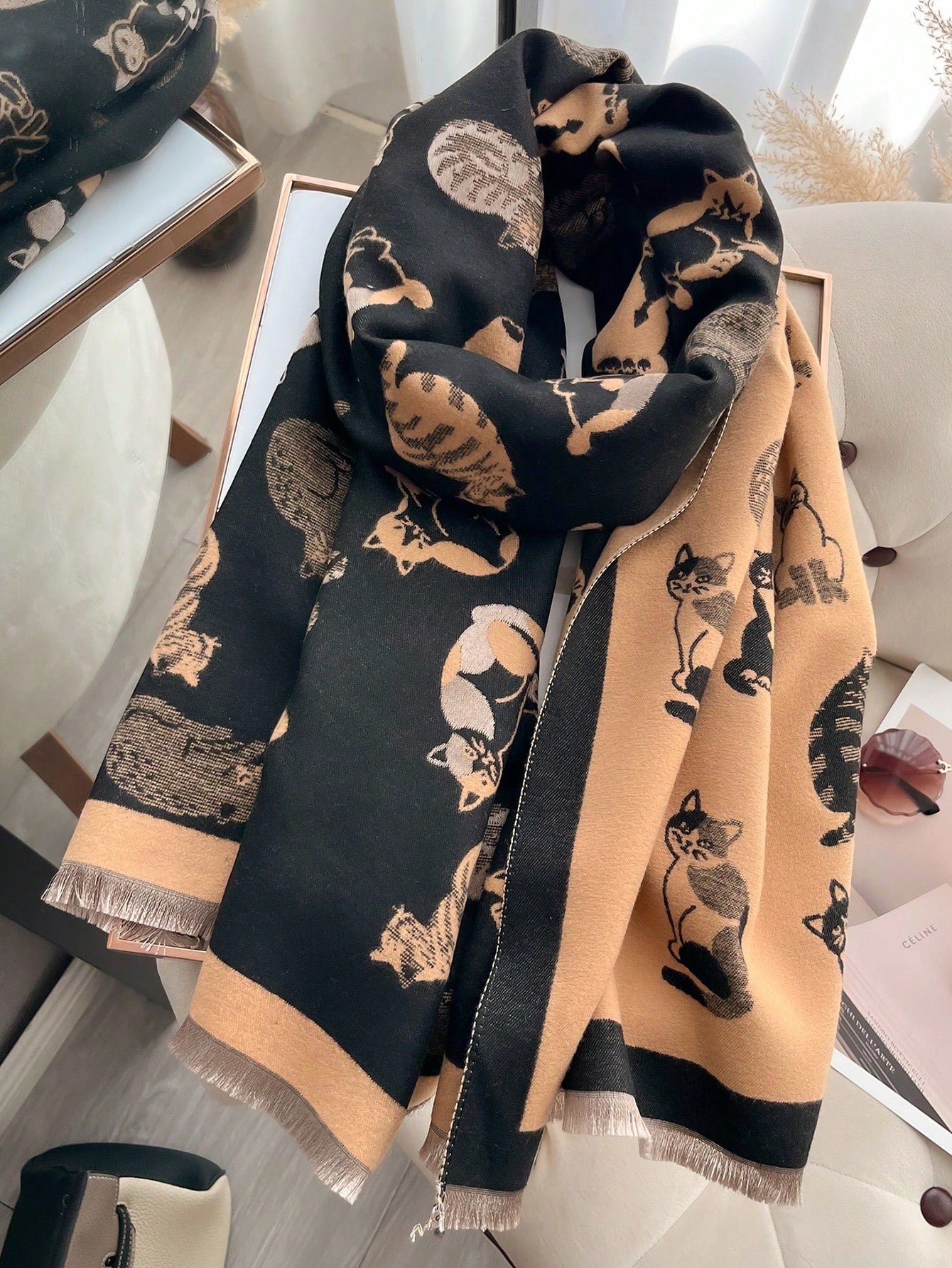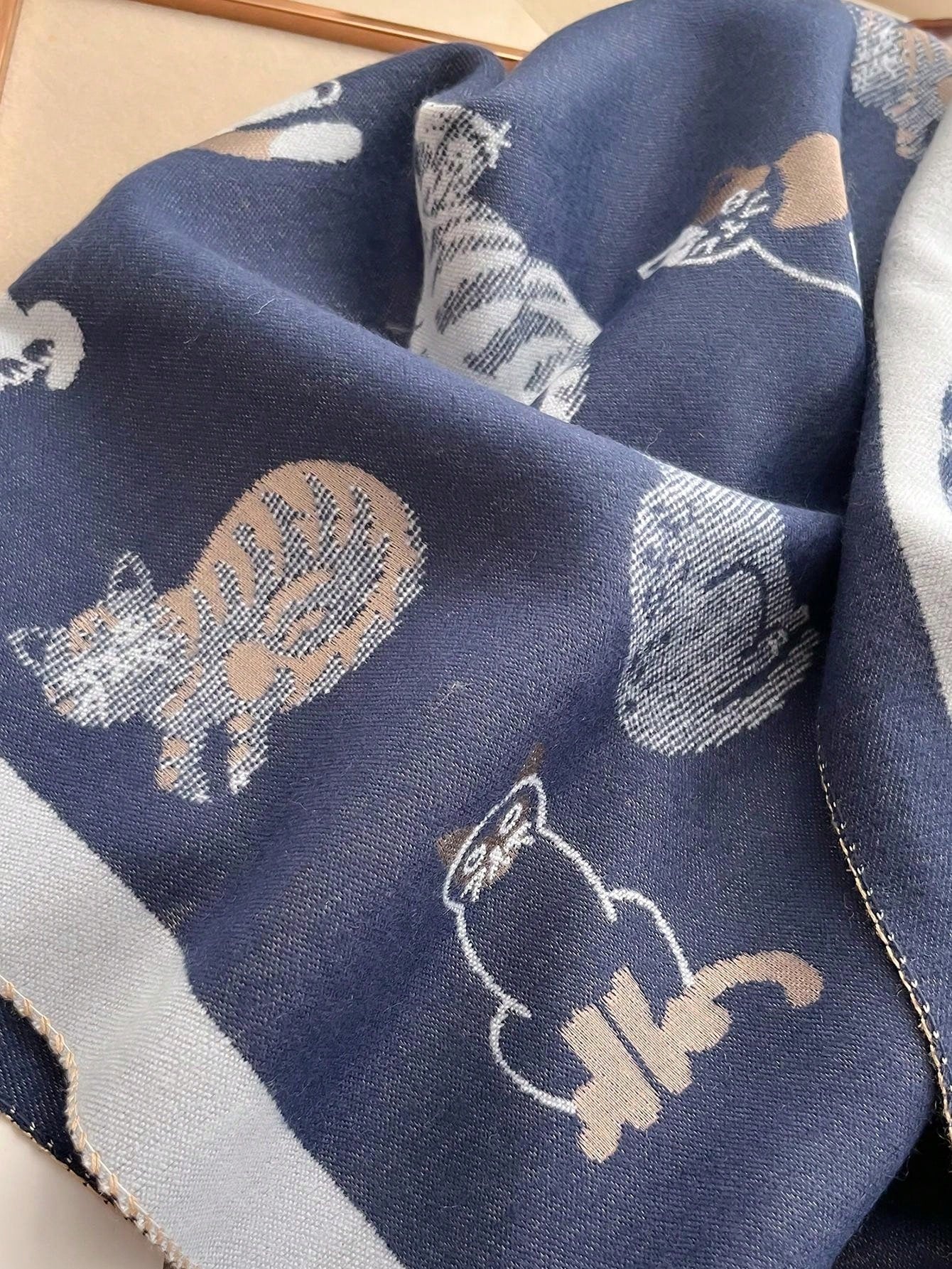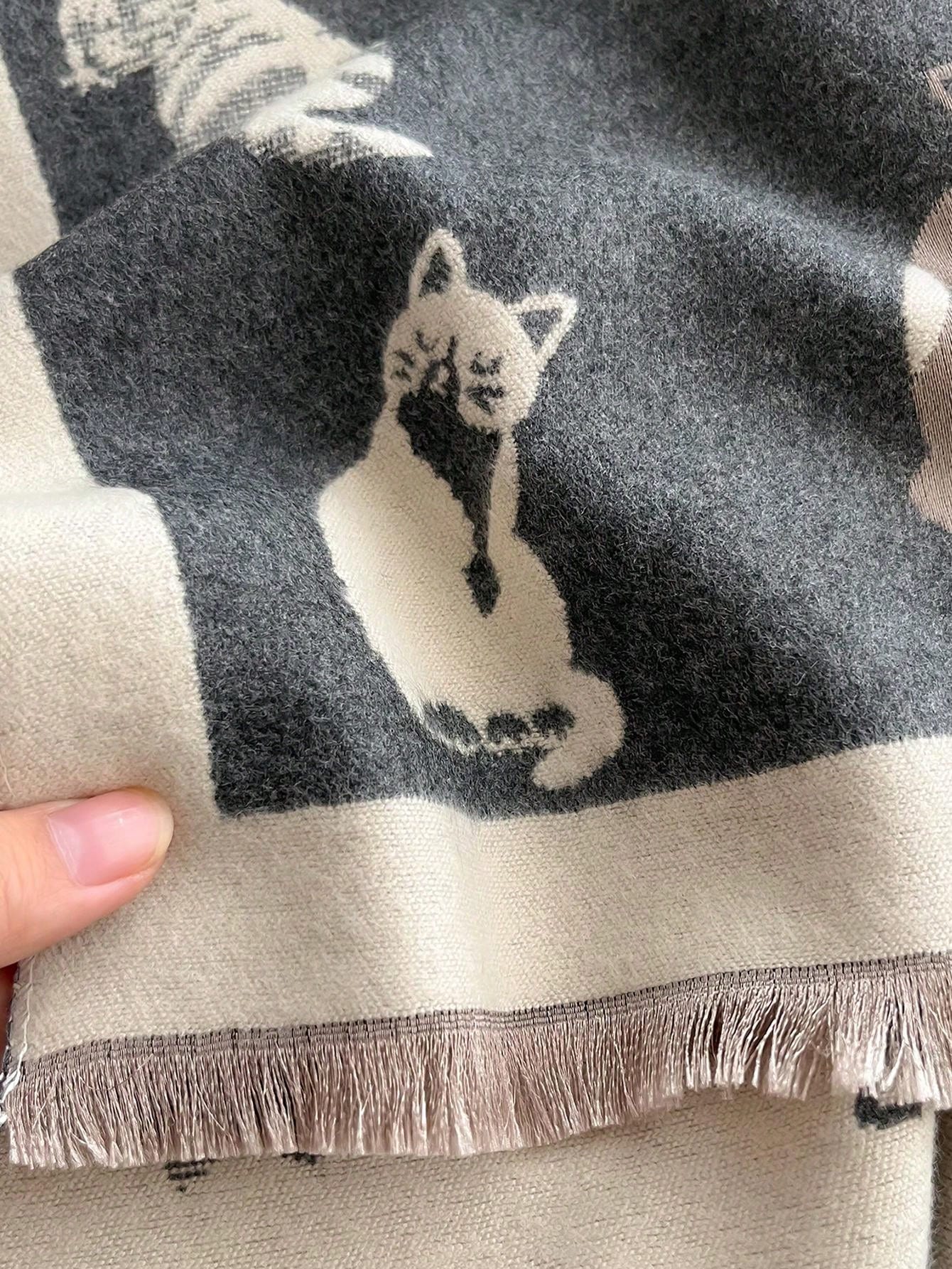 Charming Cat Jacquard Scarf: Cozy Faux Cashmere Accessory for Autumn/Winter