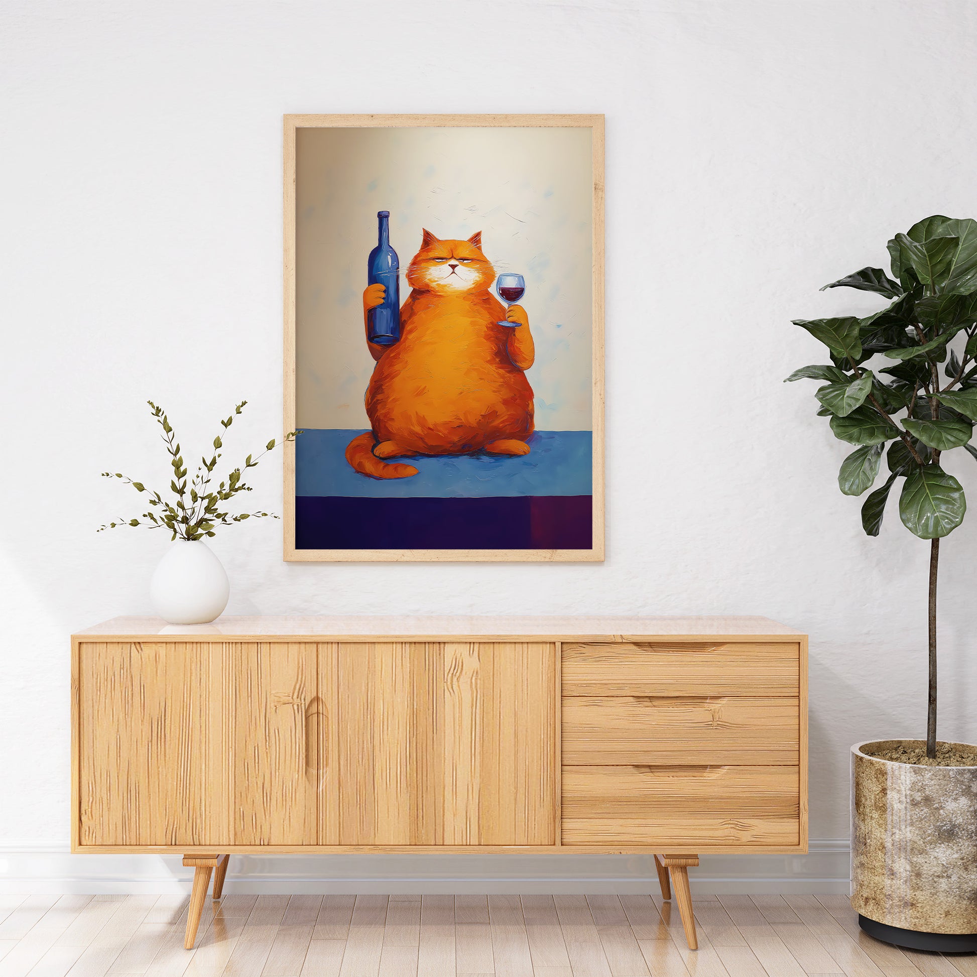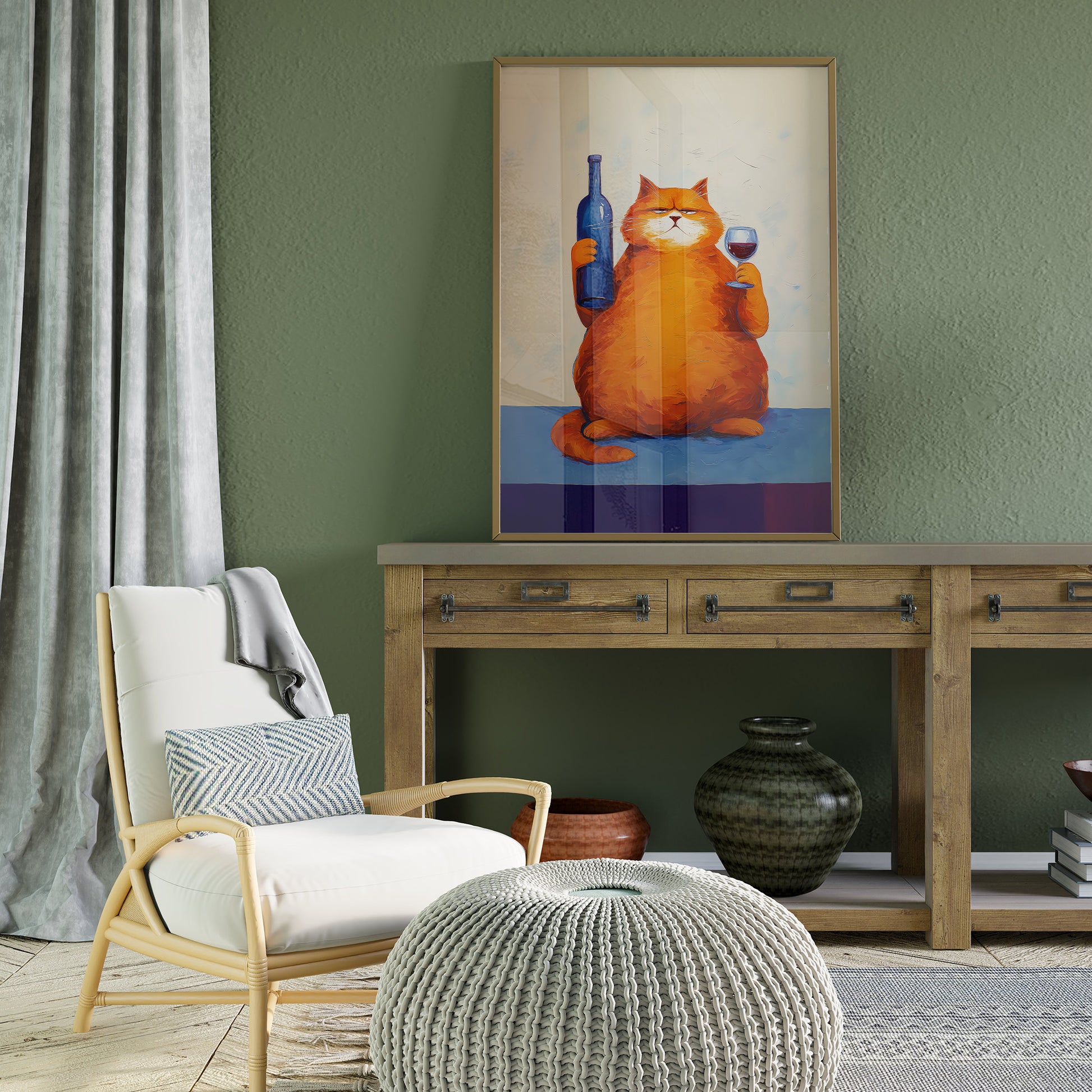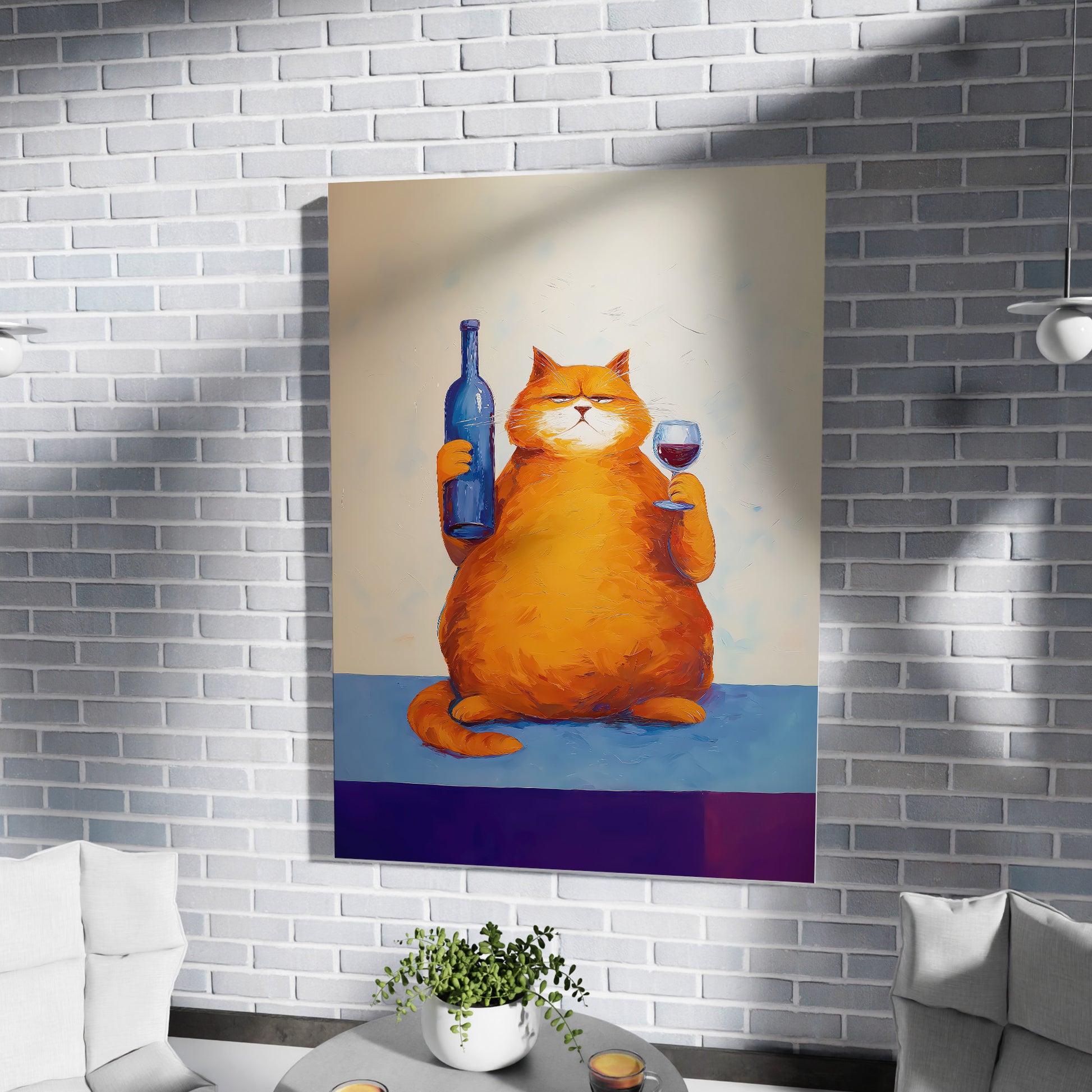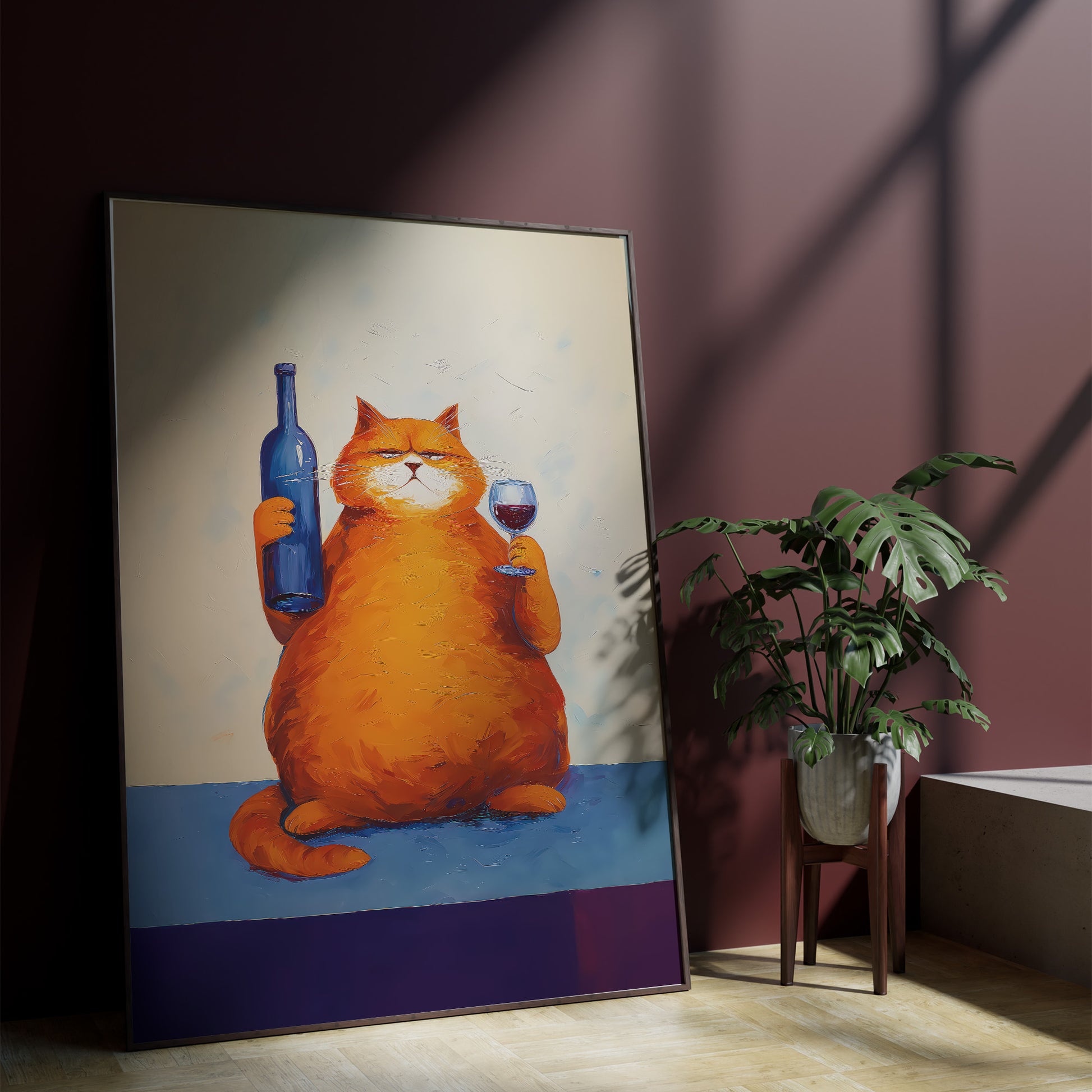 This playful artwork features a plump orange cat sitting confidently while holding a wine bottle in one paw and a filled wine glass in the other. With a smug, satisfied expression and bold painterly strokes, the scene blends humor and charm in a vivid palette of warm oranges and cool blues. The composition delivers a fun, quirky, and eye-catching piece perfect for kitchens, bars, or any space needing a touch of personality.