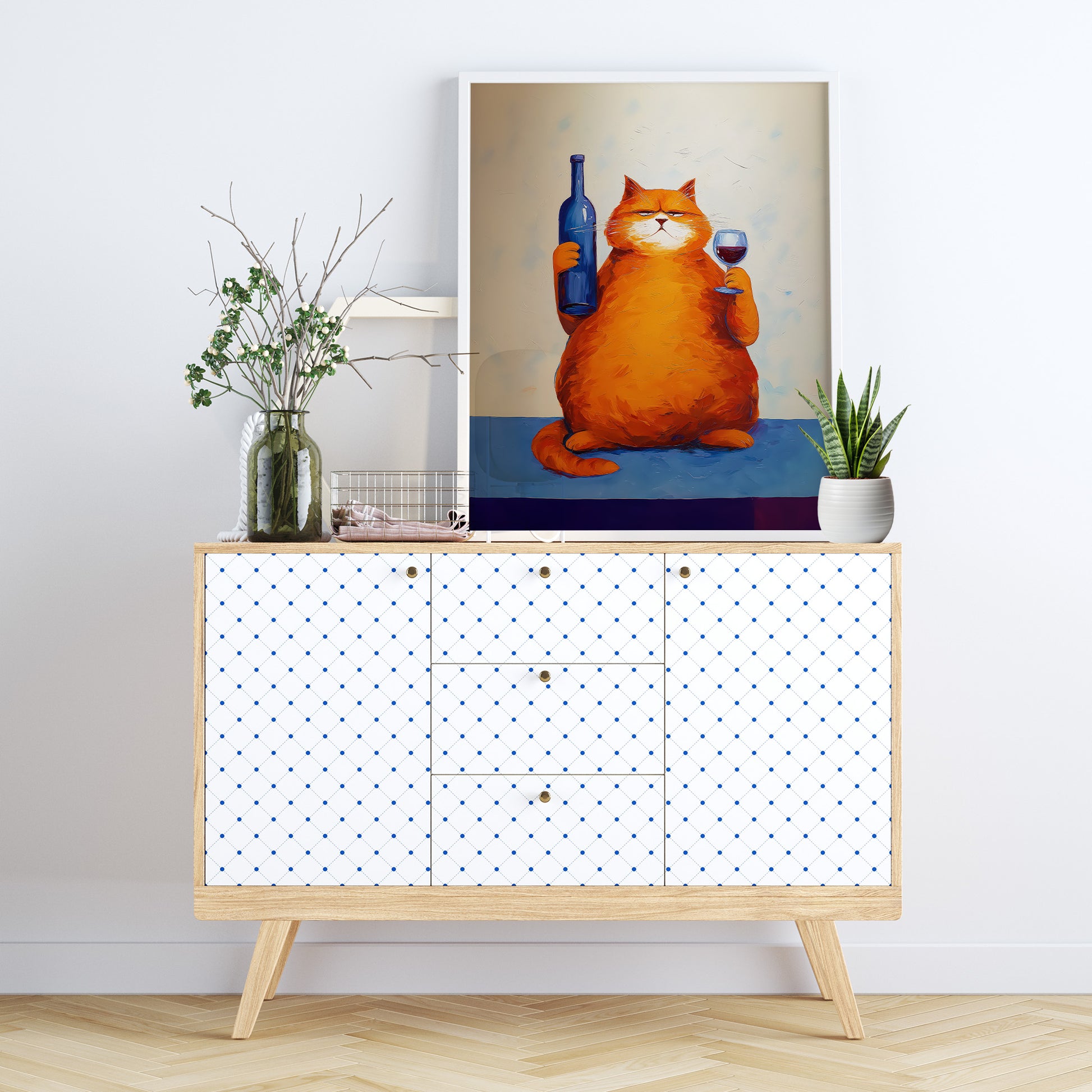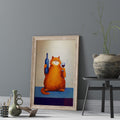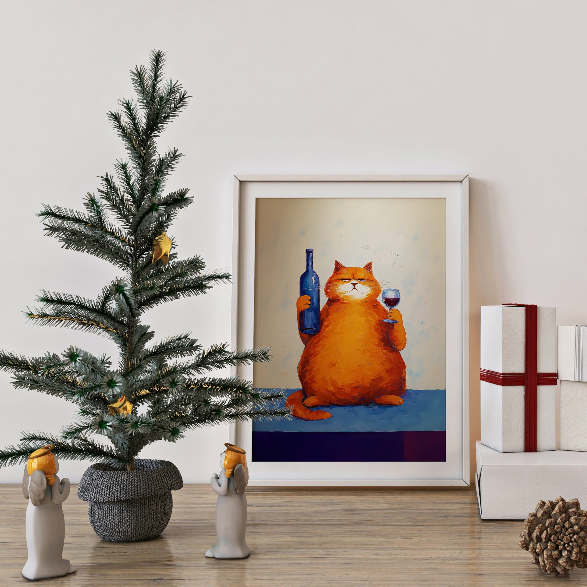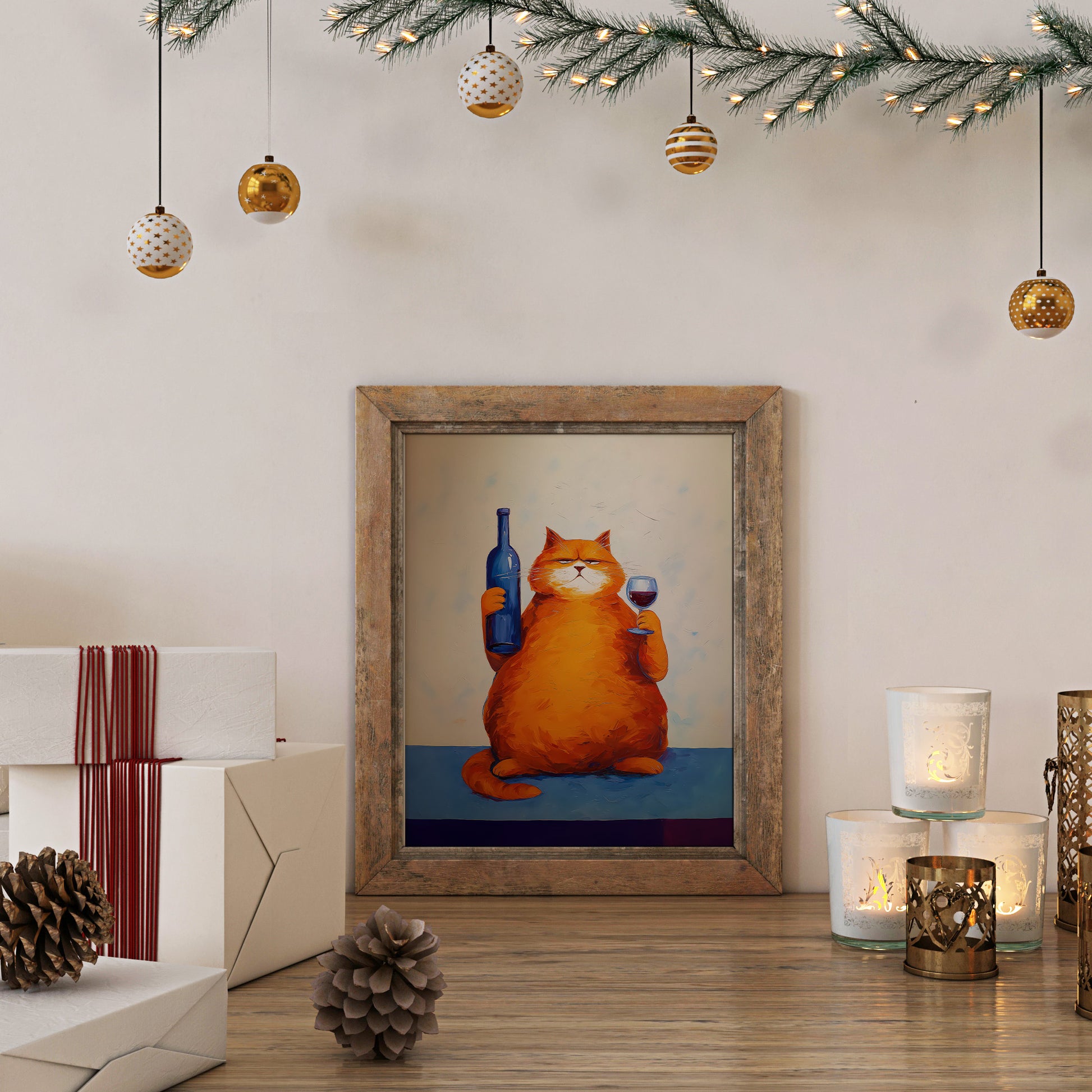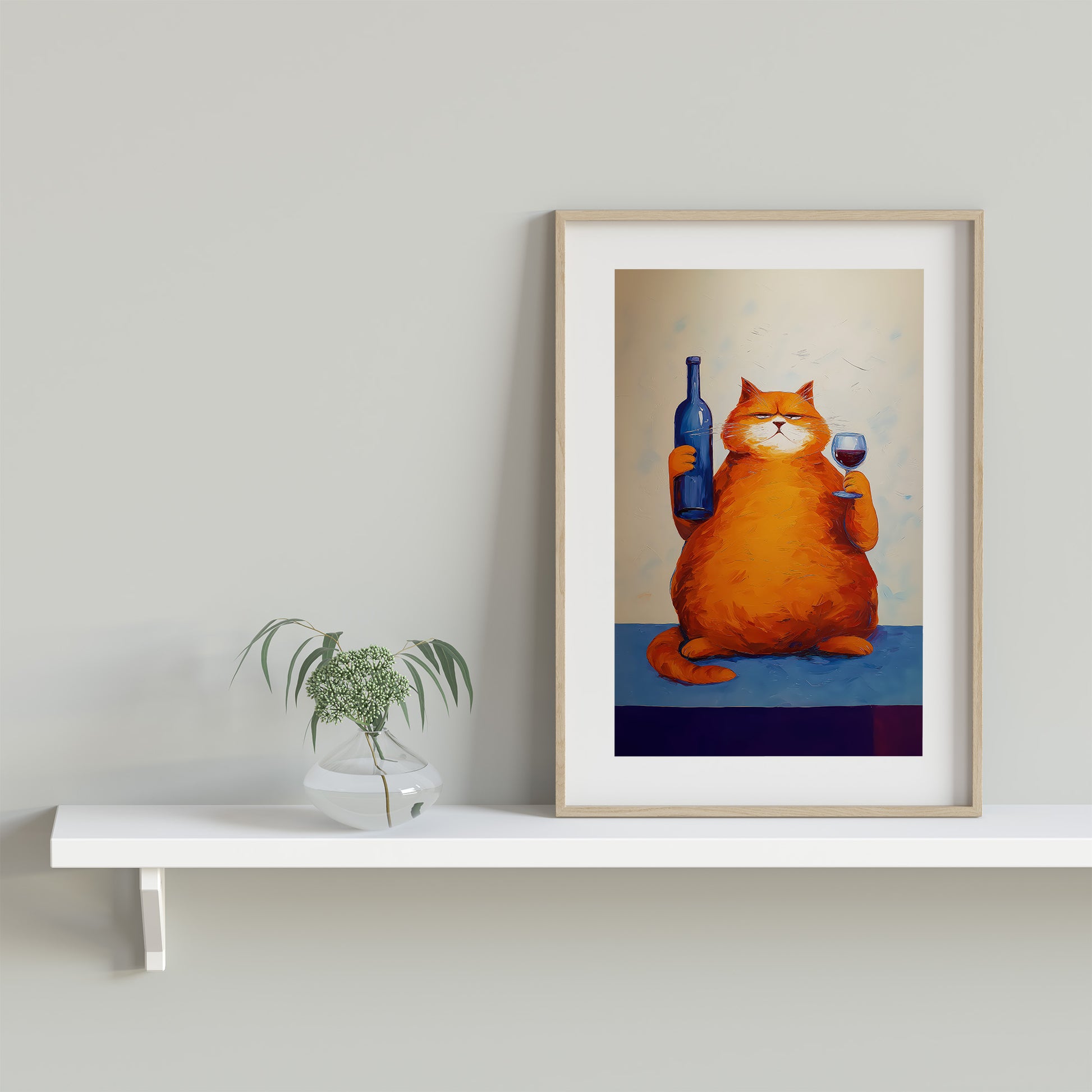 This playful artwork features a plump orange cat sitting confidently while holding a wine bottle in one paw and a filled wine glass in the other. With a smug, satisfied expression and bold painterly strokes, the scene blends humor and charm in a vivid palette of warm oranges and cool blues. The composition delivers a fun, quirky, and eye-catching piece perfect for kitchens, bars, or any space needing a touch of personality.