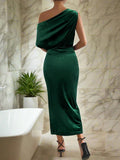 This dress is a must-have for any fashion-forward individual. Its asymmetrical neck and ruched details make it a chic and elegant statement piece. Plus, the split thigh adds a touch of allure. Perfect for a classy night out or a formal event.
