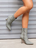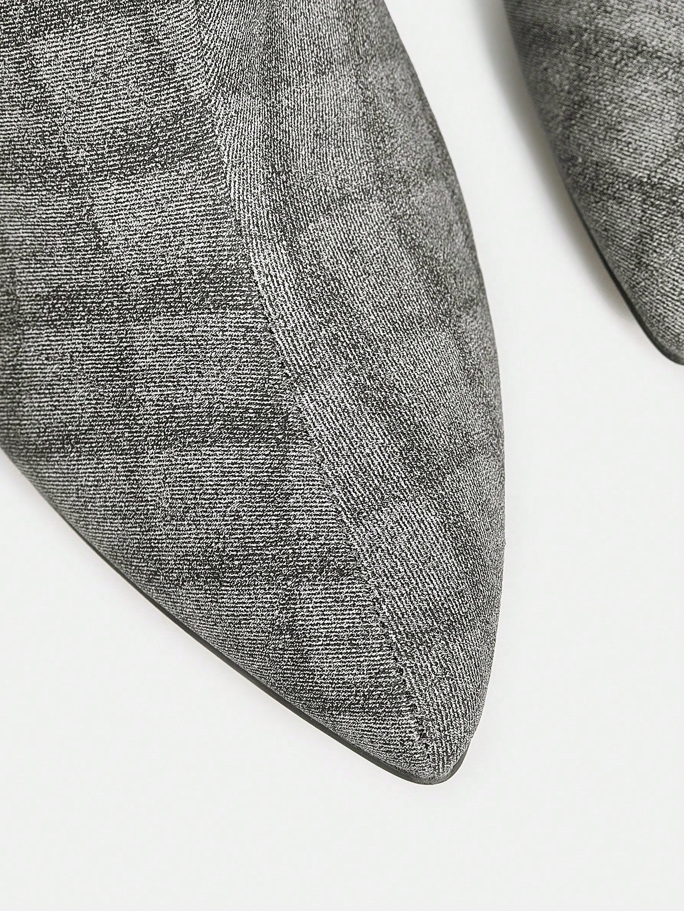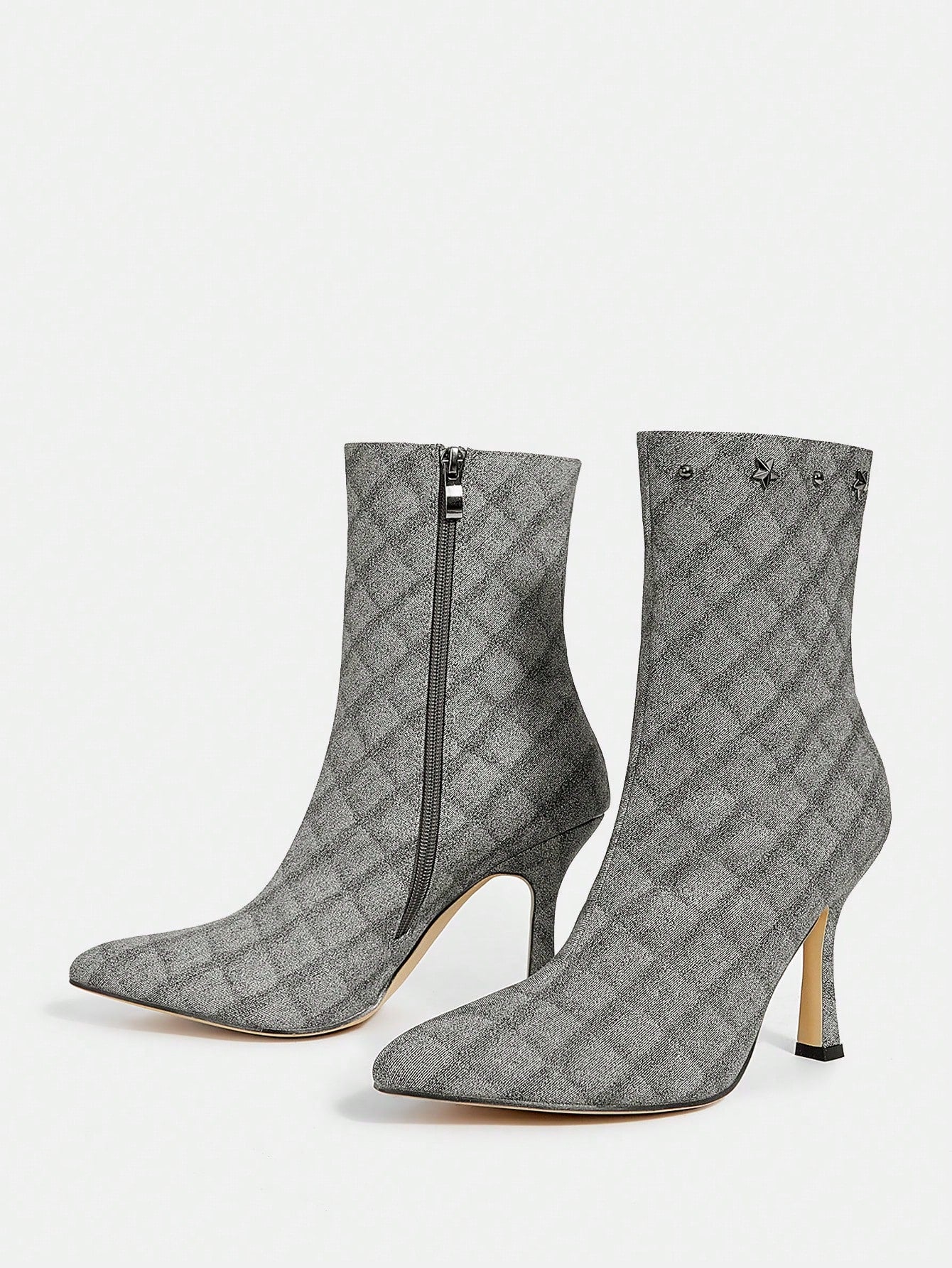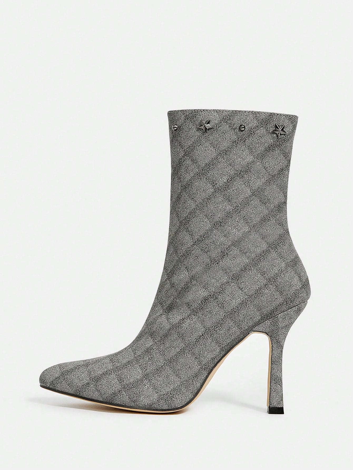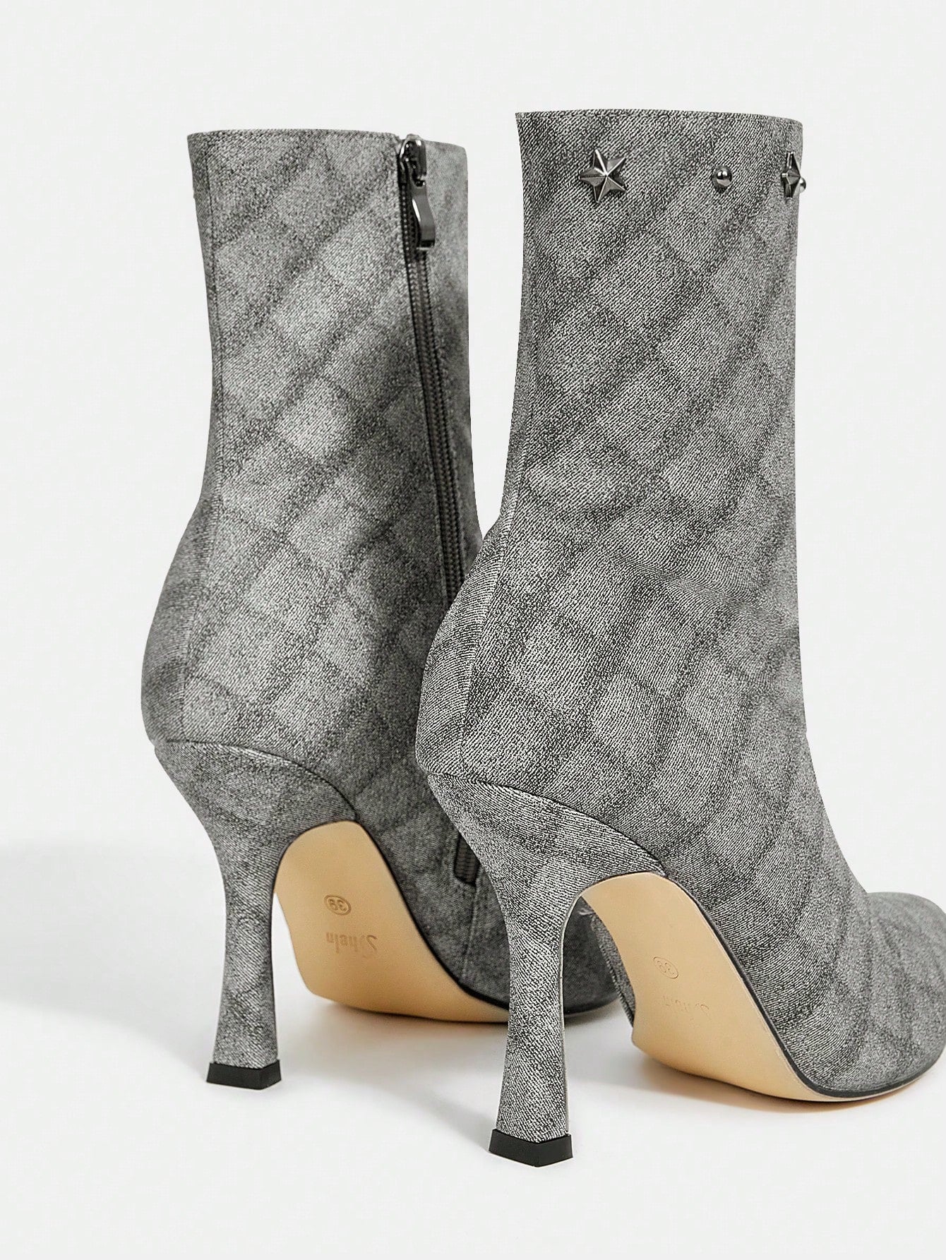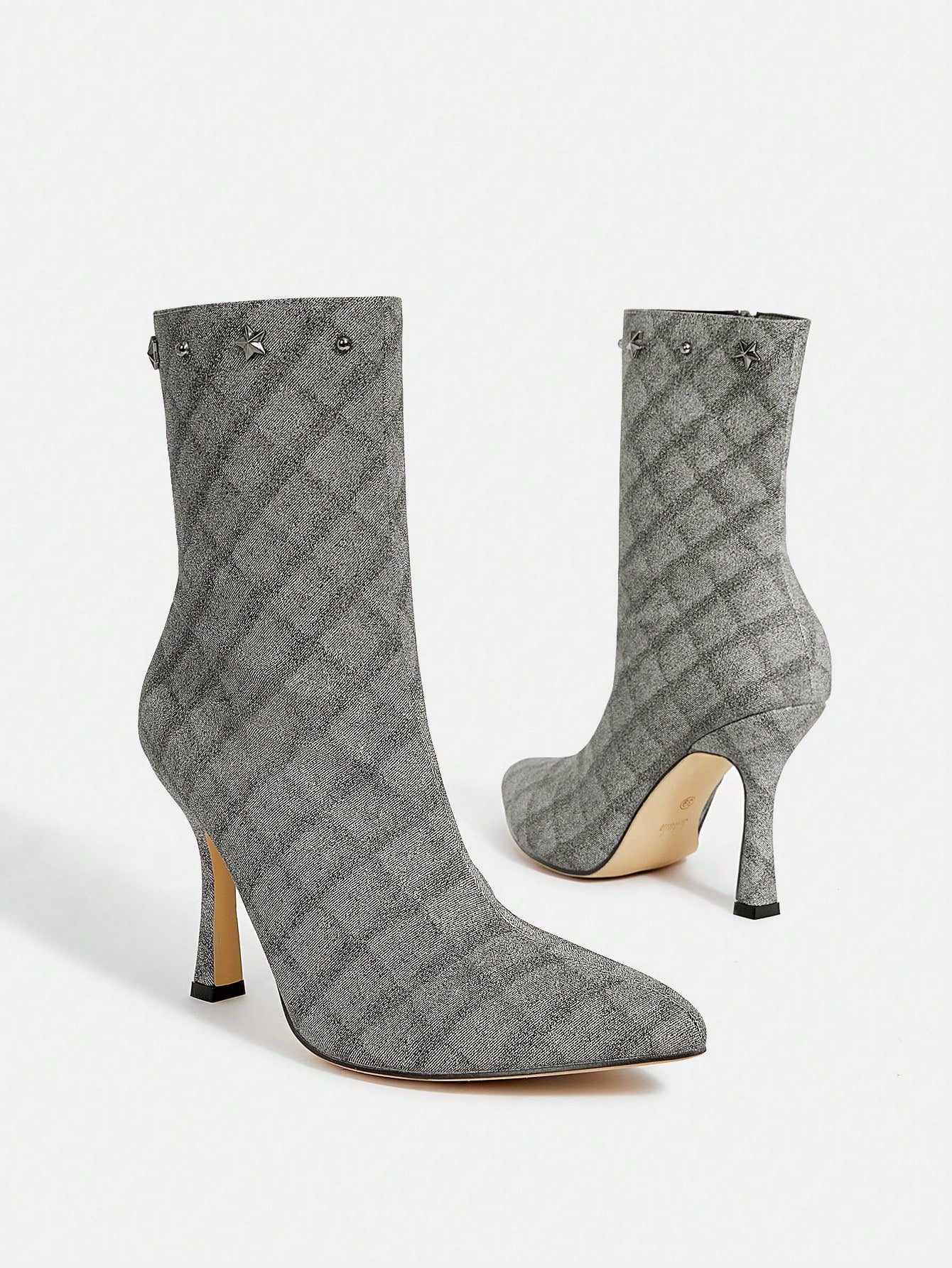 Chic and Stylish Grey Plaid Embroidered High Heeled Short Boots - Perfect for a Fashion Forward Look!