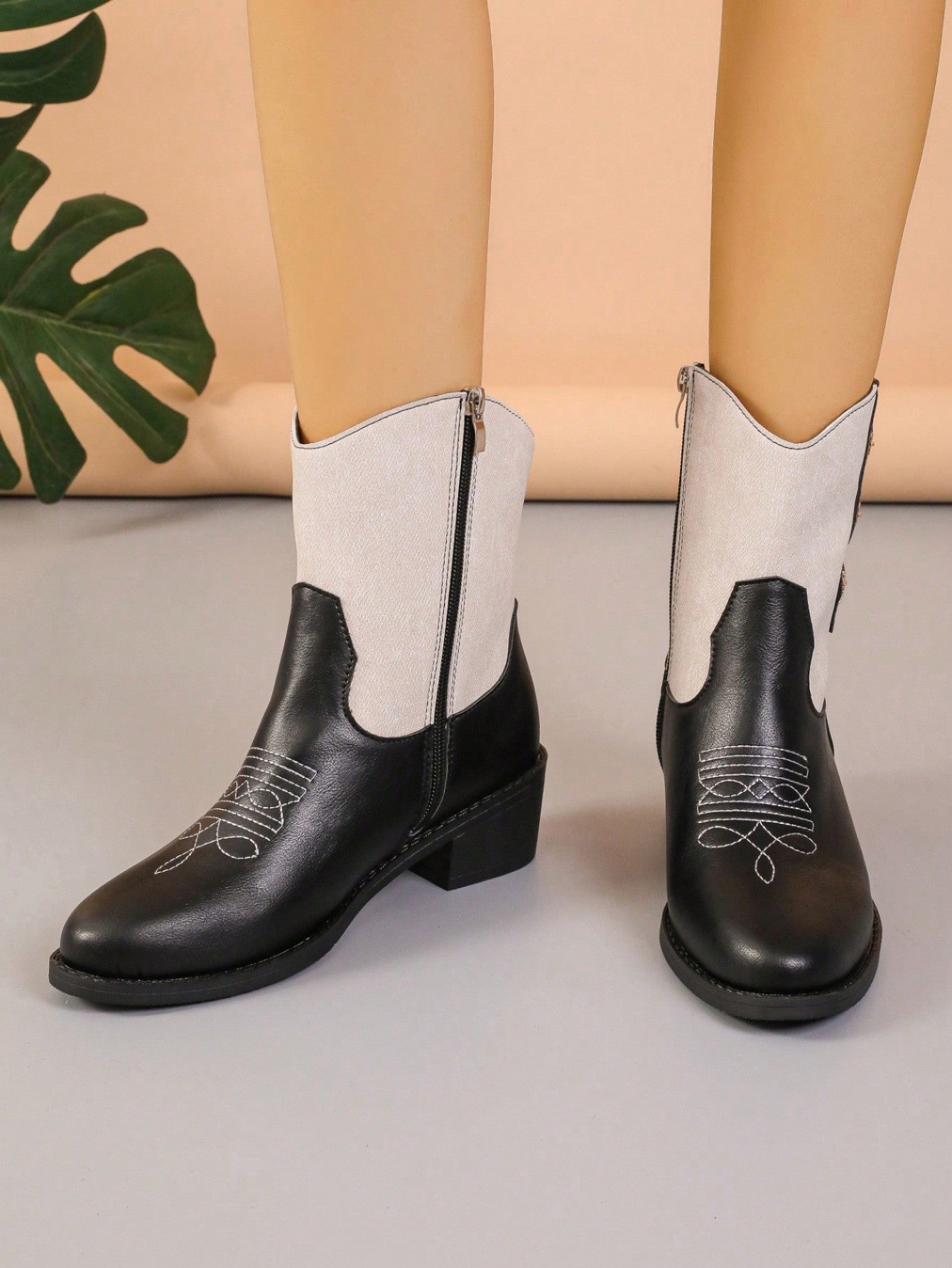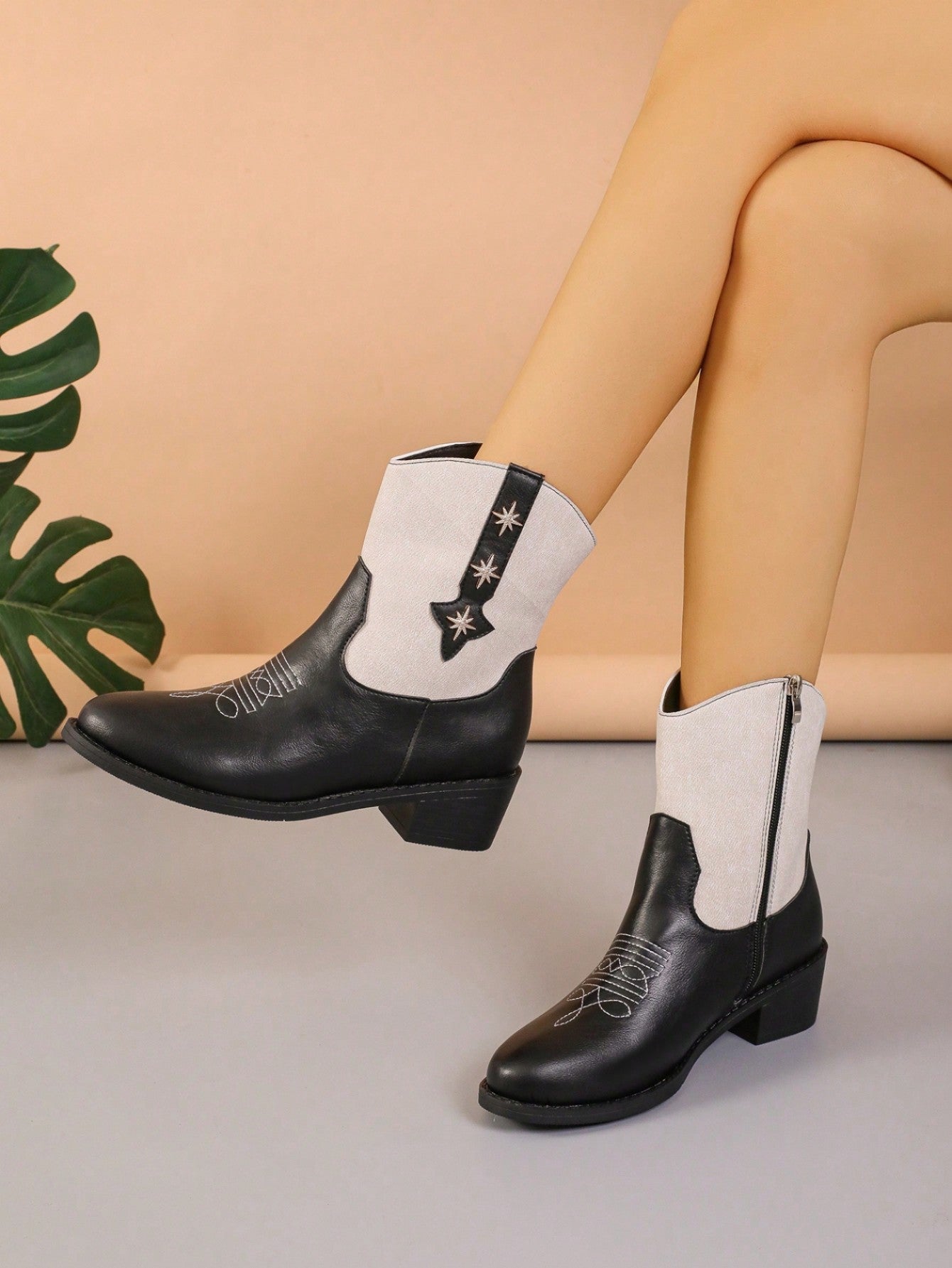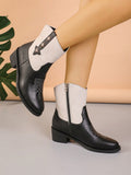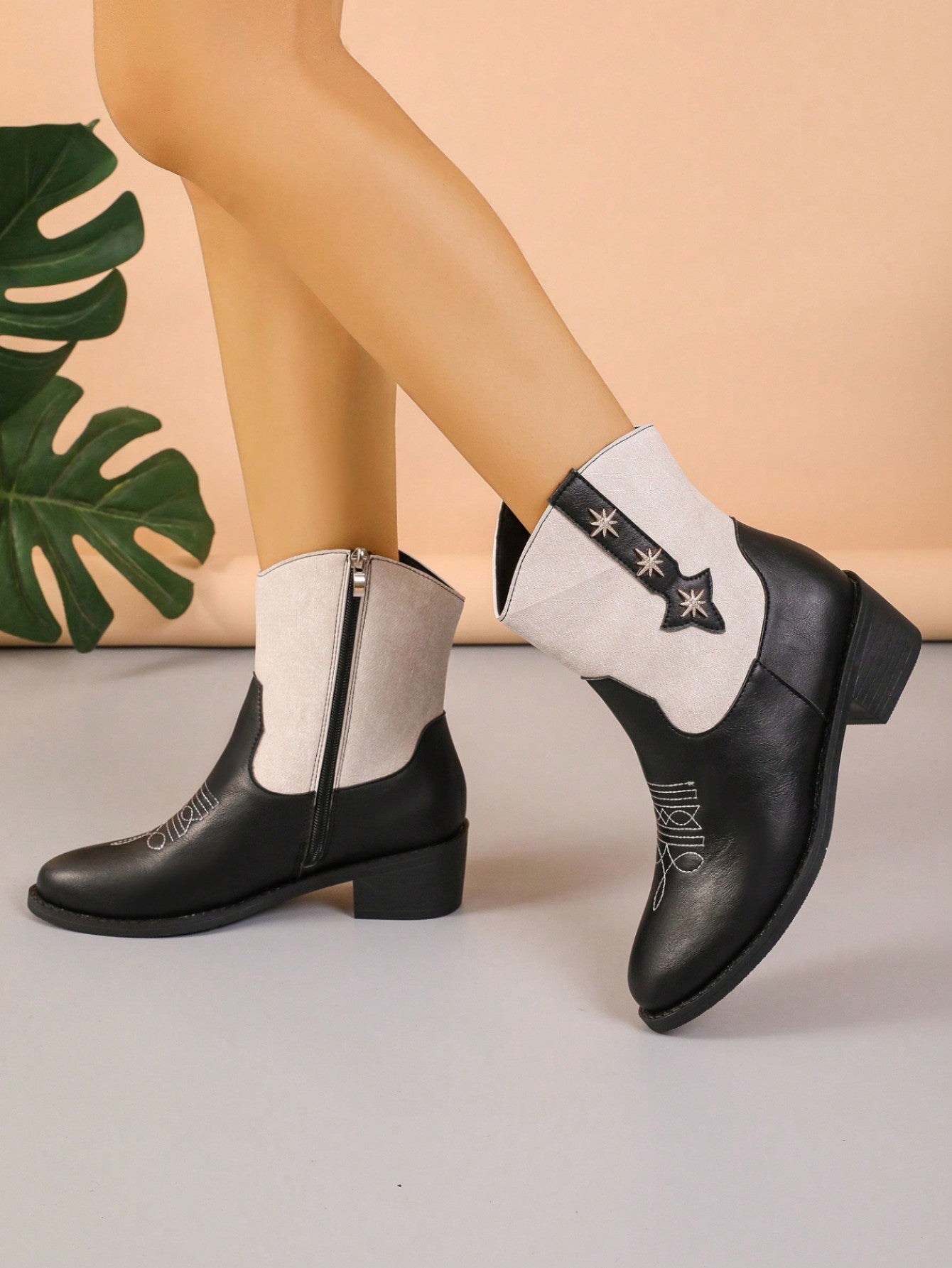 Chic Black Patchwork Plus-Size Embroidered Chunky Heel Ankle Boots