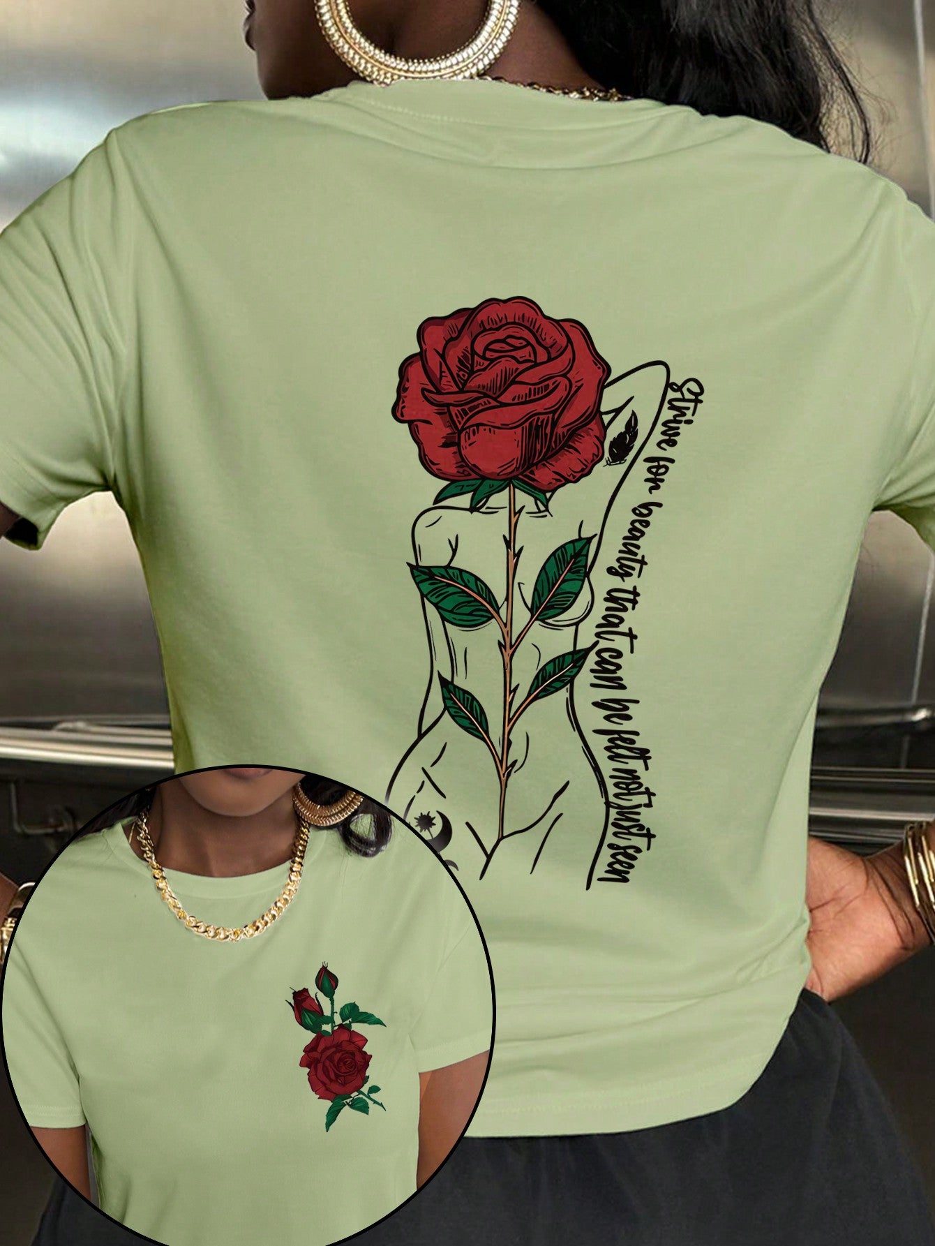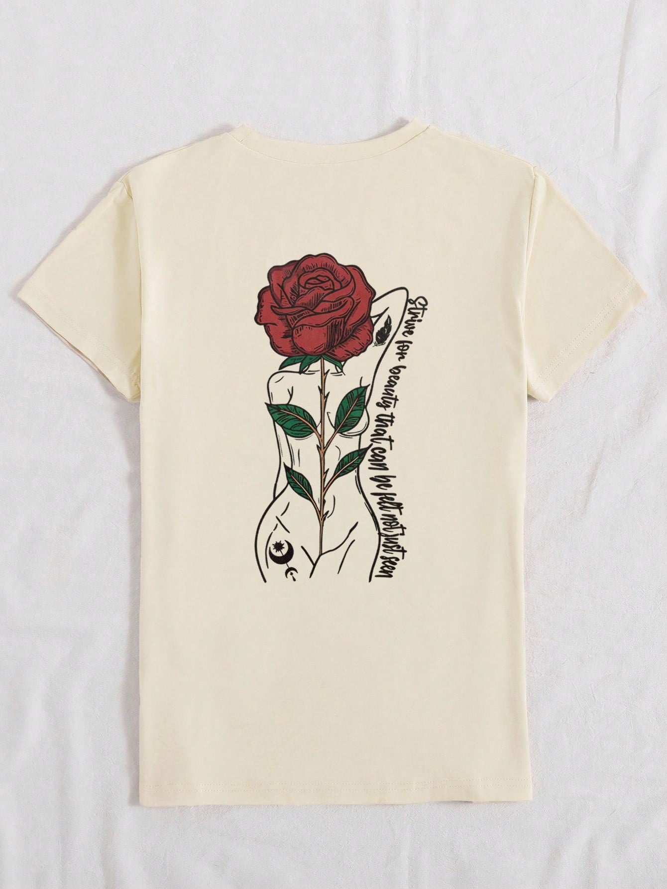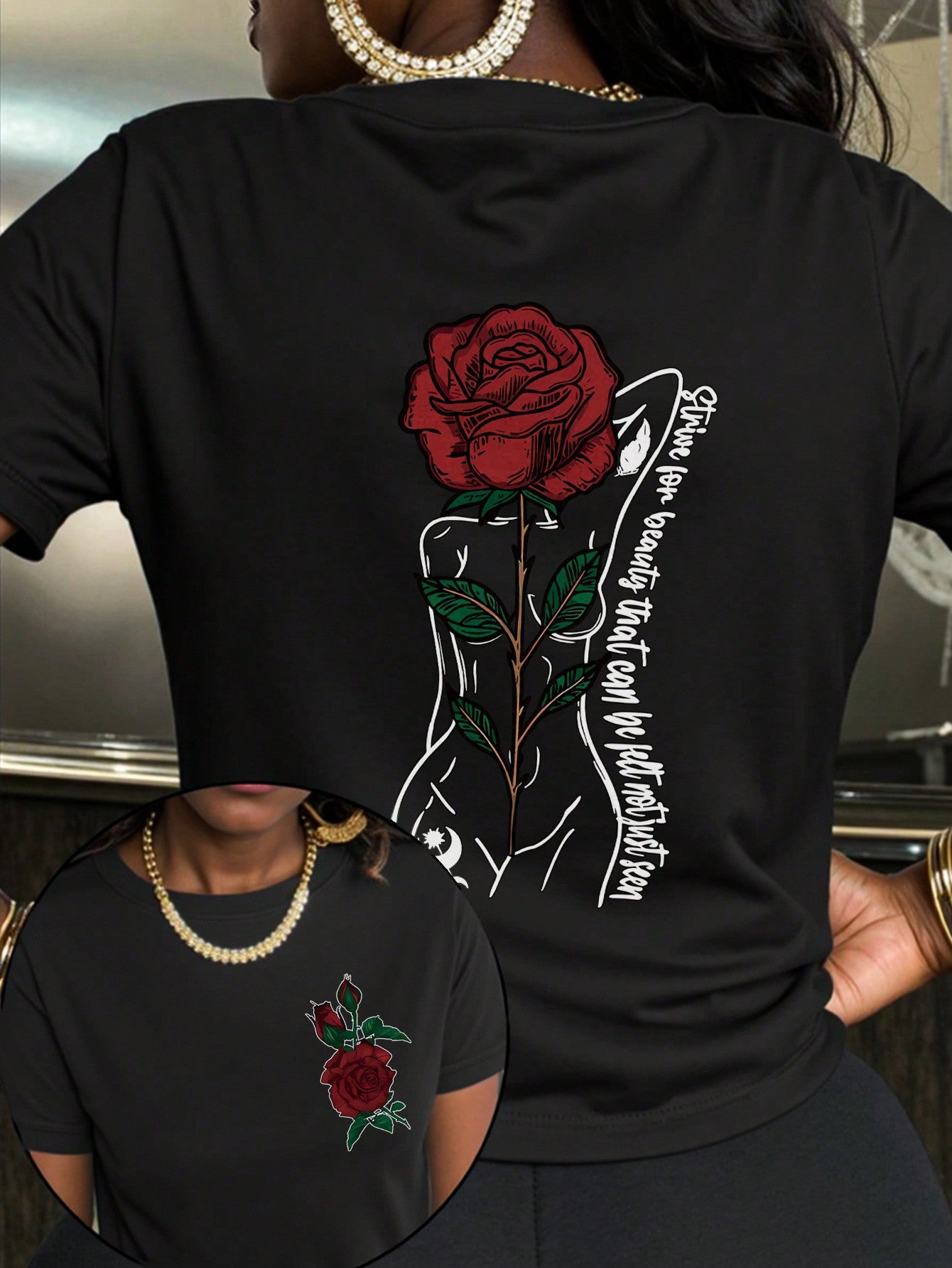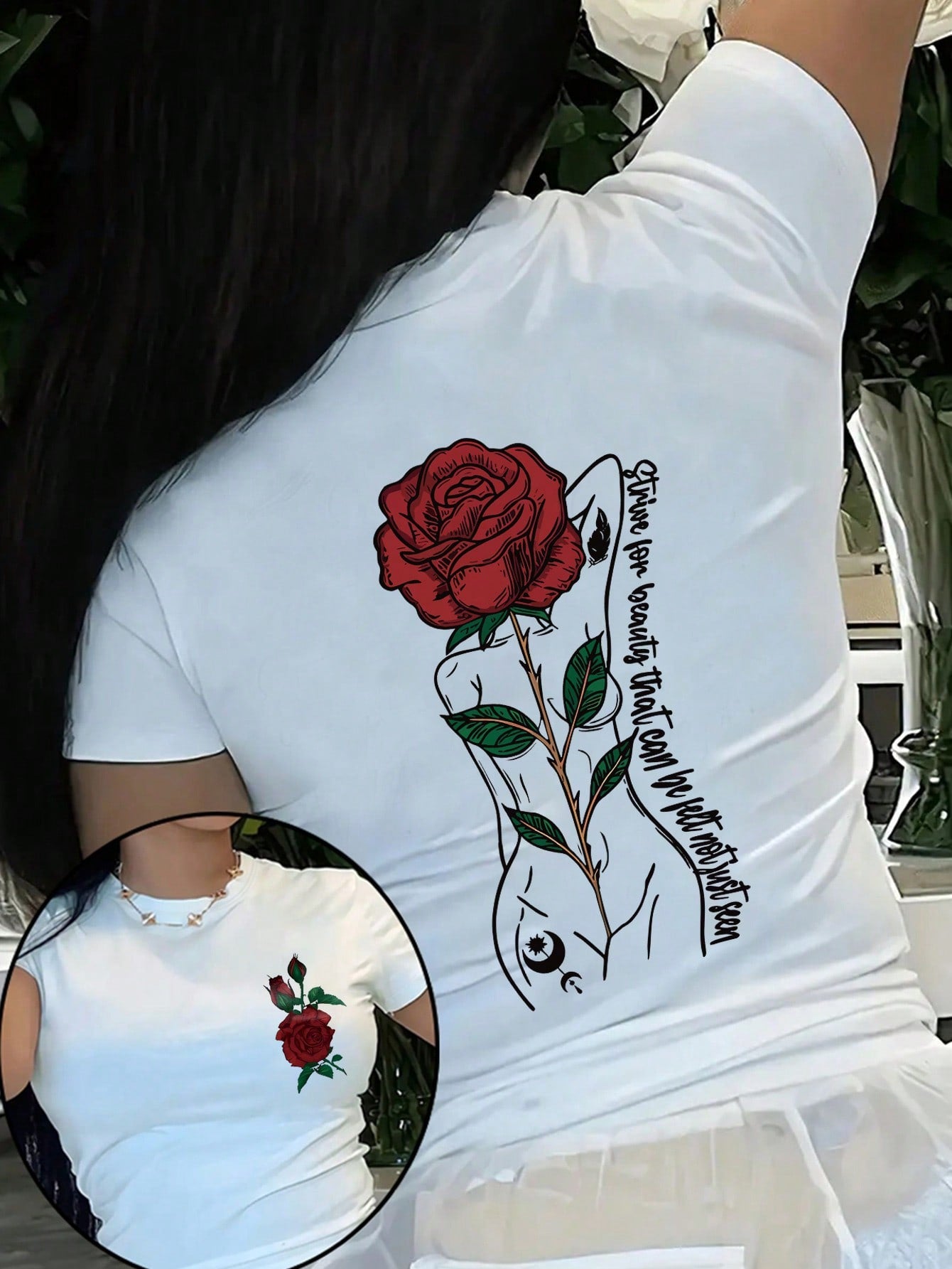This women's t-shirt combines chic style and casual comfort with its rose letter print and short sleeve design. Perfect for a casual day out or to elevate your everyday look. Made for comfort and style with a touch of femininity.