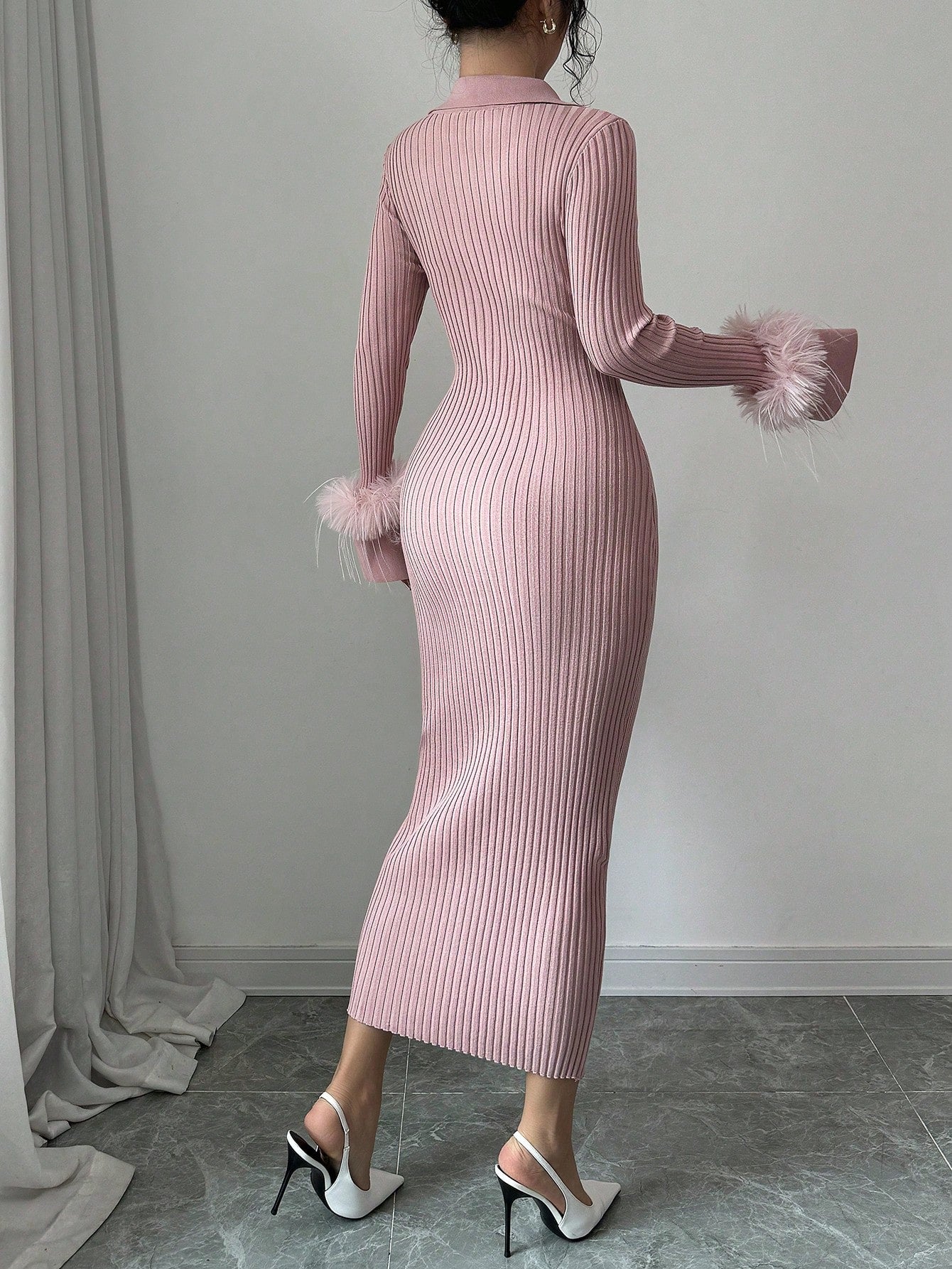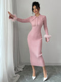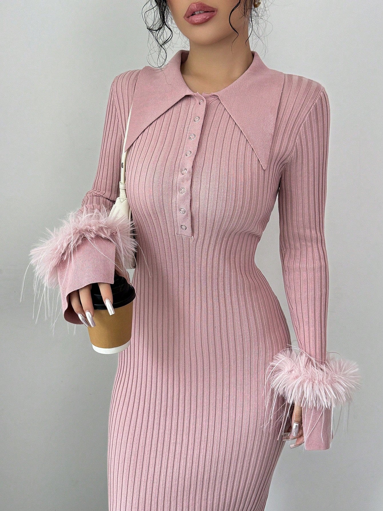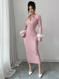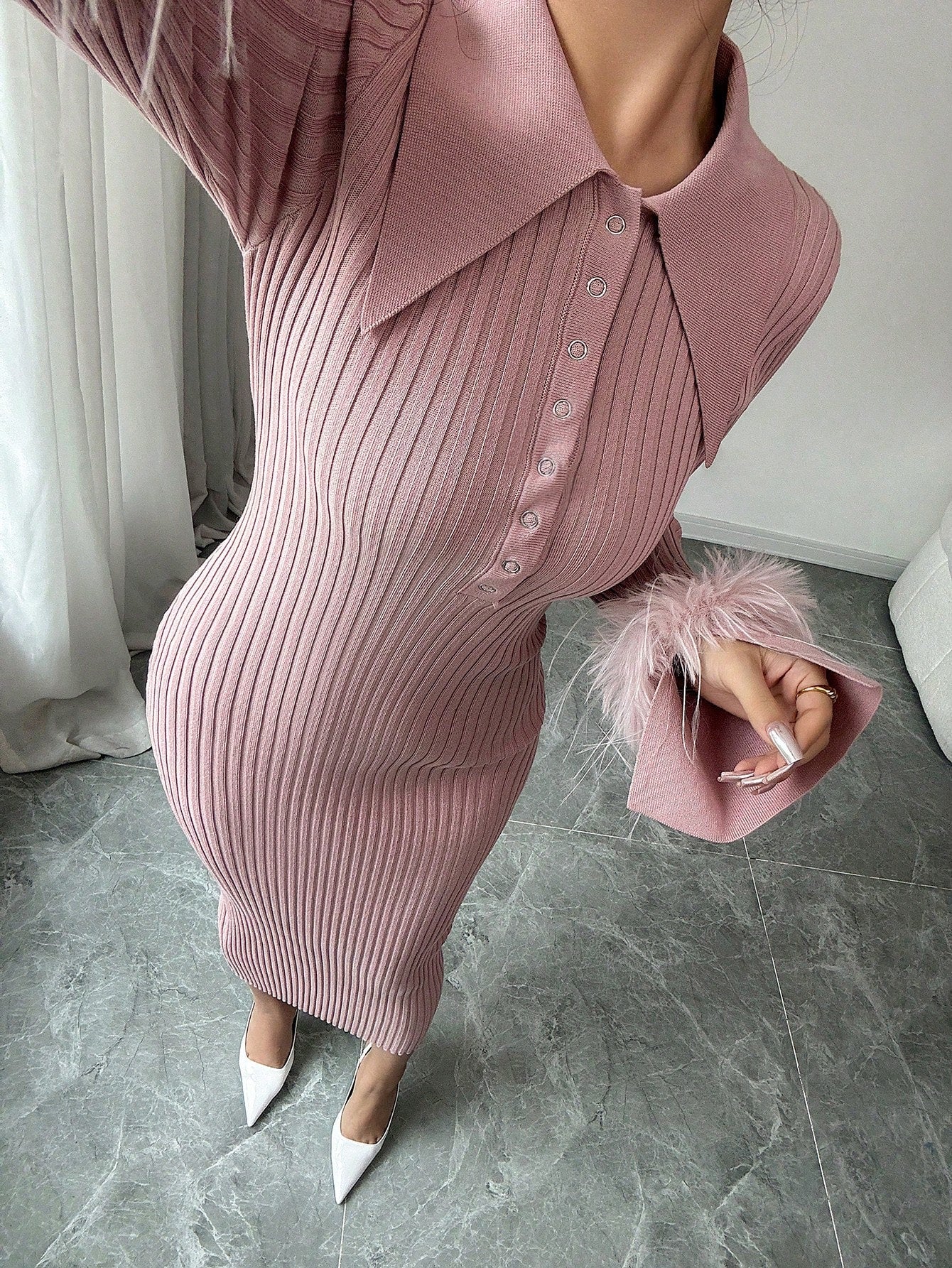 Chic & Cozy: Long Fitted Knit Dress with Fuzzy Cuff Accents