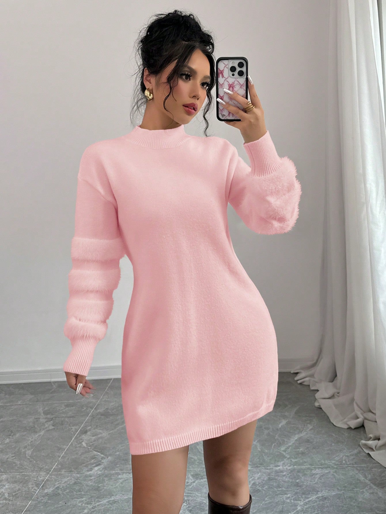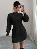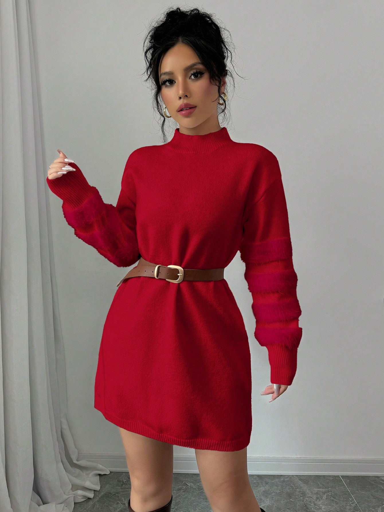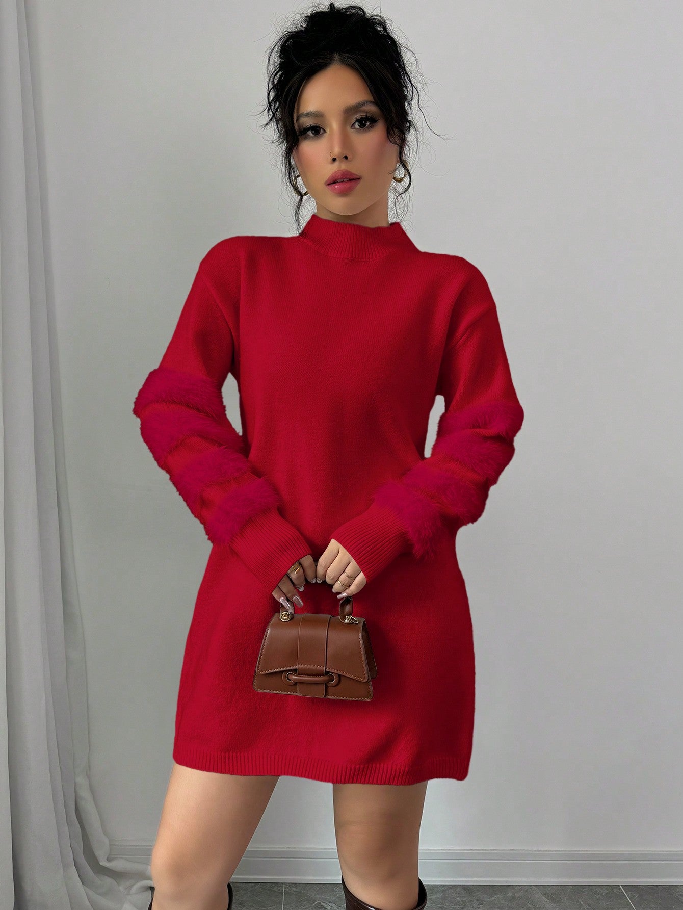 Chic & Cozy: Solid Color Bodycon Sweater Dress with Faux Fur Trim