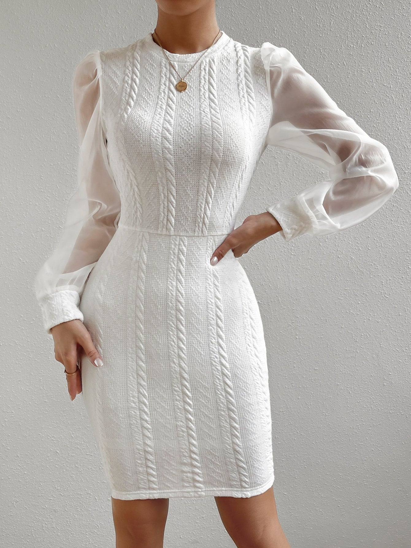 Enhance your elegant style with our Chic Elegance: Contrast Mesh Lantern Sleeve Bodycon Dress. The contrast mesh detailing on the lantern sleeves adds a touch of sophistication to this figure-flattering bodycon dress. Perfect for any occasion, this dress exudes chic confidence.