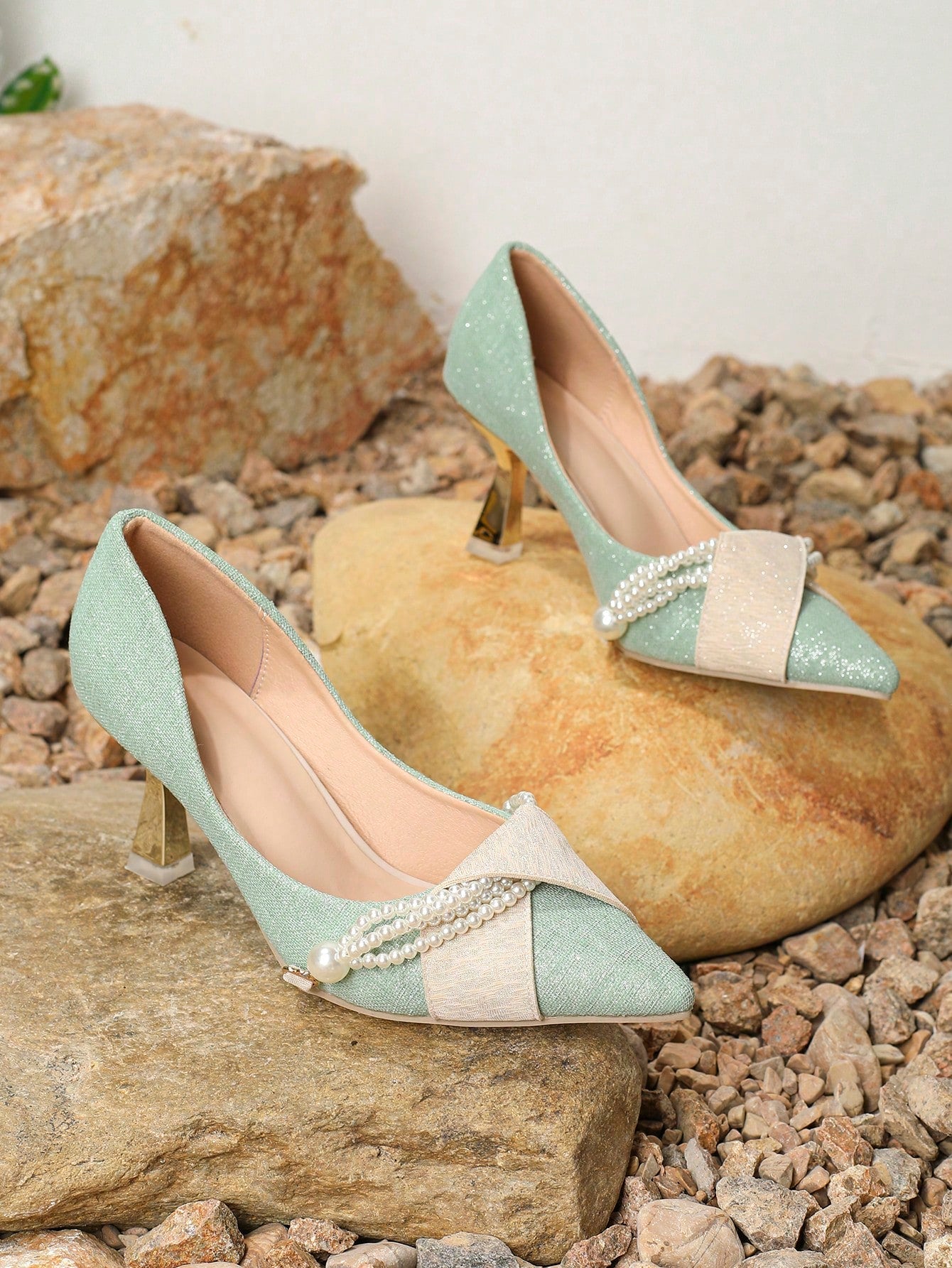 Chic Elegance: High-Heeled Women’s Shoes with Faux Pearl Chain Detail
