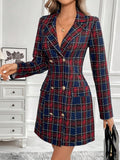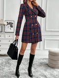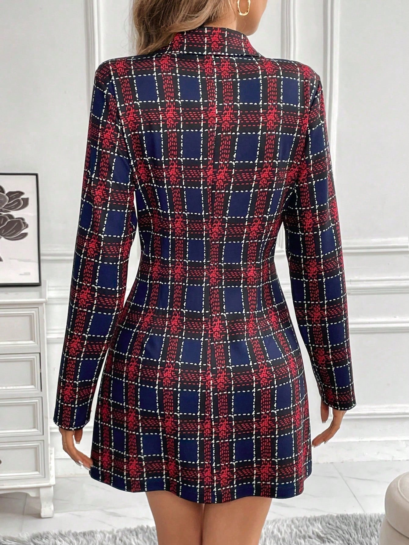 Chic & Elegant Plaid Print Double-Breasted Dress with Notched Collar for Spring and Fall