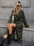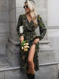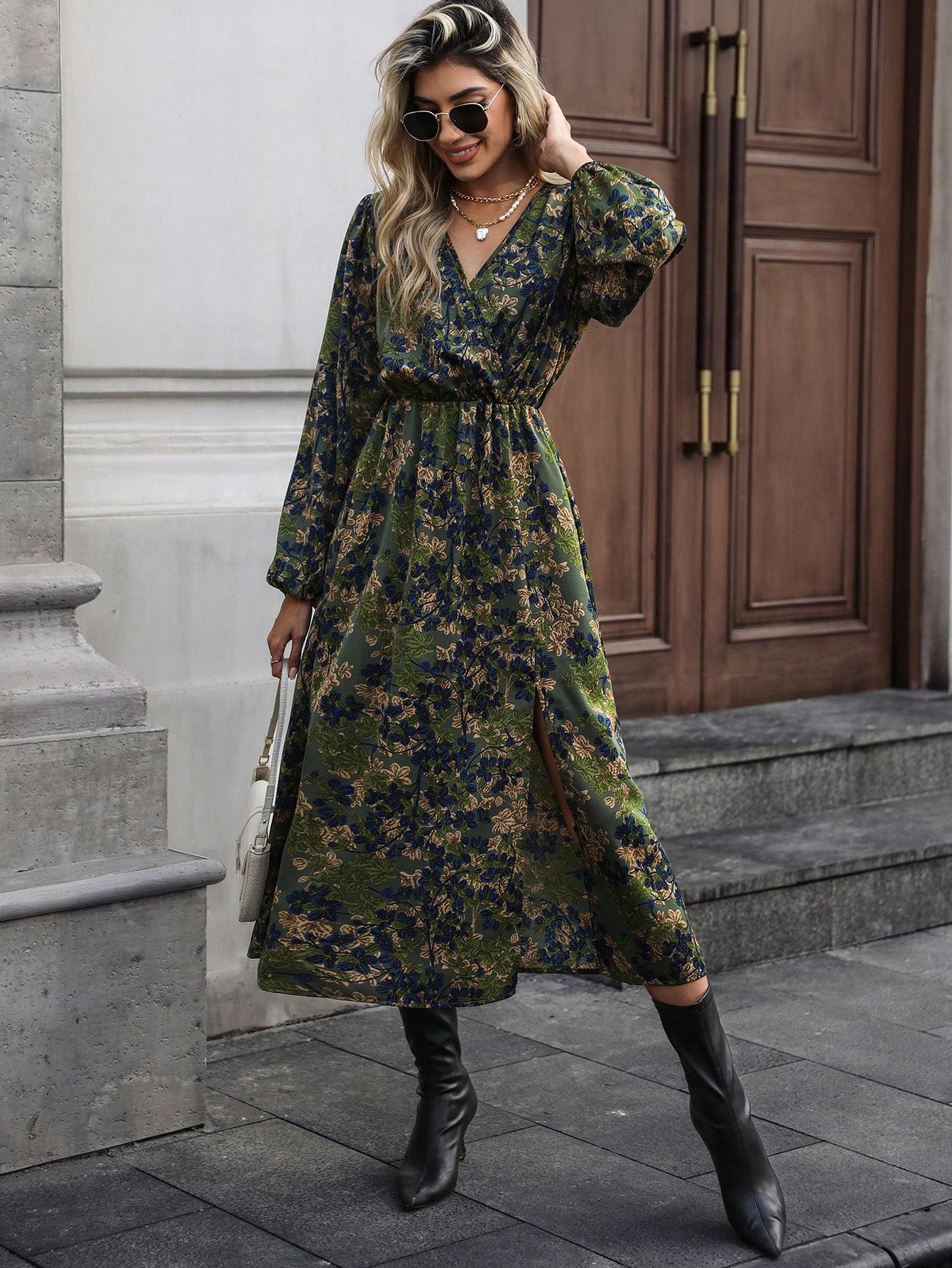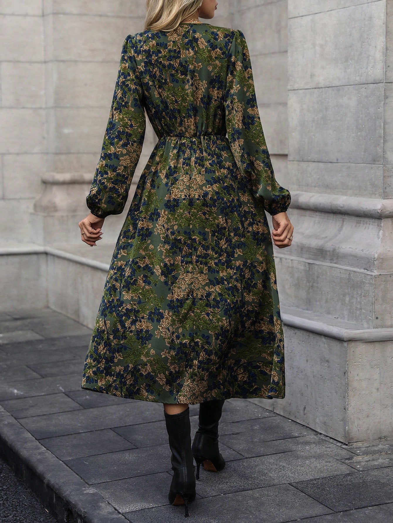Chic Fall Floral Maxi Dress with V-Neck and Lantern Sleeves