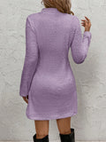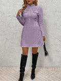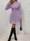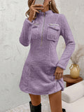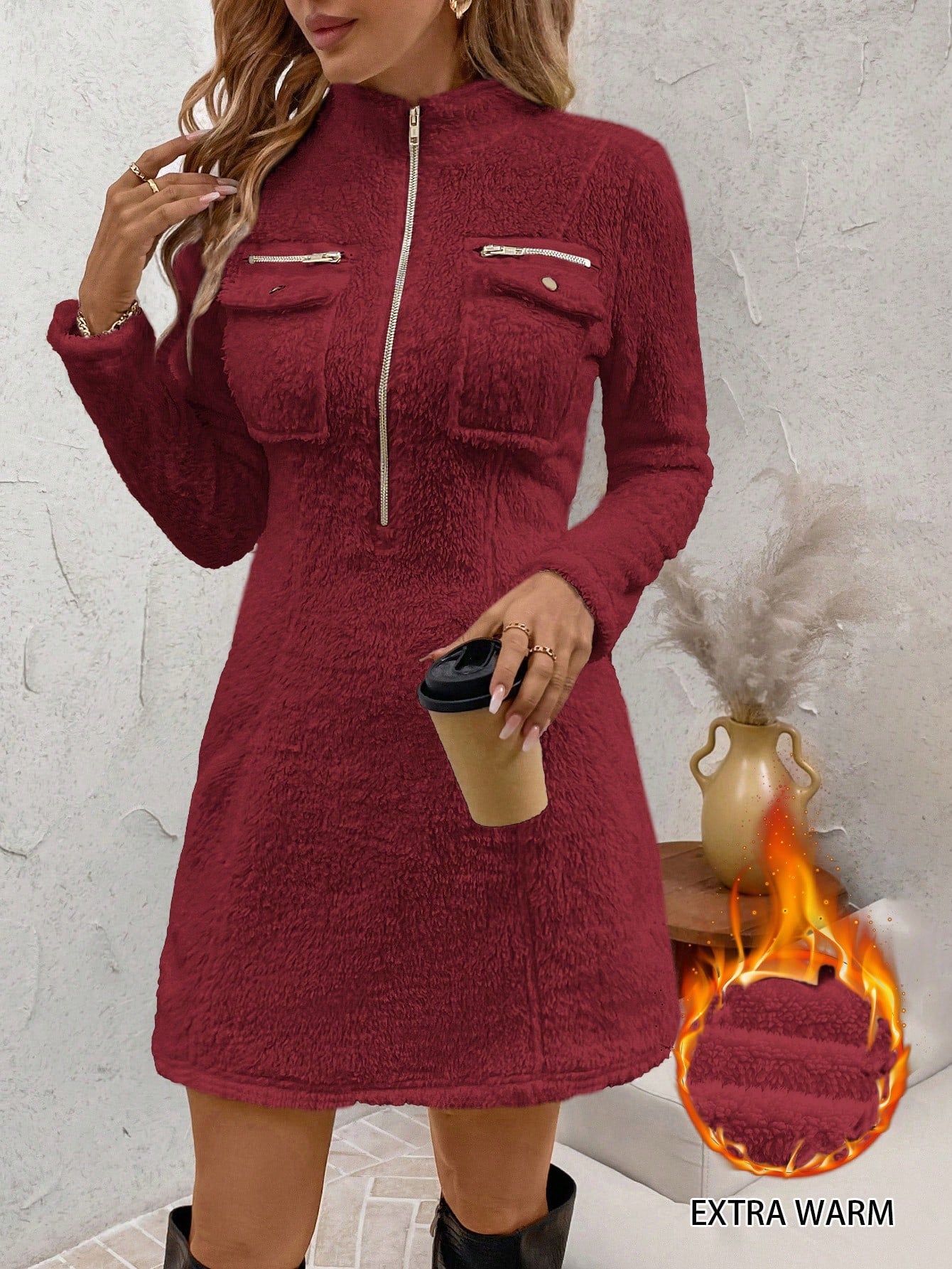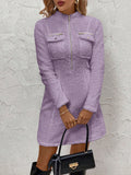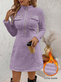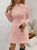 Chic Fleece Mini Dress with Stand Collar & Zipper Pockets - Perfect for Autumn/Winter Style