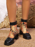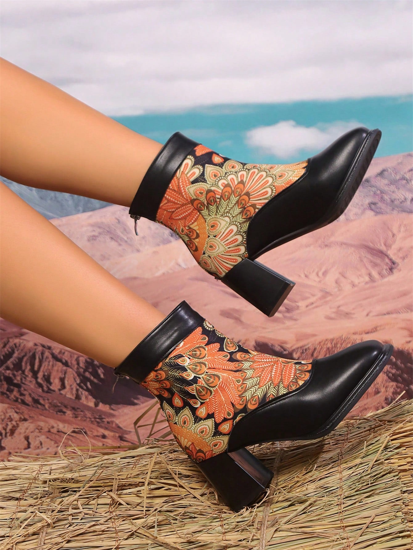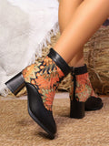 Chic Flock Embroidered Chunky Heel Boots for Stylish Autumn-Winter Looks