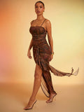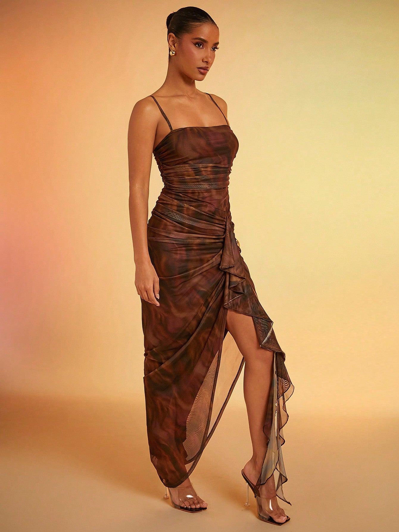 Chic & Flowy: Abstract Printed Mesh Ruffle Maxi Cami Dress