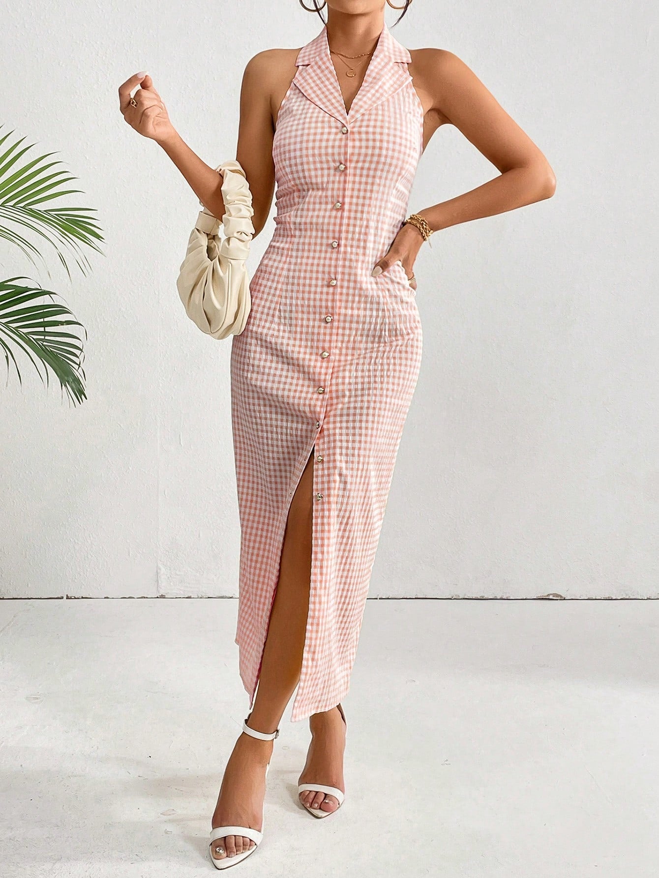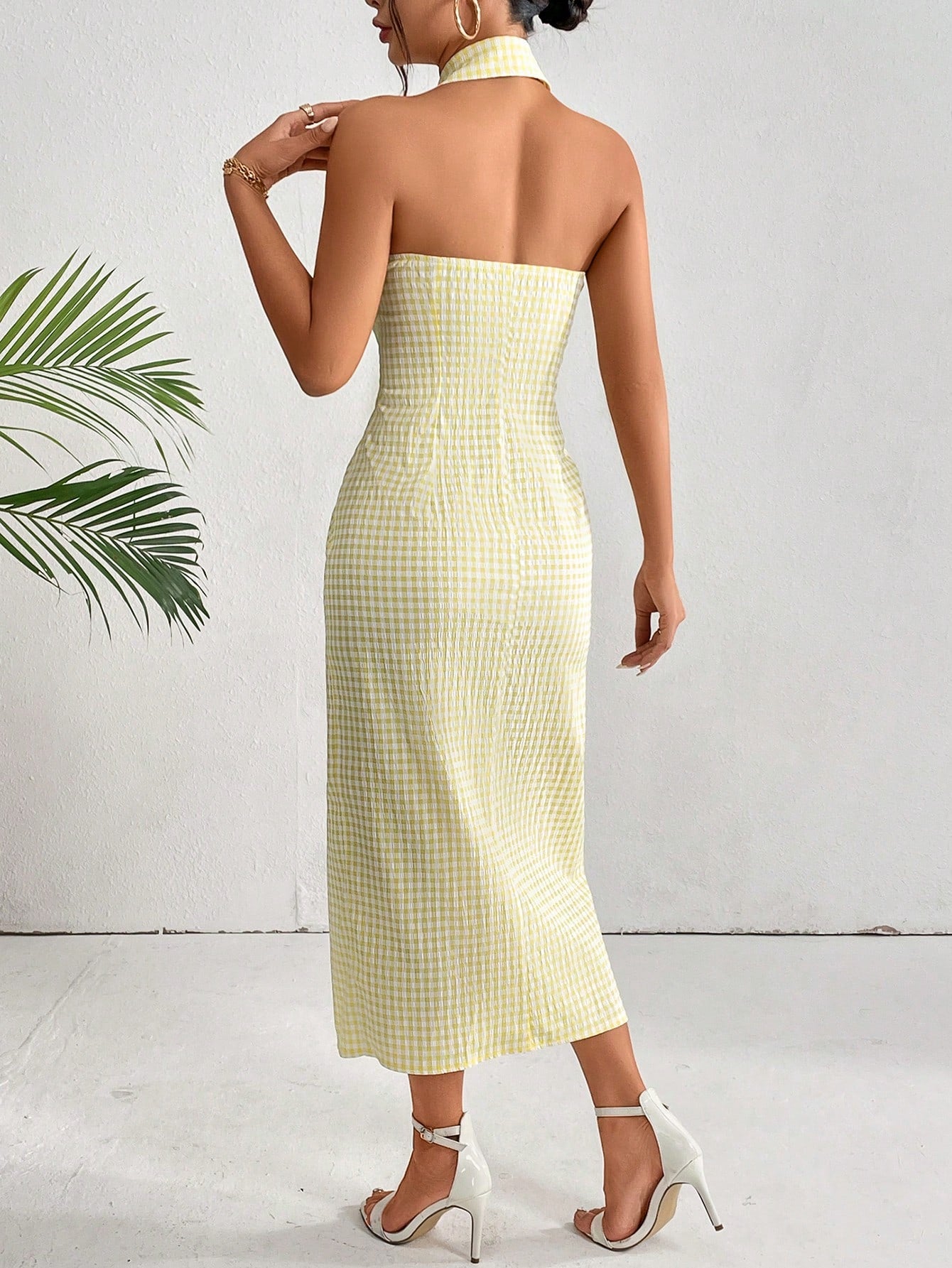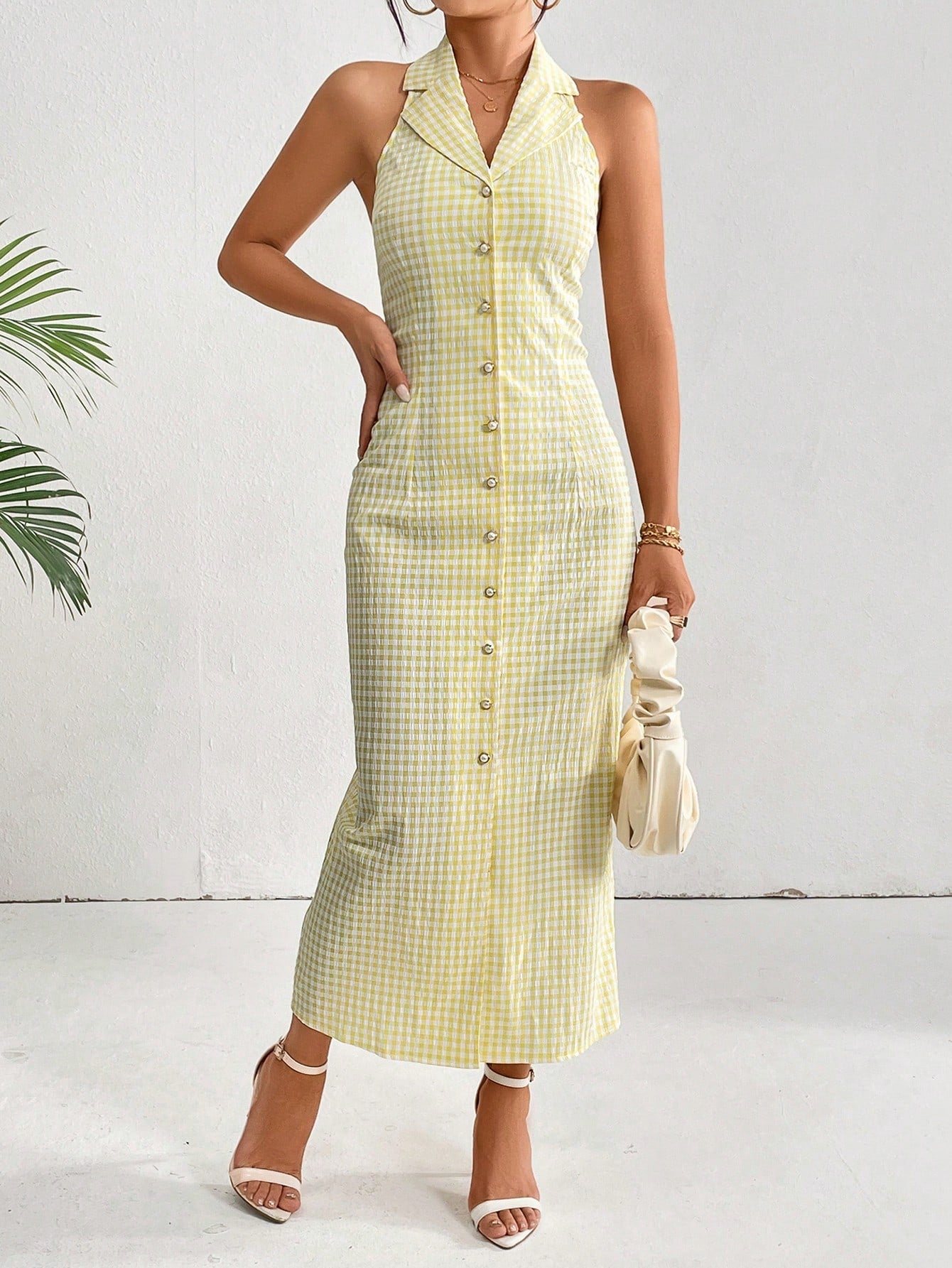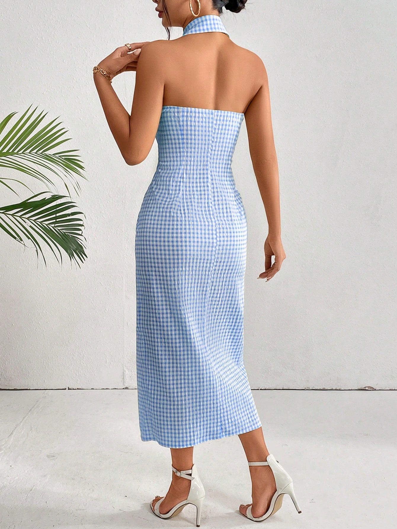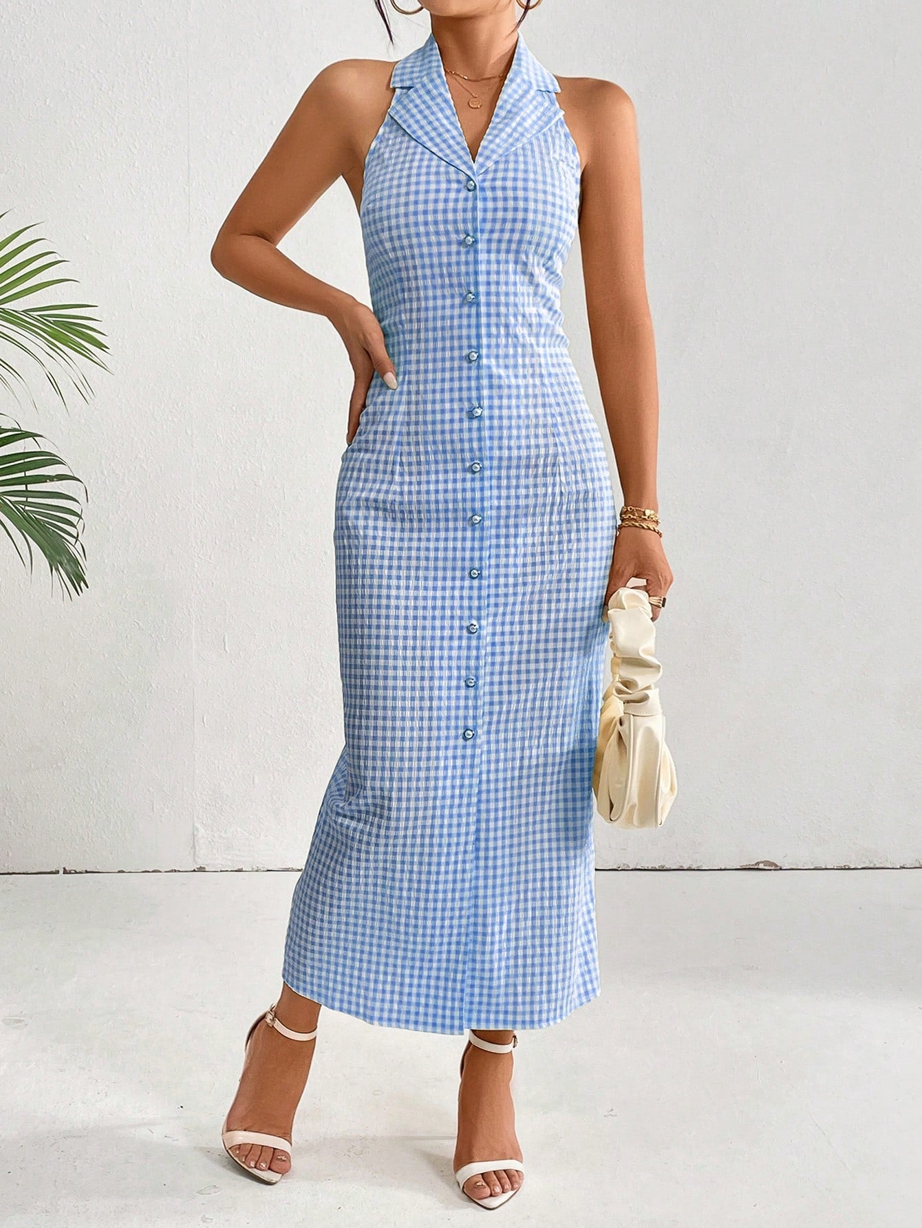 This chic plaid dress features a flattering halter neck and A-line silhouette for a stylish and comfortable fit. Perfect for any occasion, this dress is a must-have addition to your wardrobe. With its classic plaid pattern, it offers a timeless and versatile look that can be dressed up or down. Elevate your fashion game with this must-have piece.