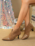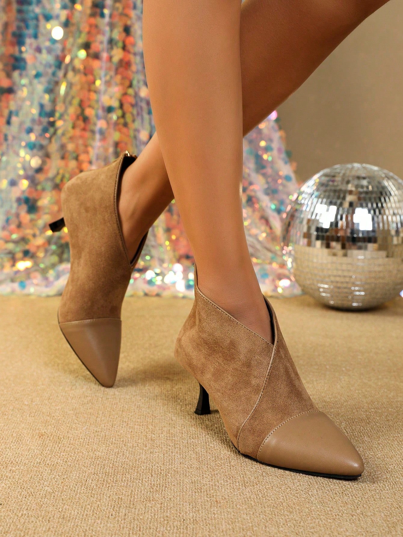 Chic Khaki Faux Suede & Leather Ankle Boots with Pointed Toe and Back Zipper