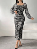 Chic Leopard Print Bodycon Dress with Lantern Sleeves and Square Neck