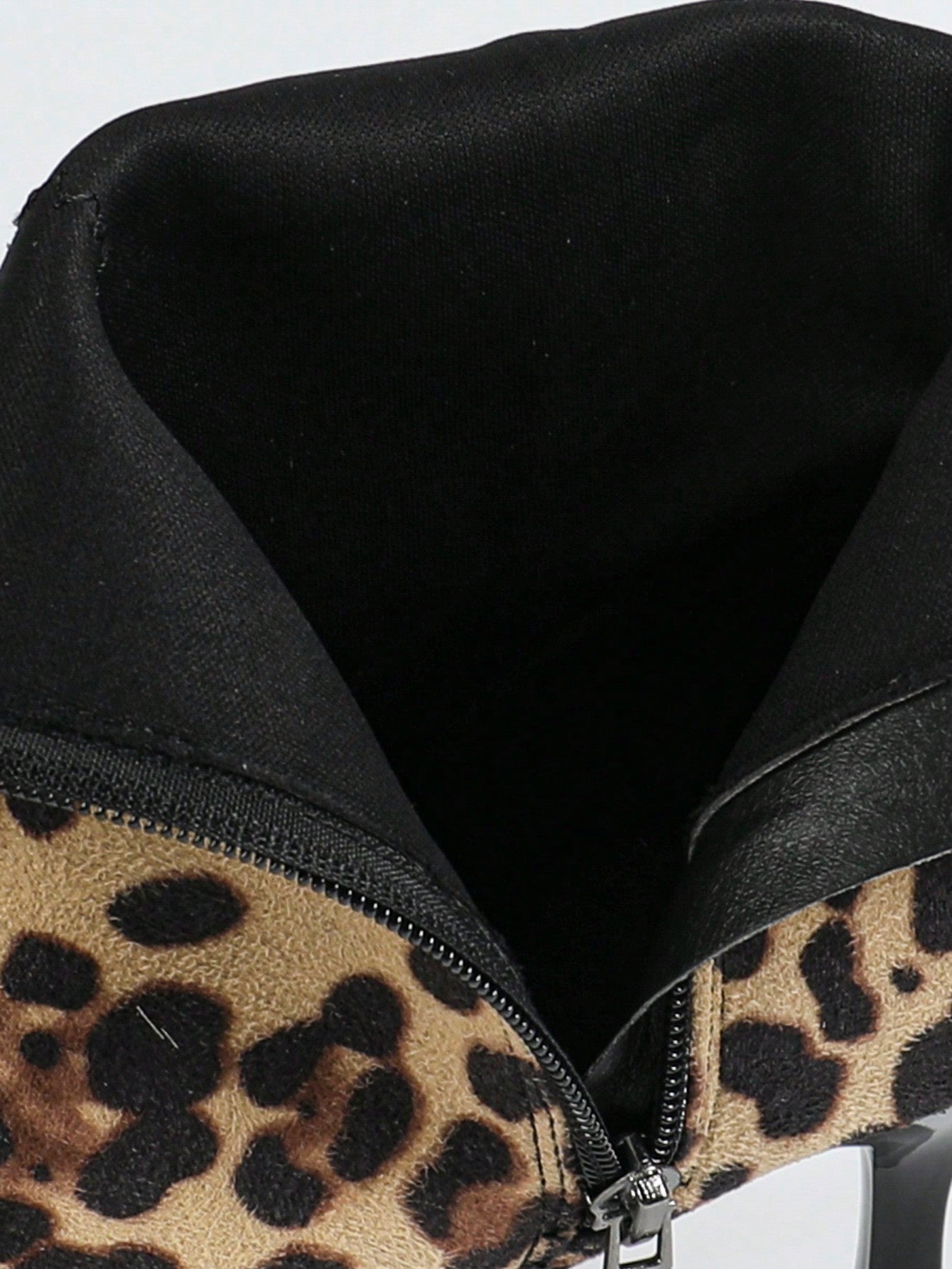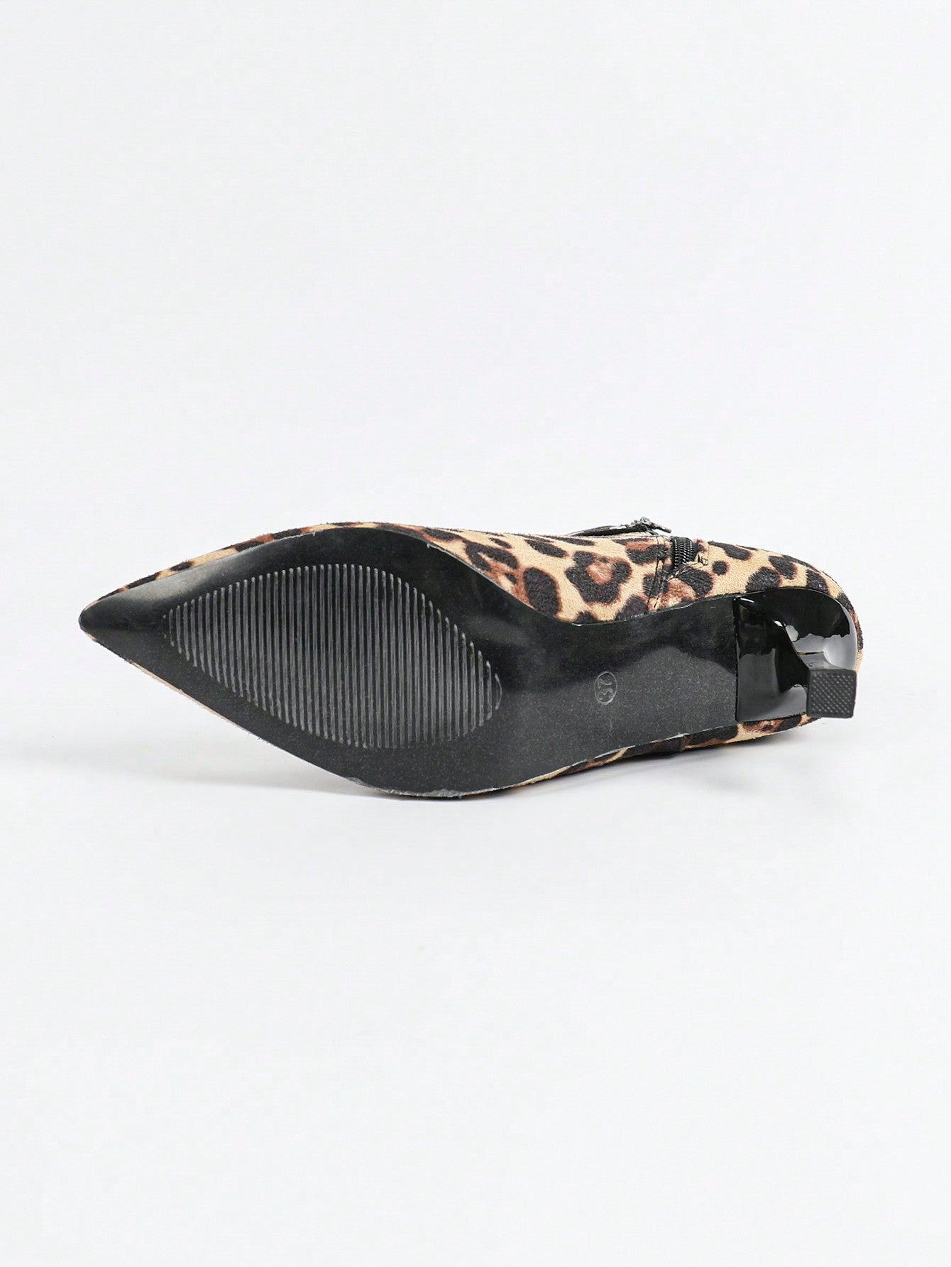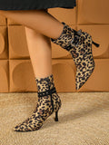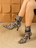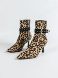 Chic Leopard Print Pointed Toe High Heel Boots with Stylish Metal Buckle - Elevate Your Look