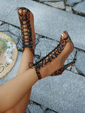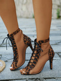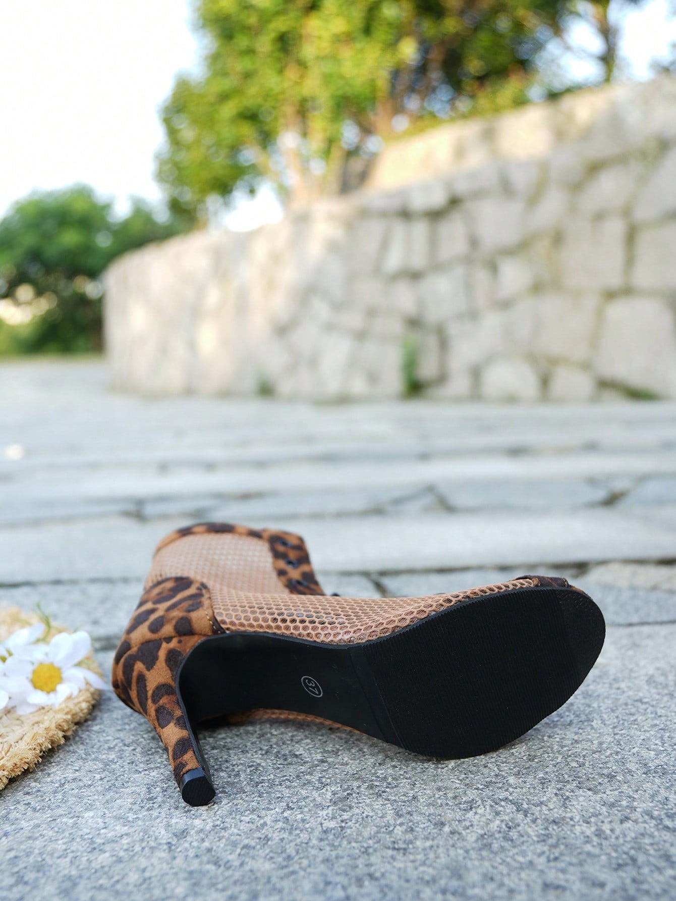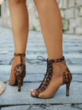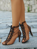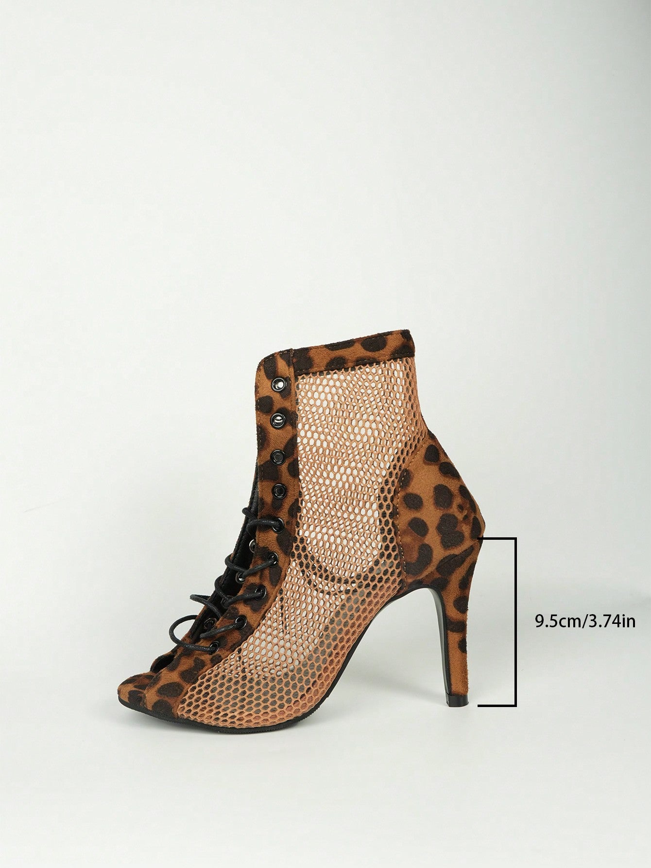 Chic Leopard Print Velvet High-Heel Ankle Boots - Breathable Lace-Up Design