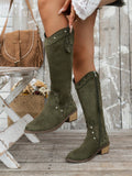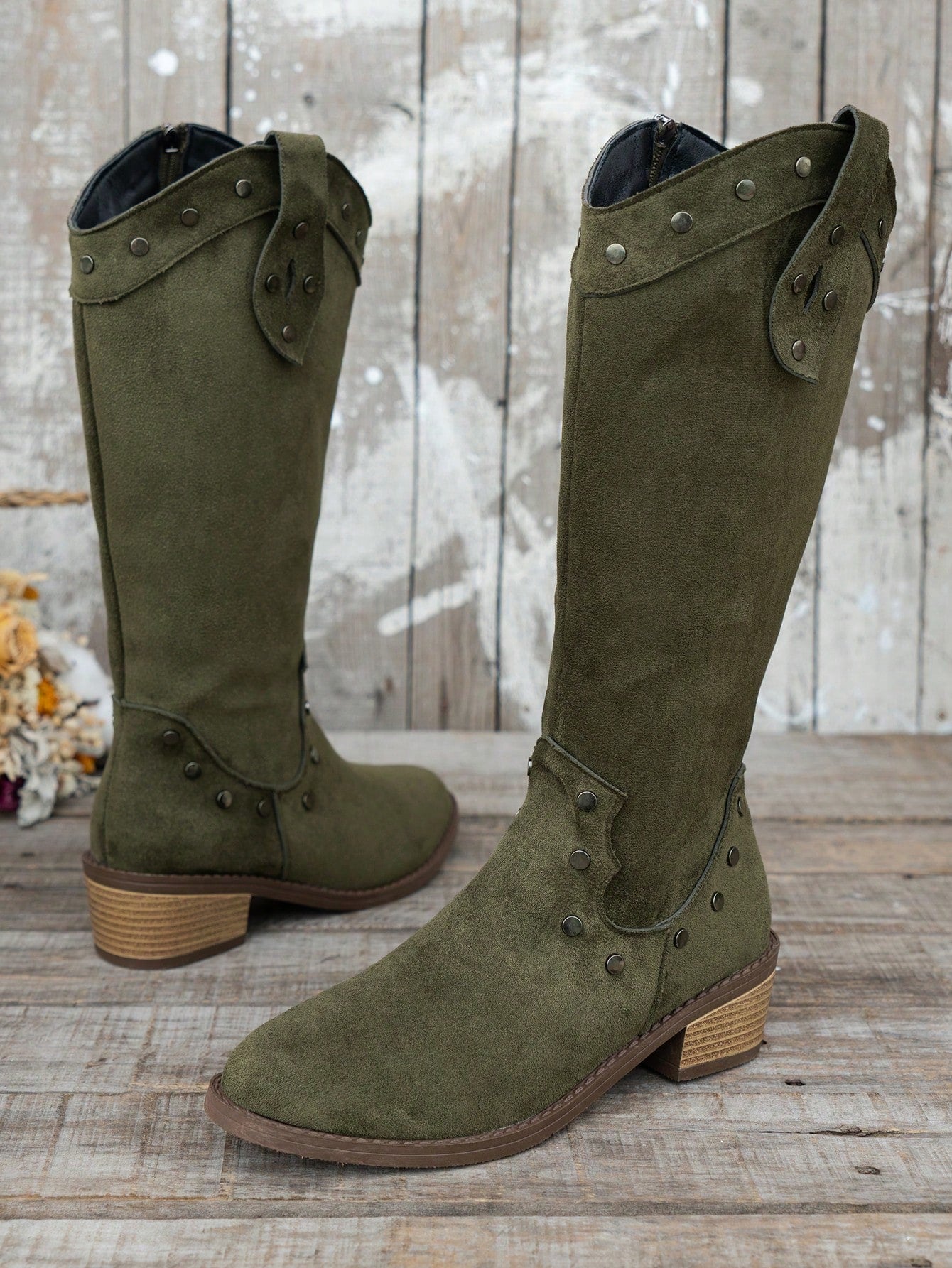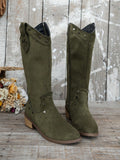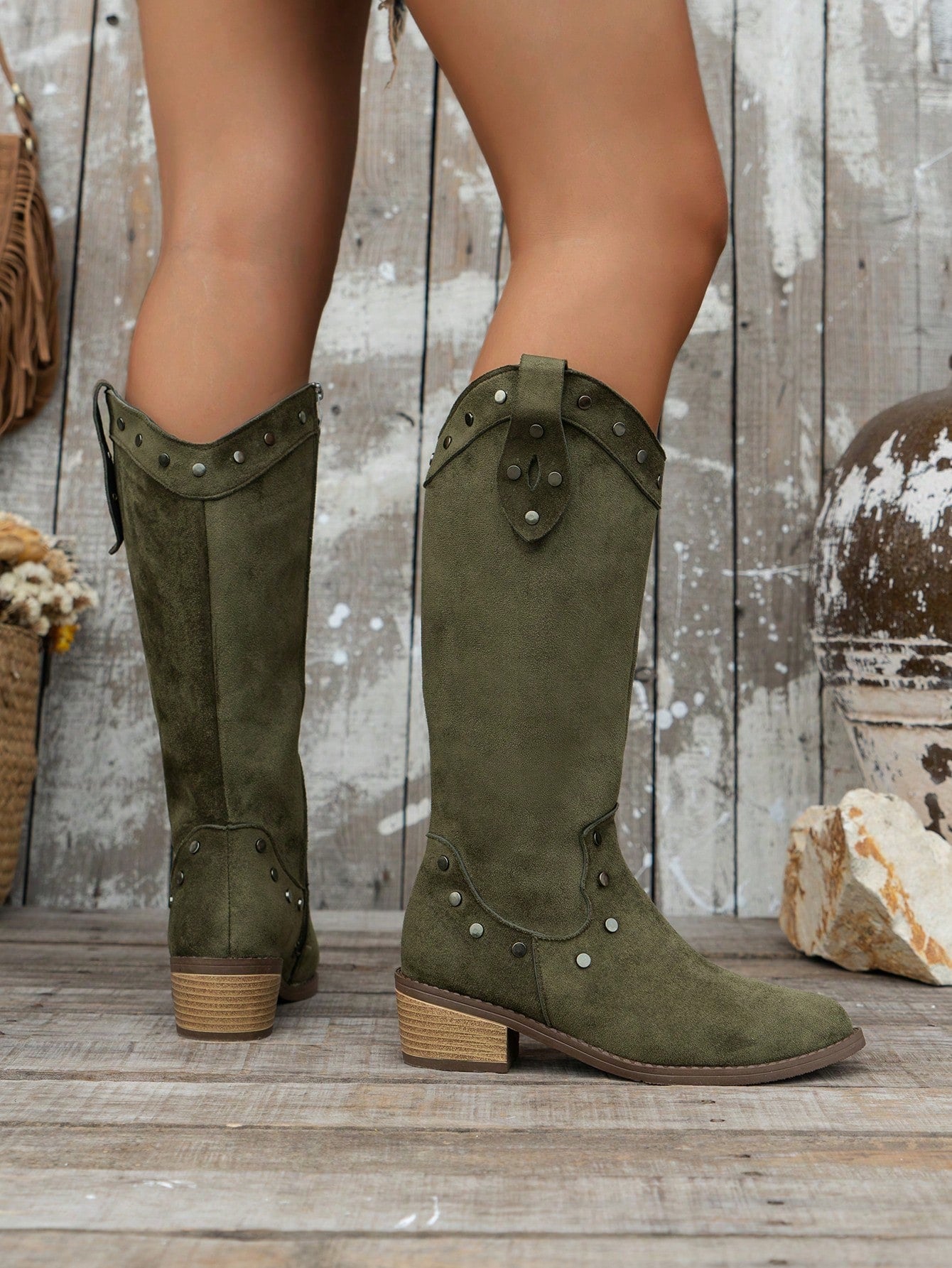 Chic Olive Green Studded Knee-High Western Cowboy Boots for Stylish Fall & Winter Looks