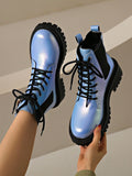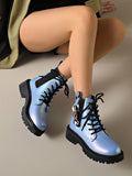 Chic Ombre Blue Leather Ankle Boots with Thick Sole - Trendy Motorcycle Style for Autumn/Winter