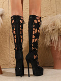 Chic Over-the-Knee Waterproof Platform Boots with Cut-Out Laser Design & Tied Straps