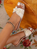 Chic Pearl Bowknot Slides: Lightweight White Sandals with Metal Decoration