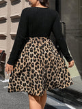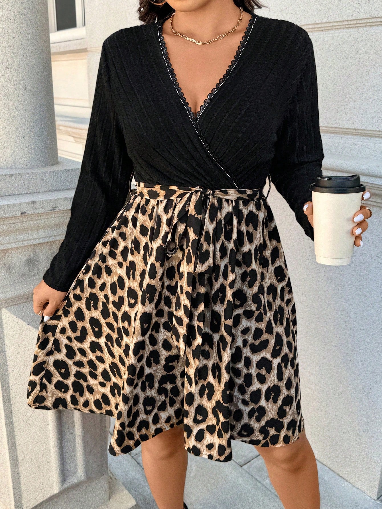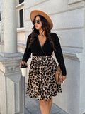 Chic Plus Size Leopard Patchwork Dress - Elegant Long Sleeve Style