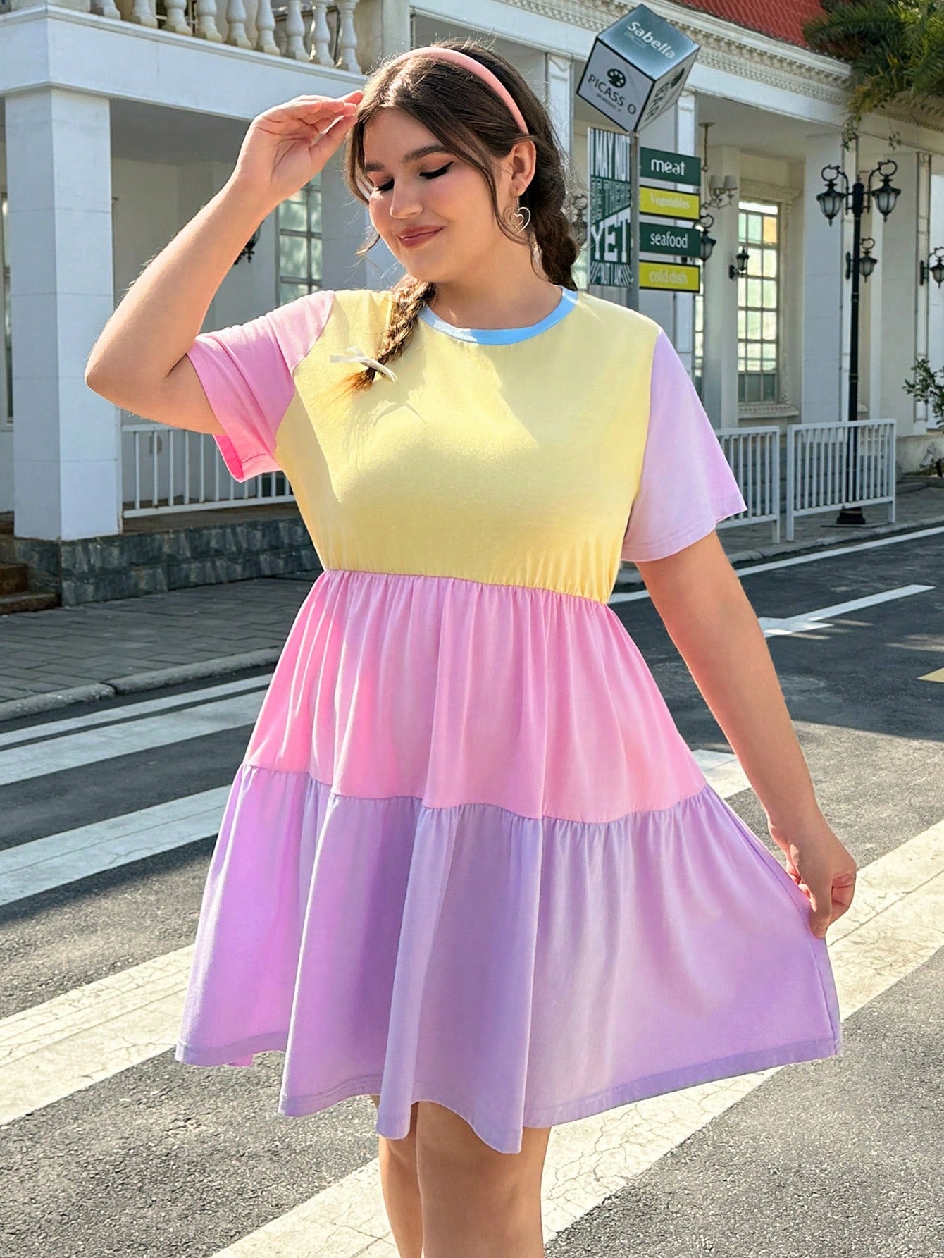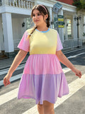 Chic Plus Size Pastel Color Block Dress with Cinched Waist