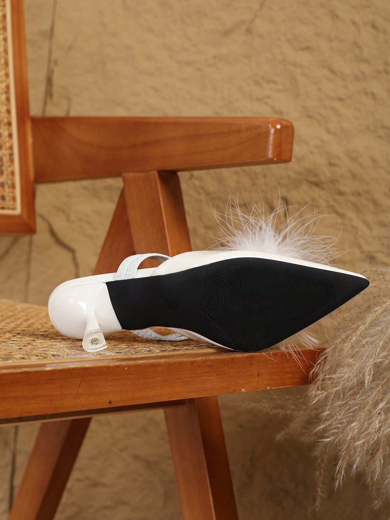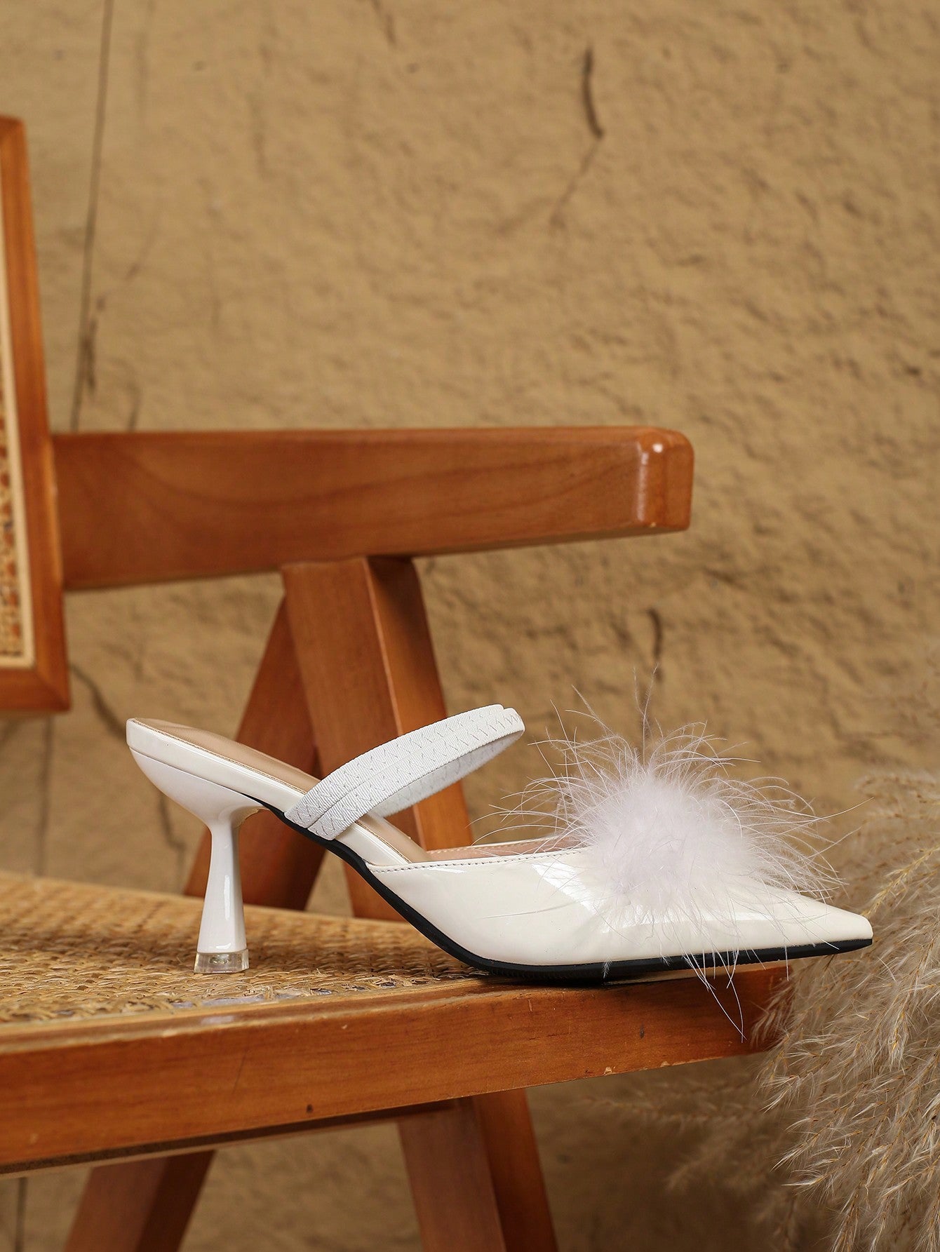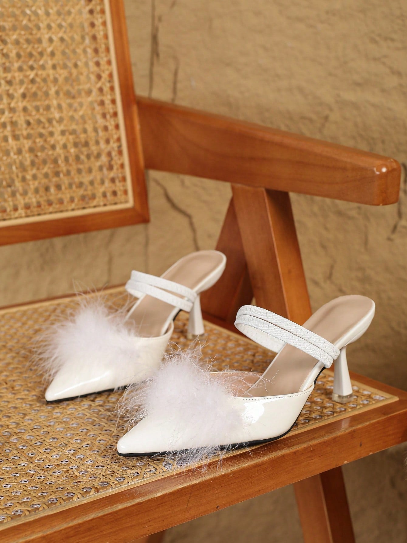 Chic Pointed-Toe High Heel Mule Slippers with Furry Accent - Elegant Patent Leather Design