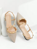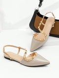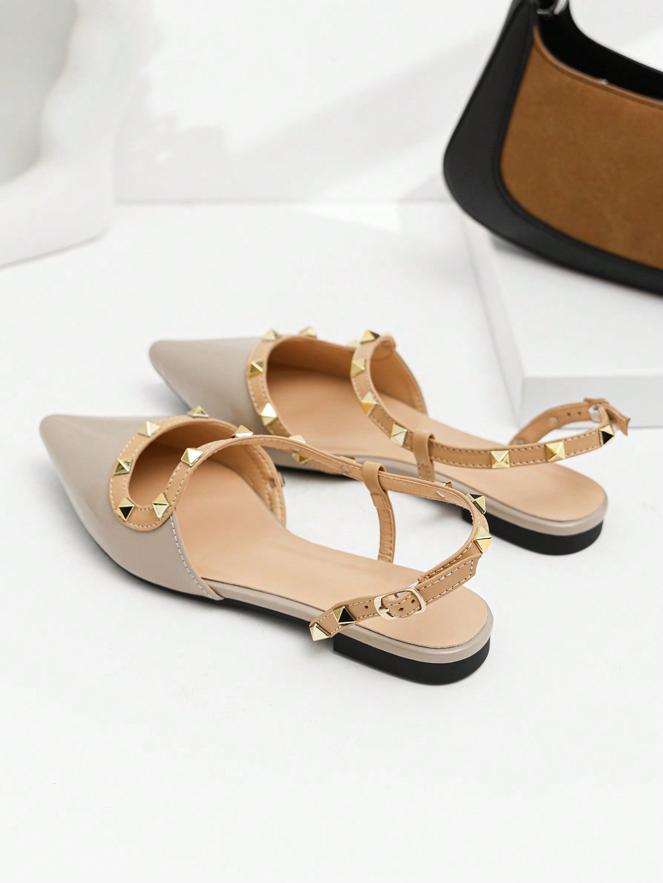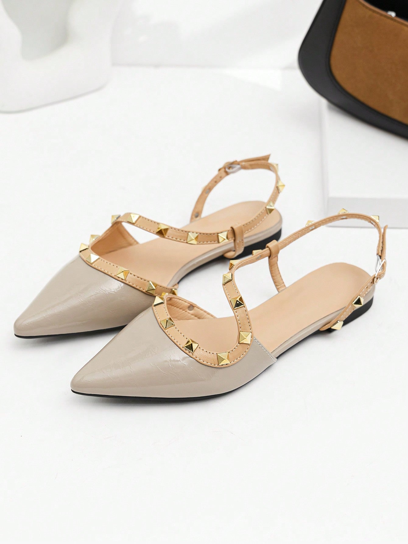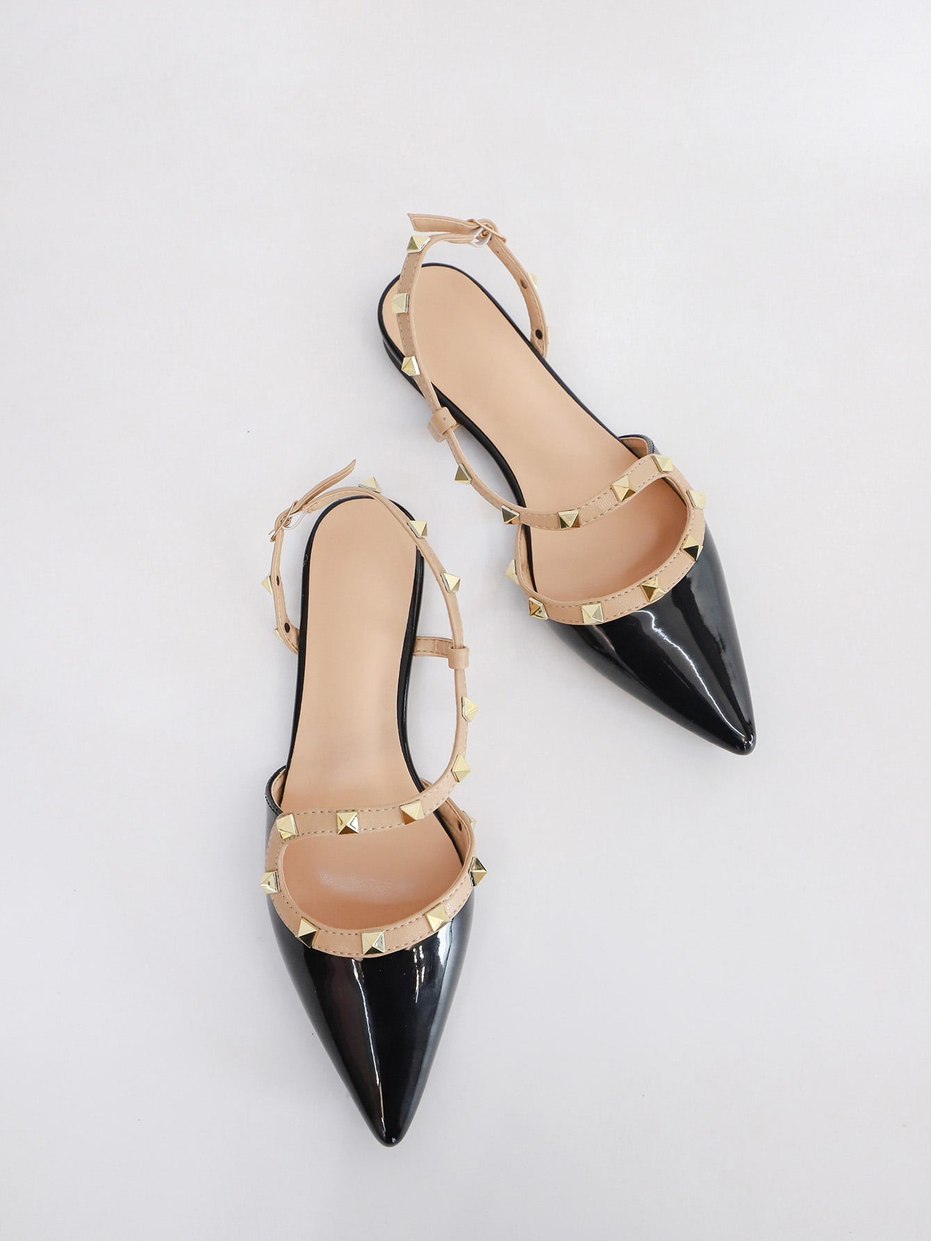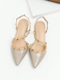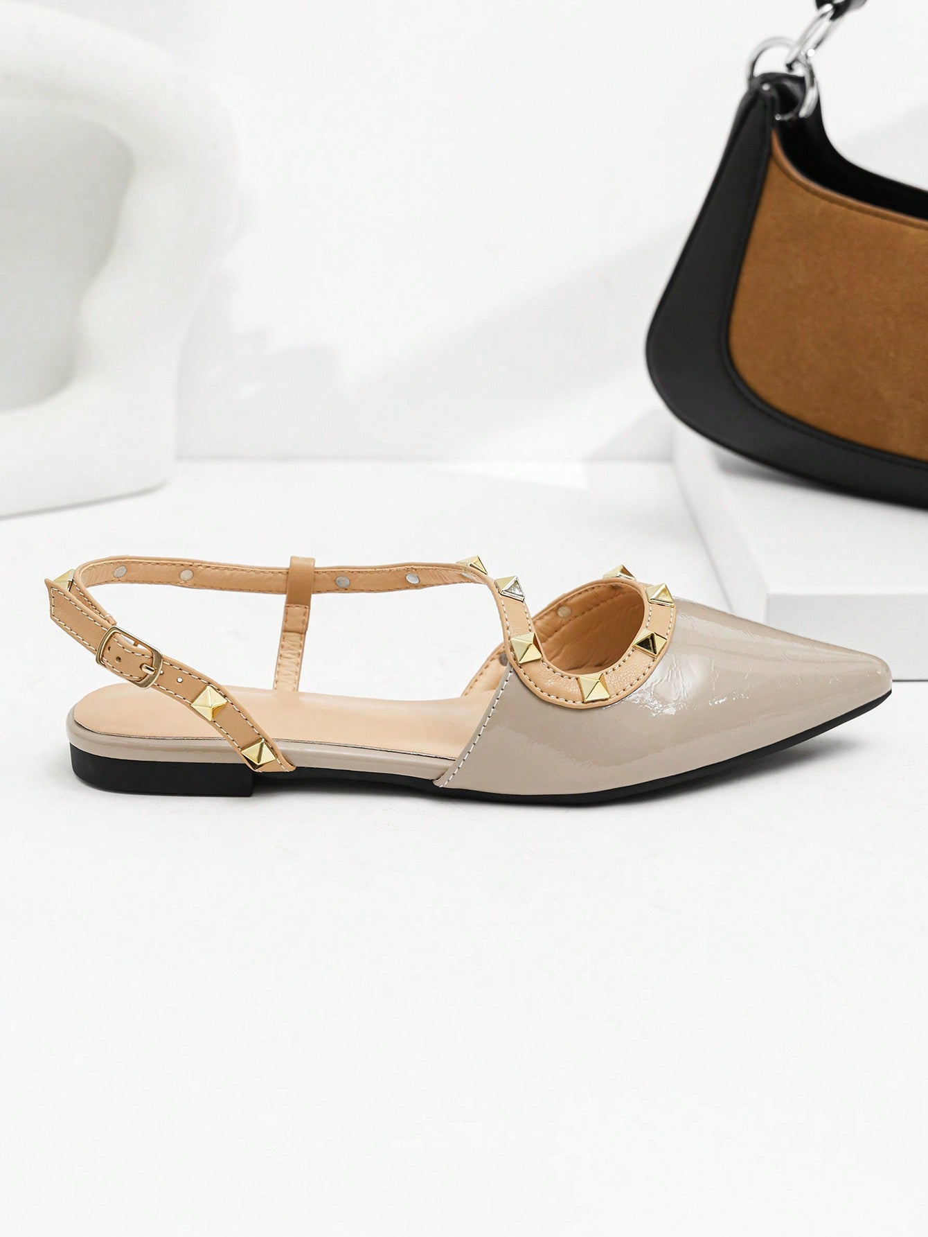 Chic Pointed-Toe Patent Leather Flat Sandals with Rivet Detailing and Buckle Strap