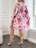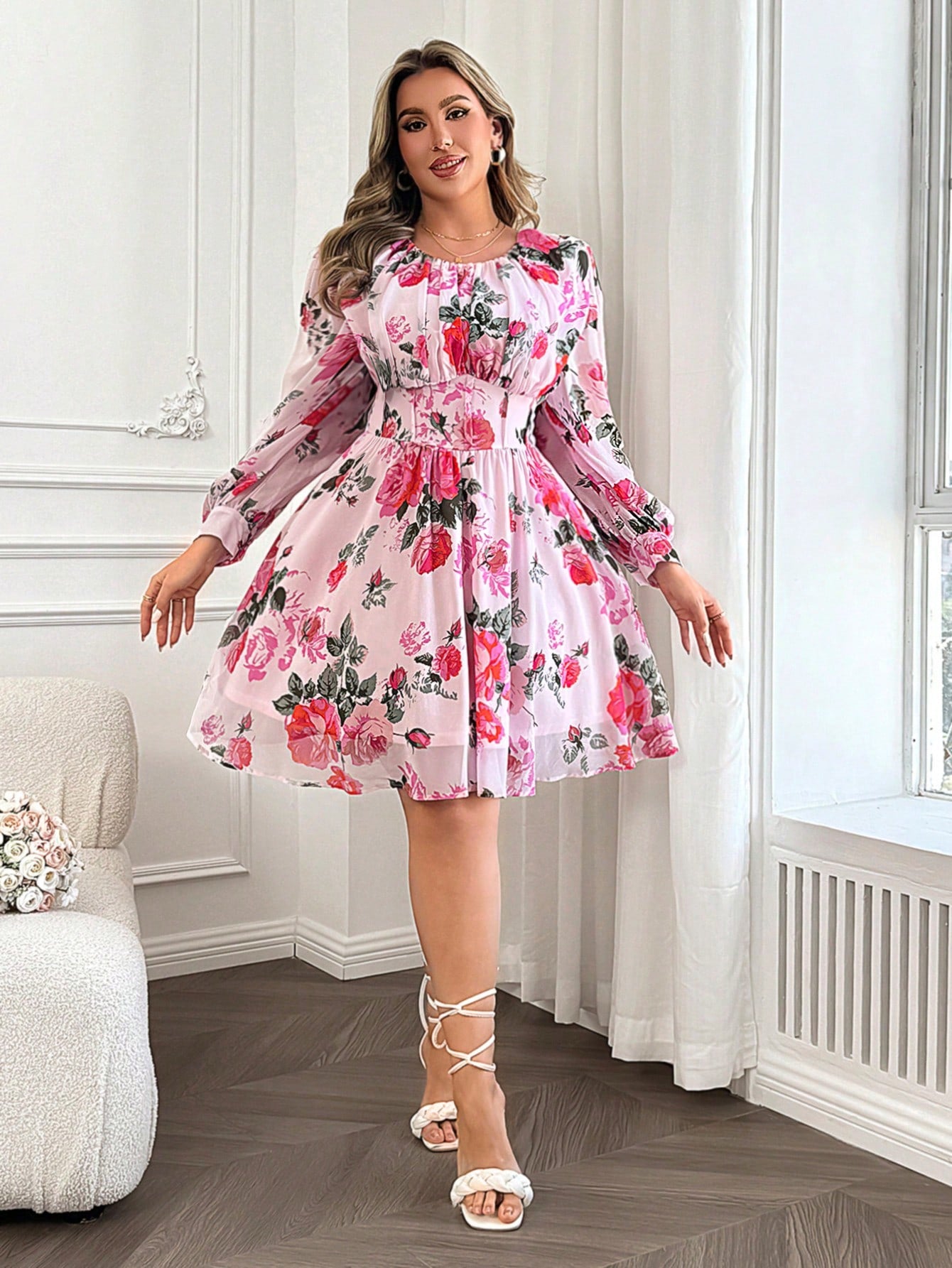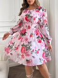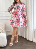 Chic Rose Print Ruched Waist Lantern Sleeve Dress for Plus Sizes - Perfect for Casual Dates and Spring Vacations