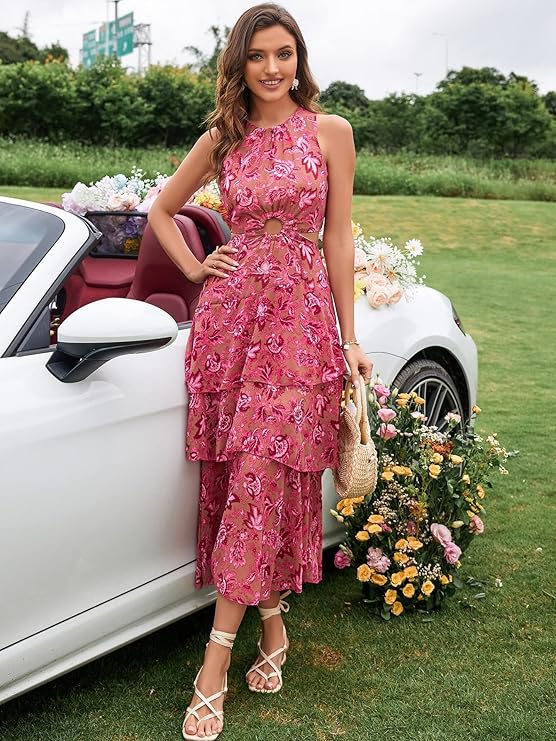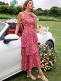 Chic Rosie Floral Chiffon Dress with Ring Linked Cut-Out and Layered Hem