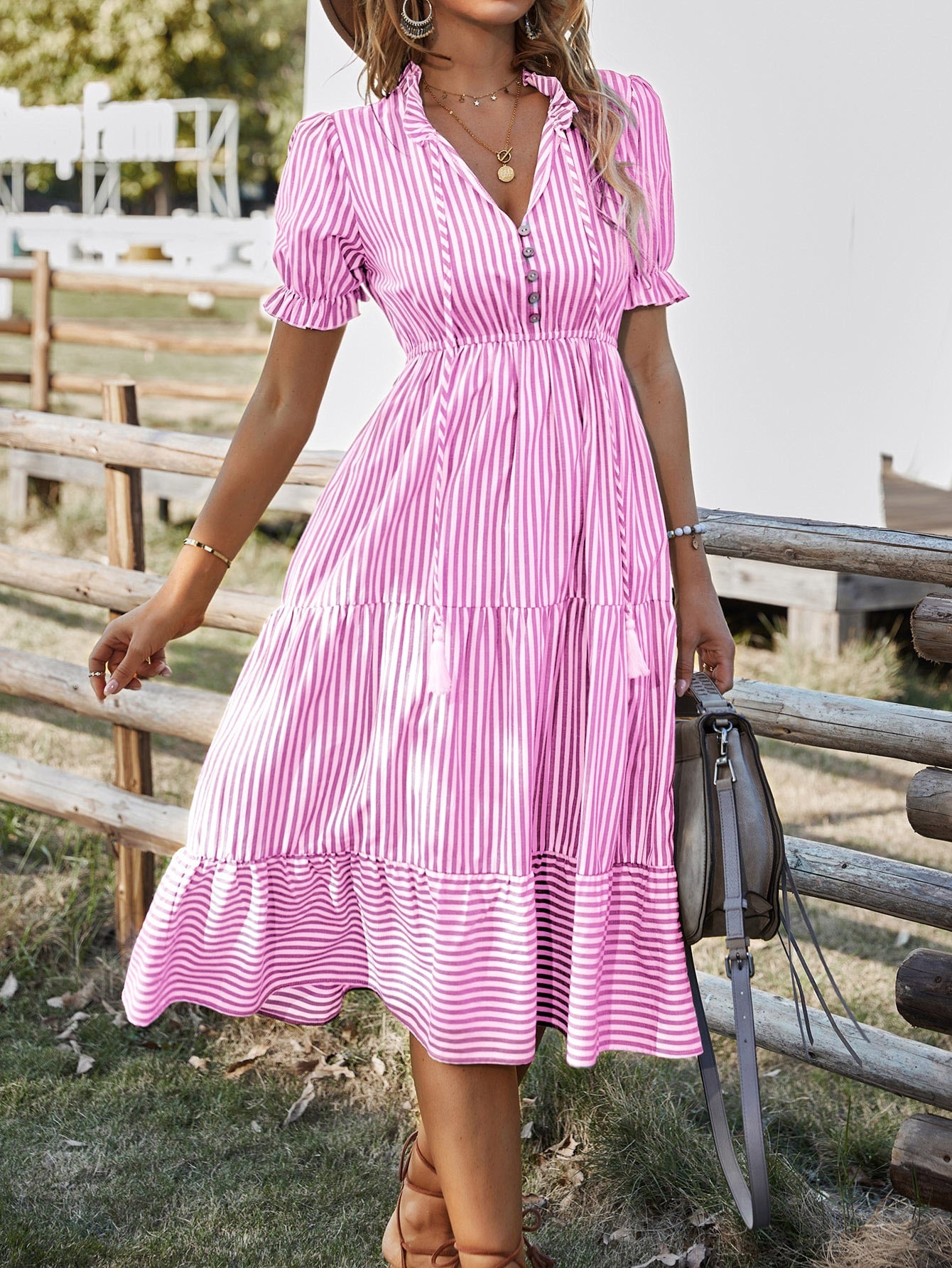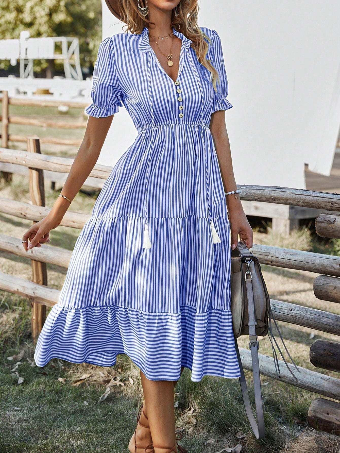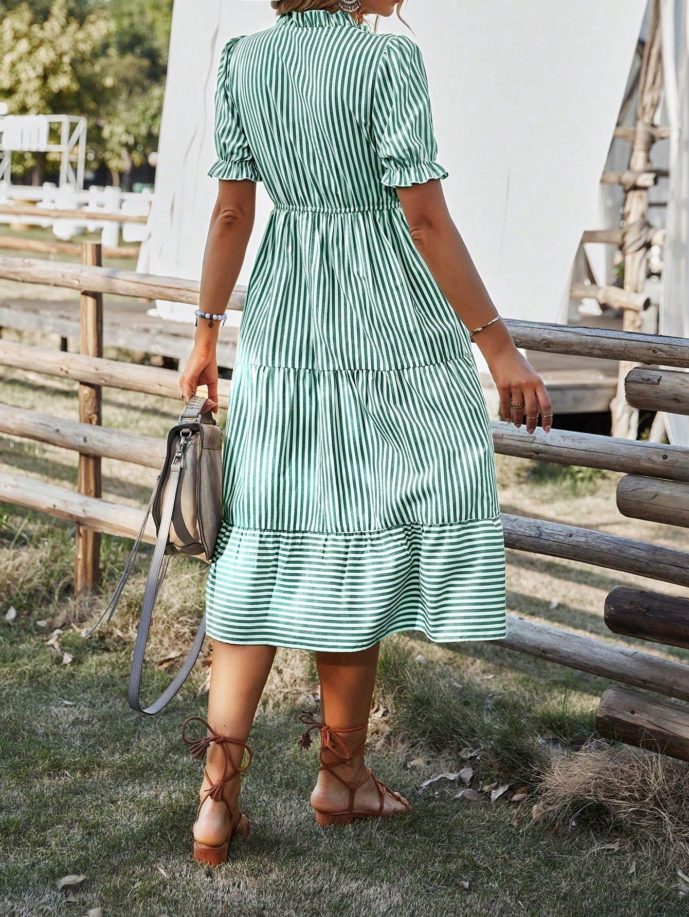 Chic & Sophisticated: Striped Print Puff Sleeve Ruffle Hem Dress