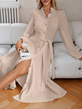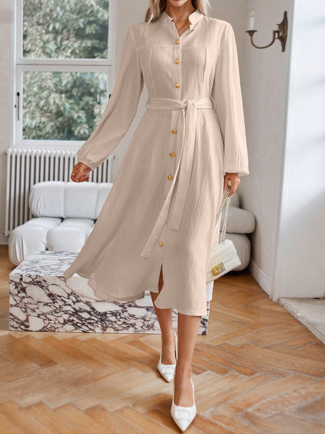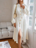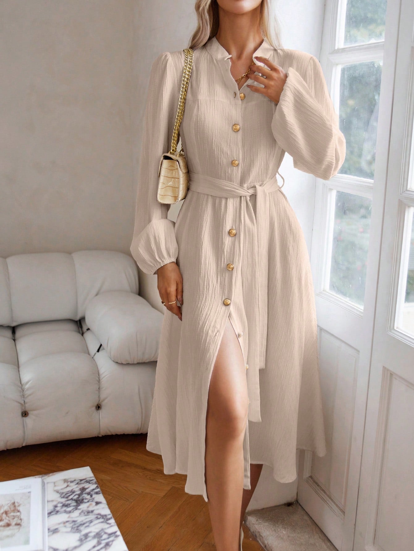 Chic Textured Button-Front Lantern Sleeve Dress - Perfect for Vacations!
