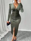 Chic Velvet Elegance: Deep V-Neck Ruched Dress with Bubble Sleeves