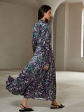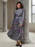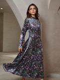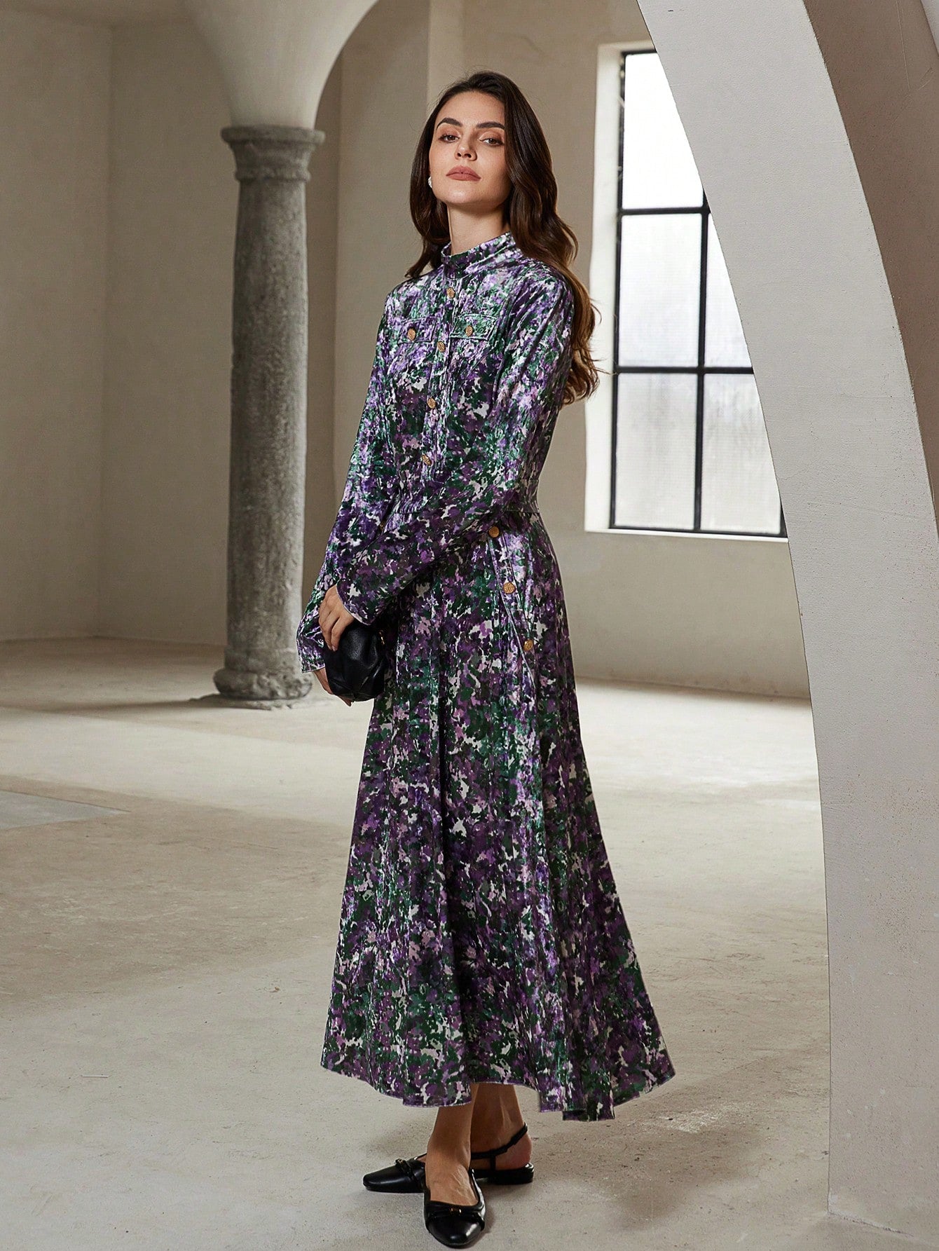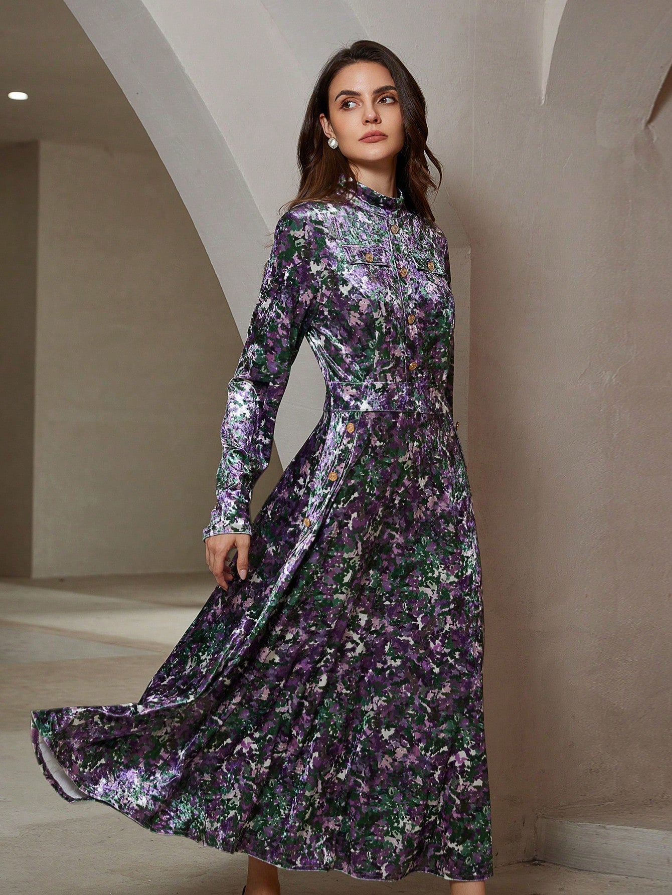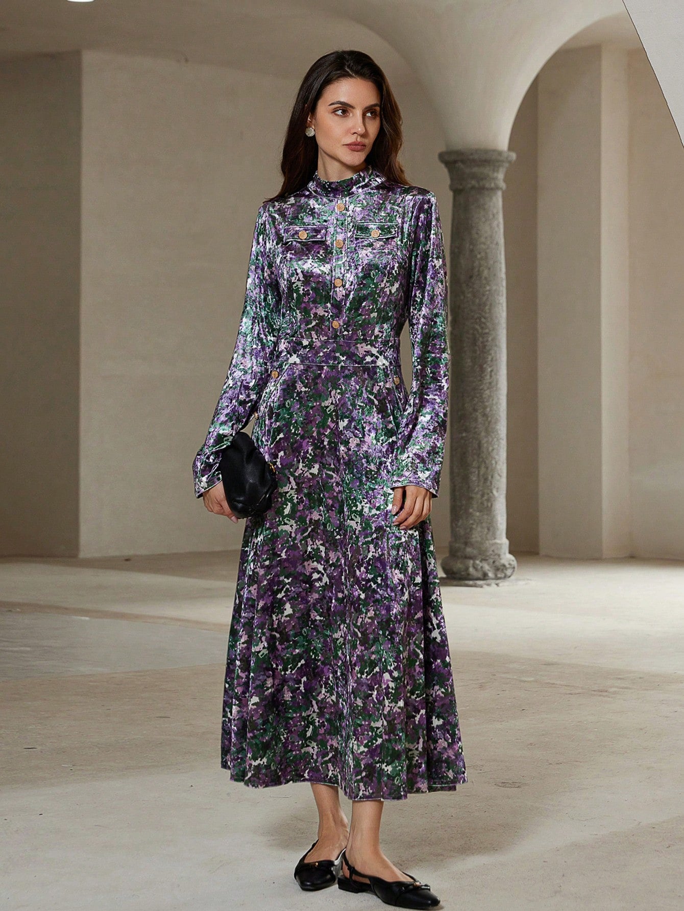 Chic Velvet Floral Print Dress with Stand Collar and Metal Buttons for Elegant Autumn Wear