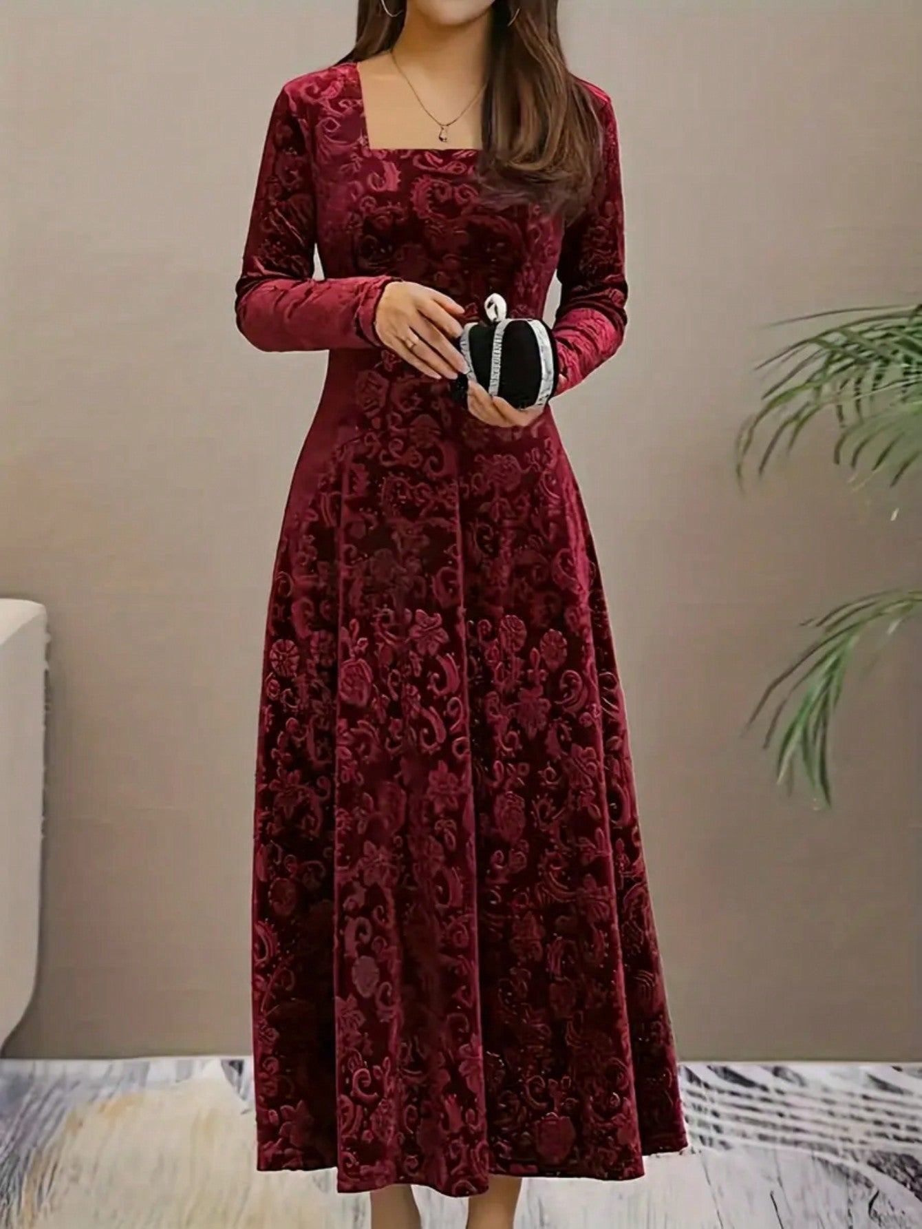 Chic Velvet Floral Swing Dress with Square Neckline - Perfect for Fall