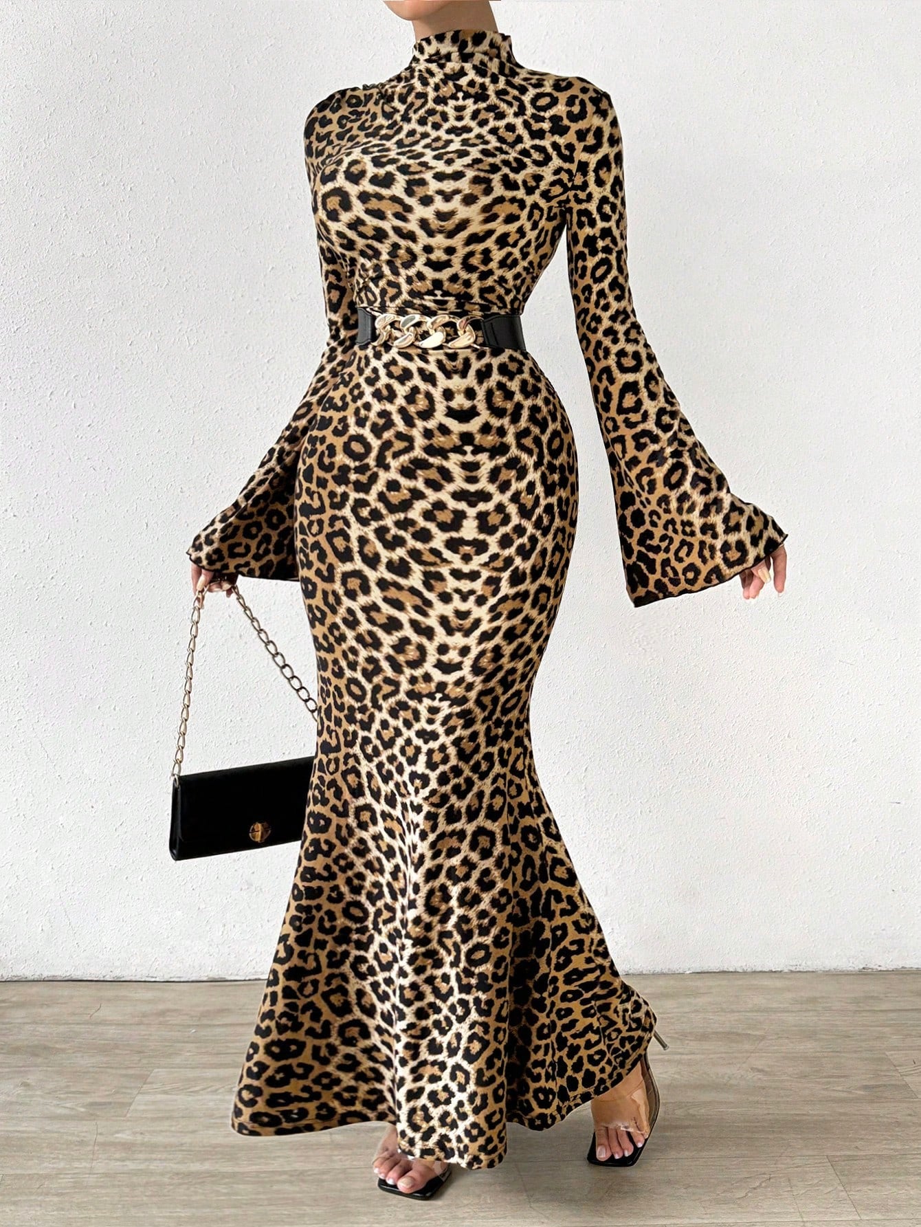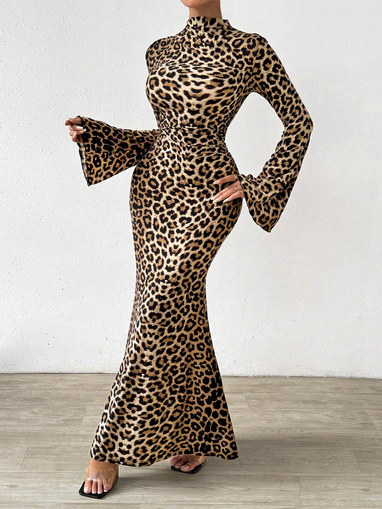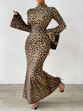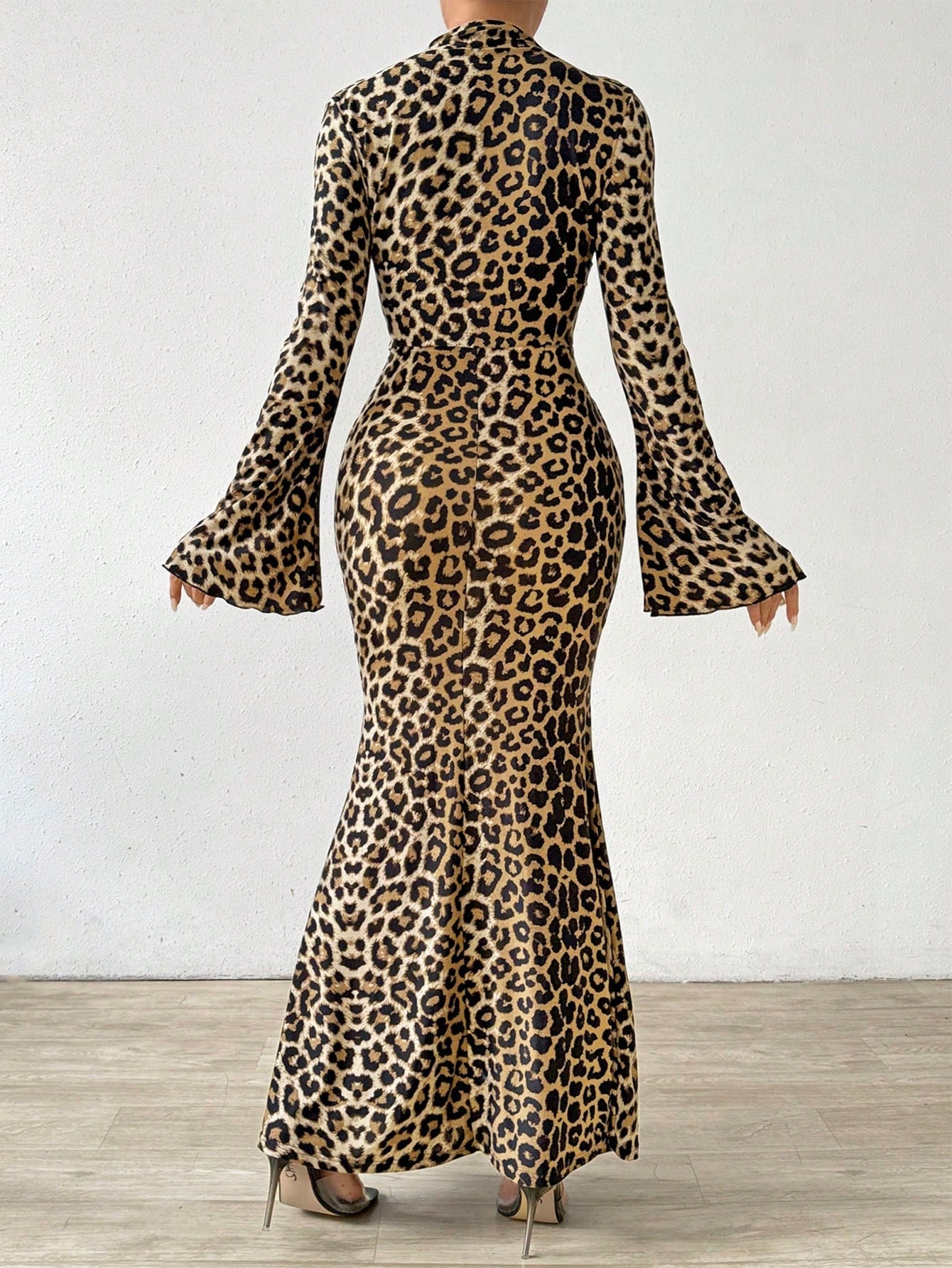 Chic & Wild: Leopard Print Bell Sleeve Maxi Dress for Effortless Elegance