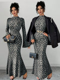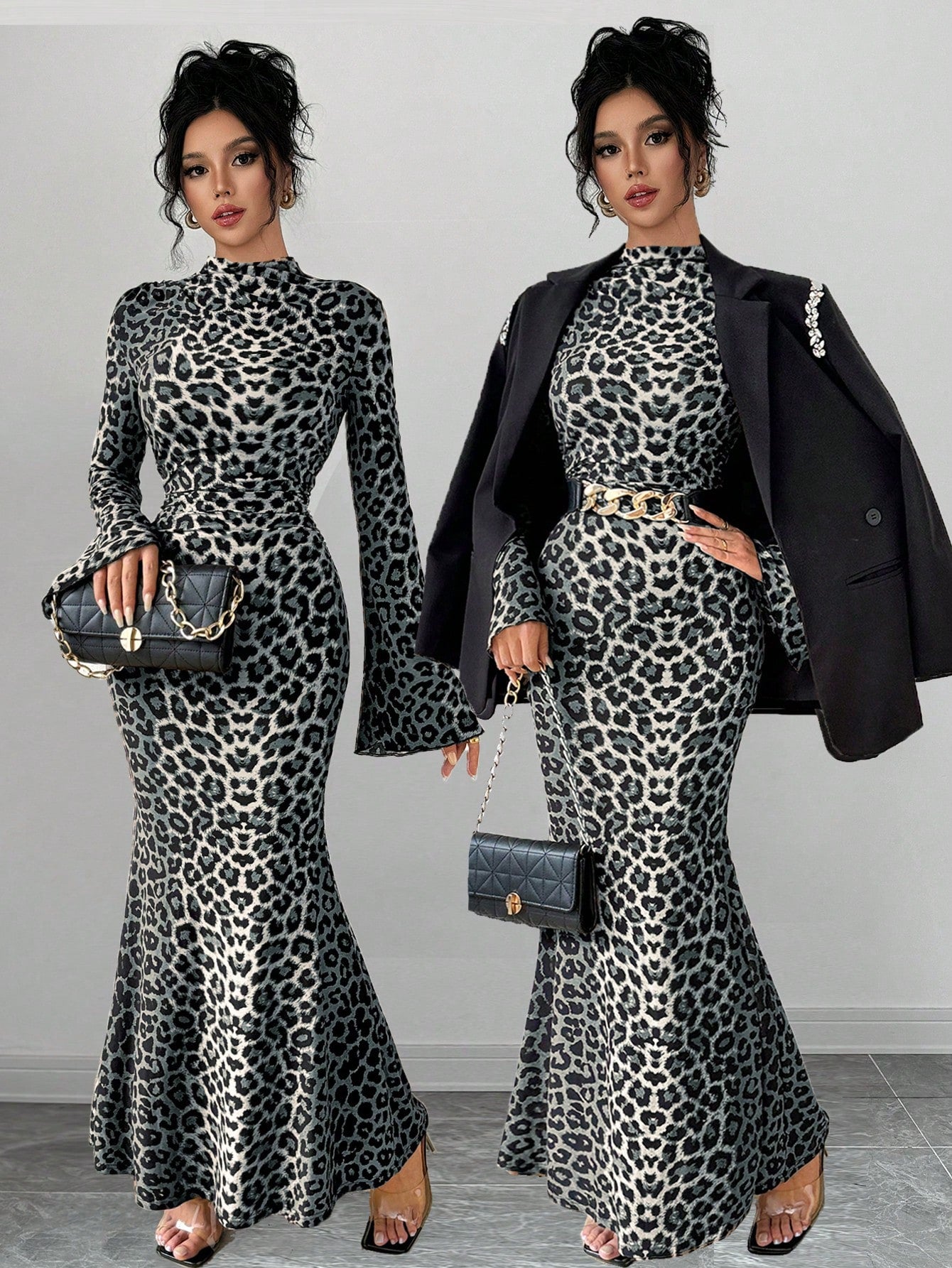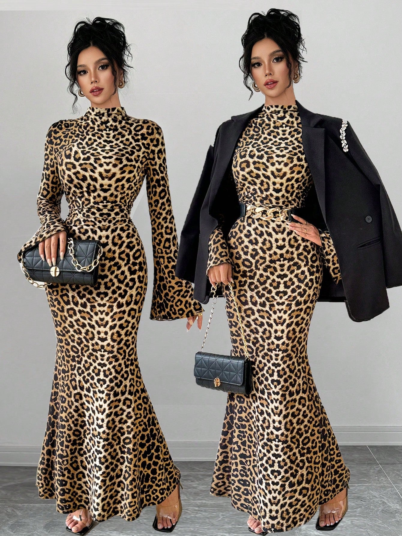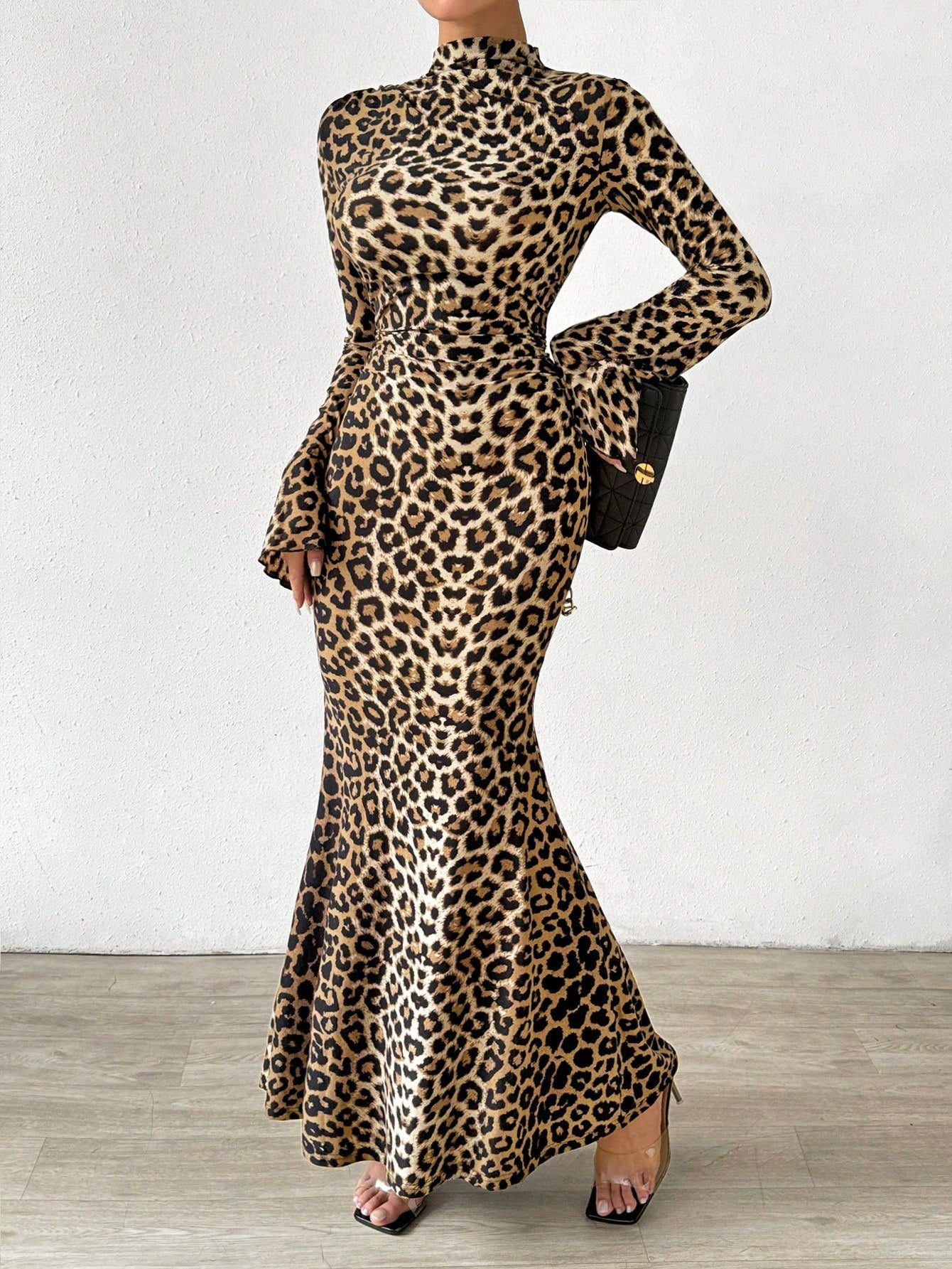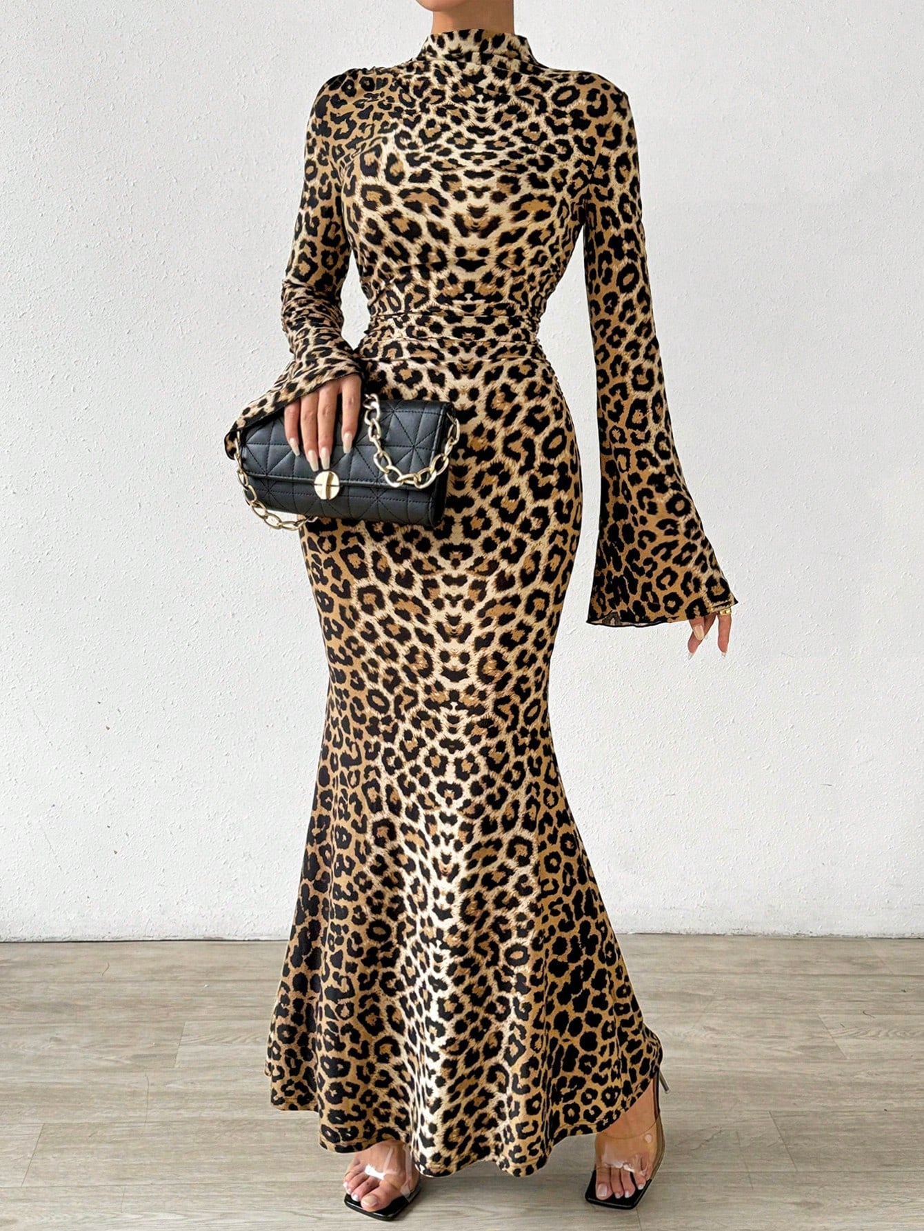 Chic & Wild: Leopard Print Bell Sleeve Maxi Dress for Effortless Elegance