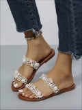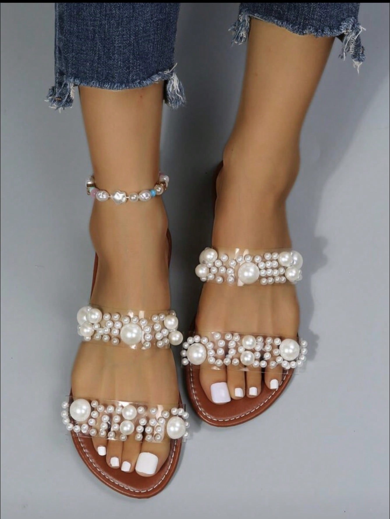 Clear Strap Flat Sandals with Imitation Pearl Decor for Elegant Ladies