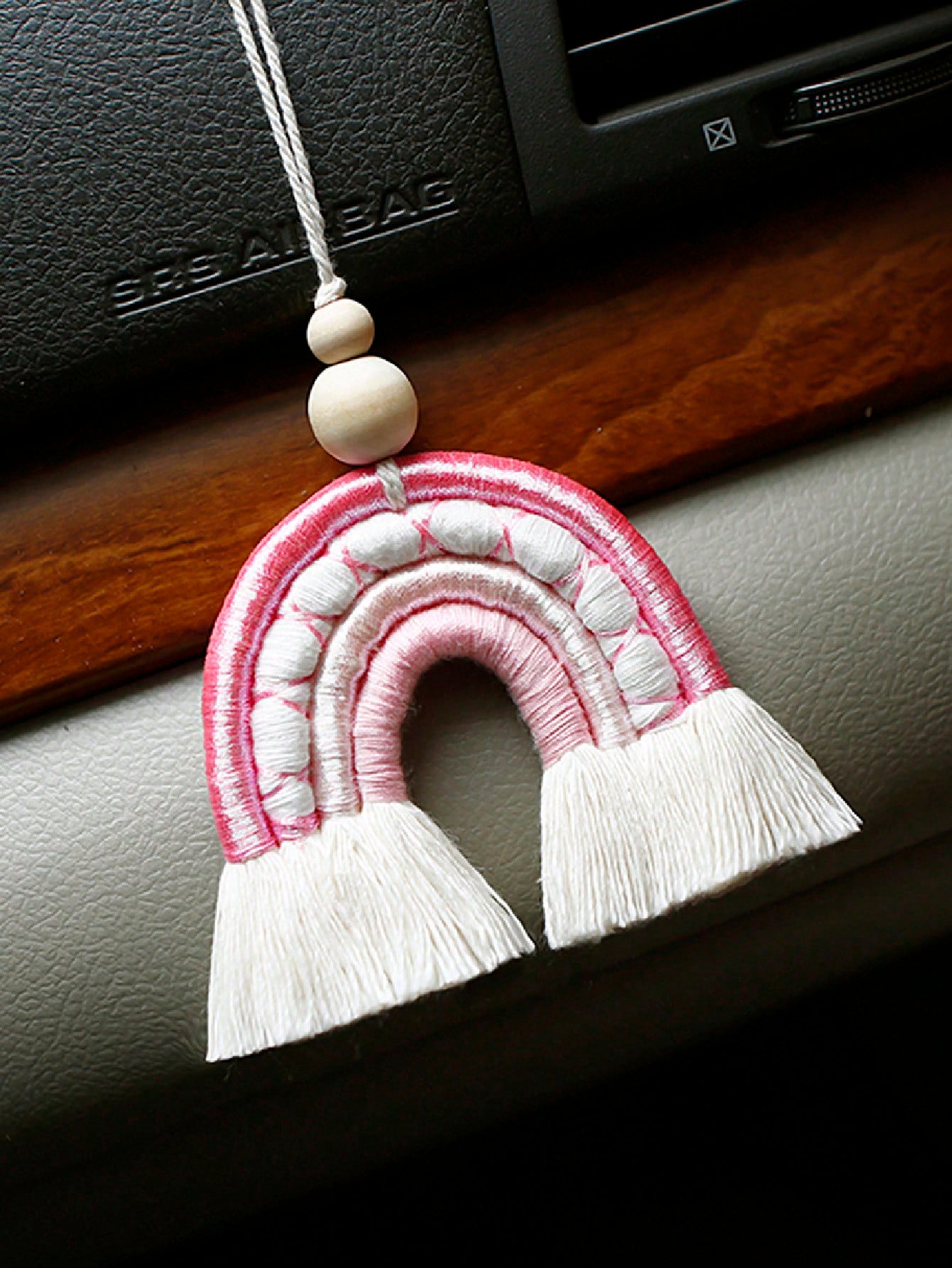 Enhance your car's interior with our Colorful Charm: Handmade Rainbow Woven Pendant. Handcrafted for a unique design, this pendant adds a splash of color to your rearview mirror. Made with vibrant woven materials, this pendant is the perfect accessory to brighten up any drive.