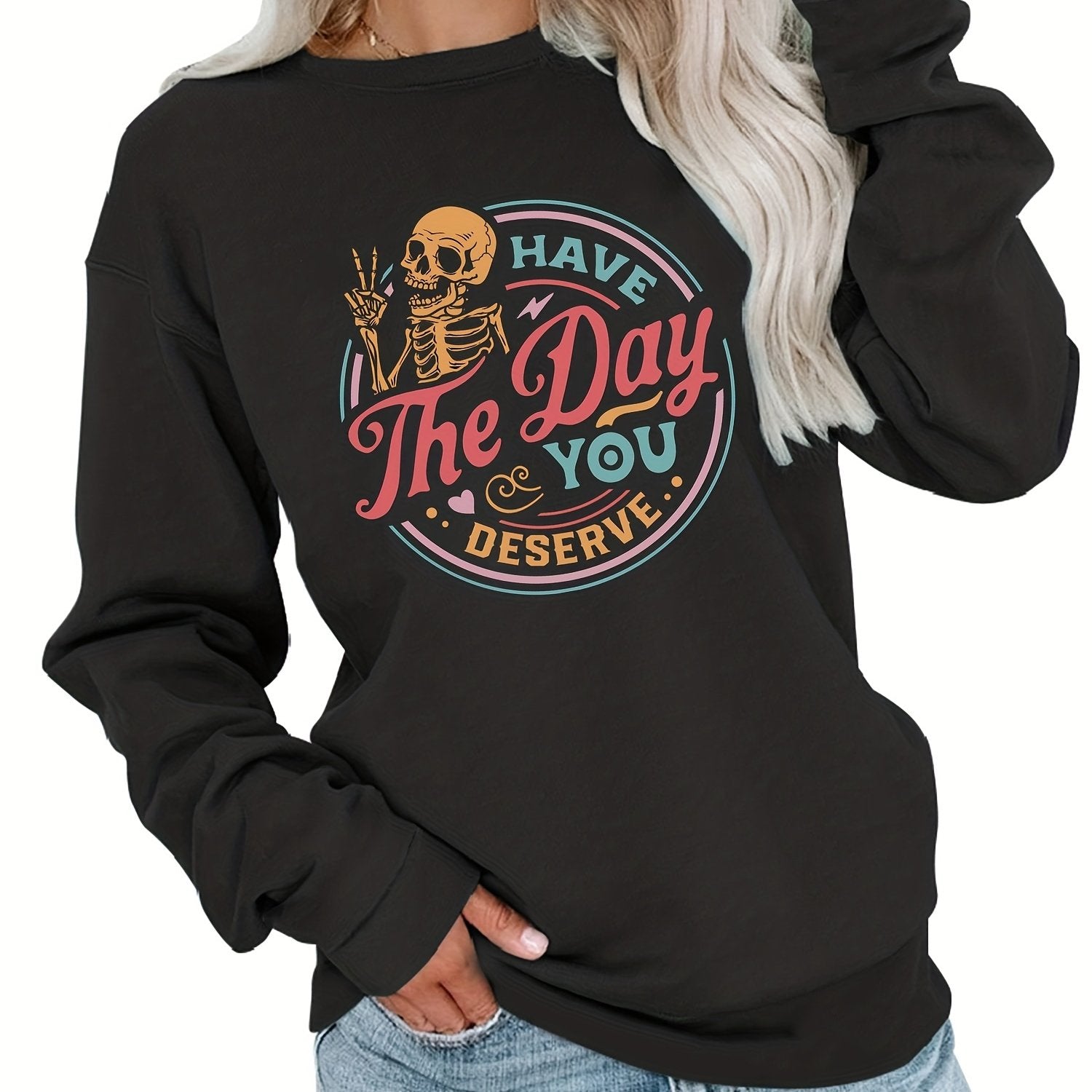 Colorfull Skeleton & Letter Print Pullover Sweatshirt, Casual Long Sleeve Crew Neck Sweatshirt, Women's Clothing