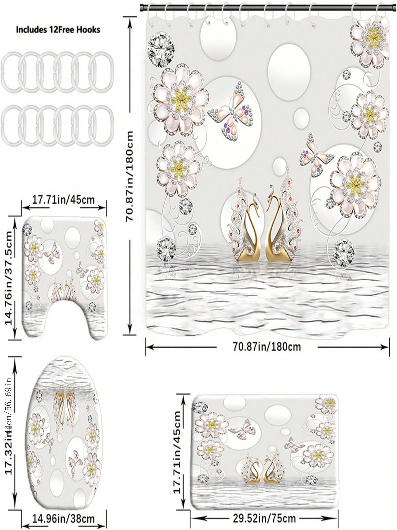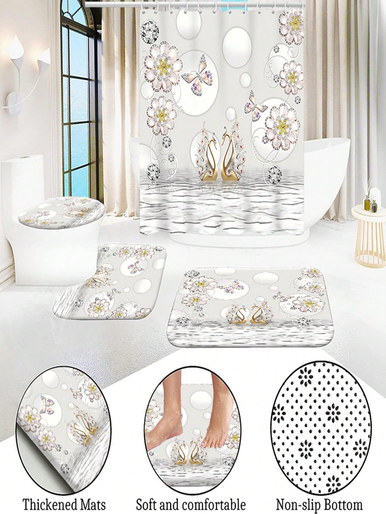 shower curtain, toilet covers, and bath mats with non-slip rugs. Made of high-quality polyester fabric, this set is durable and perfect for any windows in your bathroom. Enjoy a cozy and functional bathroom with our all-in-one set."