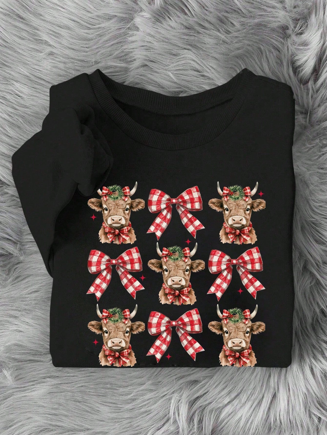 Get into the holiday spirit with our Cozy Christmas Vibes Highland Cow Bow Print Sweatshirt for Women. Made with ultra soft material, this hoodie features a charming cow with a bow print, perfect for spreading holiday cheer. Stay warm and stylish this season.