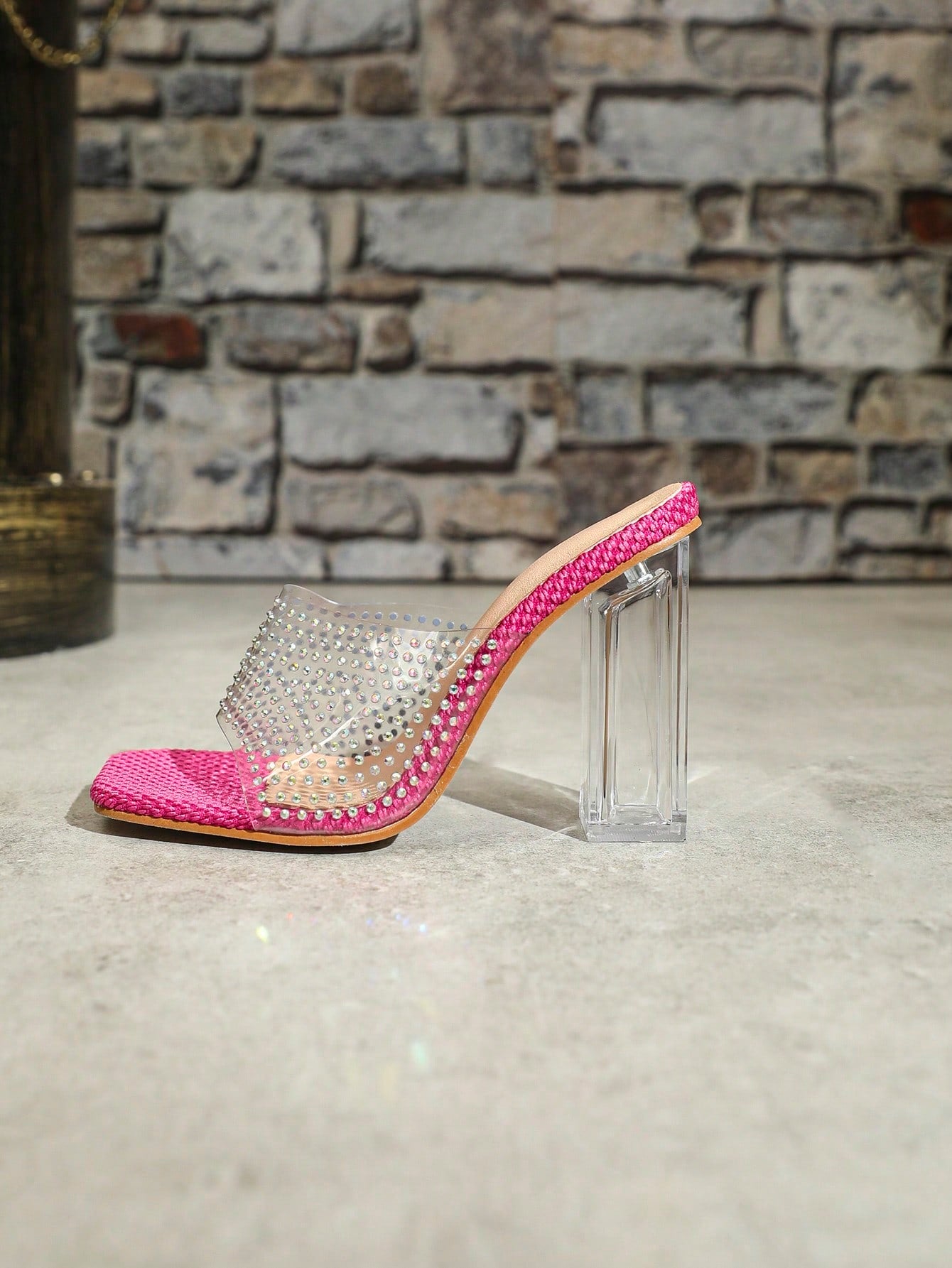 Sandals with Rhinestones. The crystal clear design adds a touch of elegance, while the high heel provides a comfortable lift. Step out in style with these beautifully embellished jelly sandals."