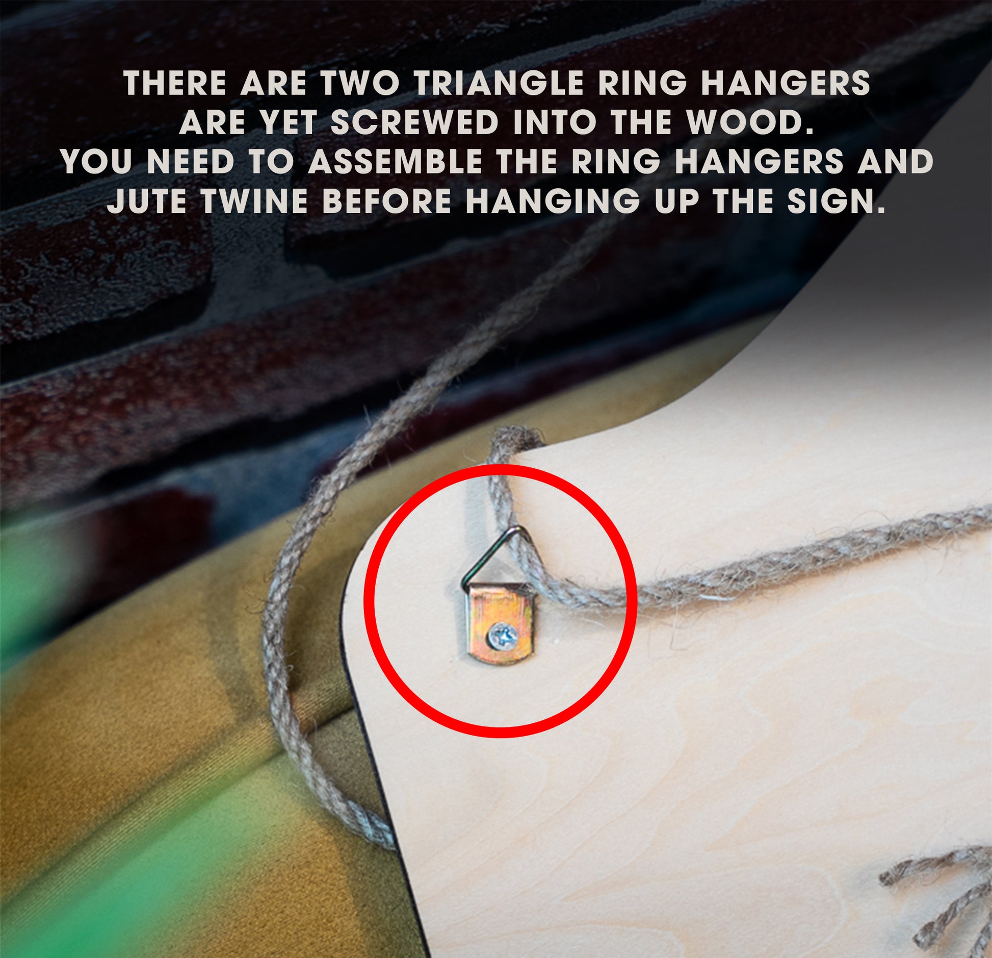 *For this product, two triangle ring hangers are yet screwed into the wood. You need to assemble the ring hangers and jute twine before hanging up the sign.