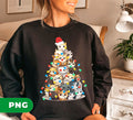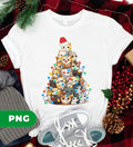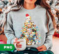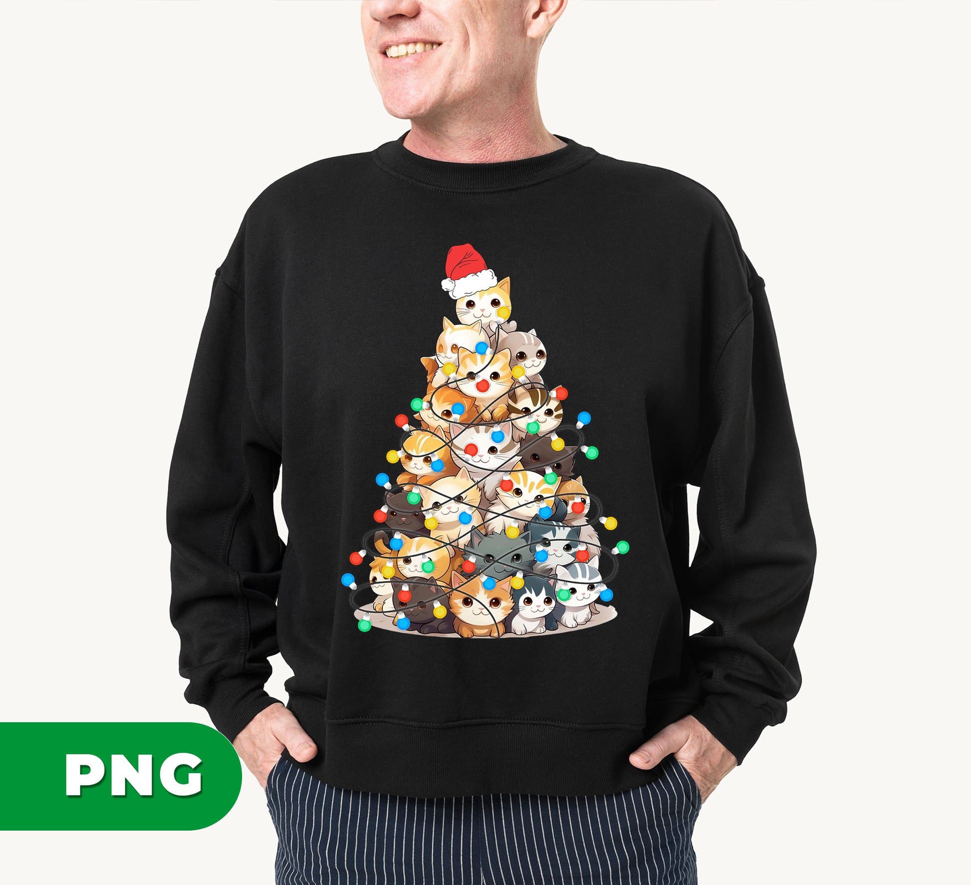 Cute Cat Christmas Tree PNG with Kittens Stacked in Tree Shape, Colorful Holiday Lights, Santa Hat, PNG For Shirts, PNG Sublimation