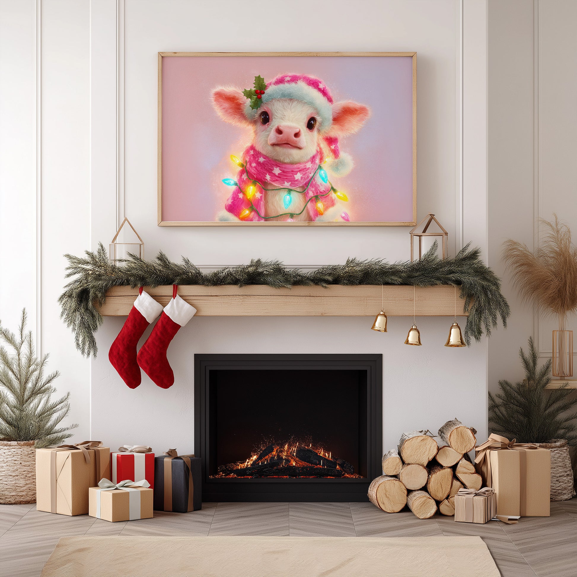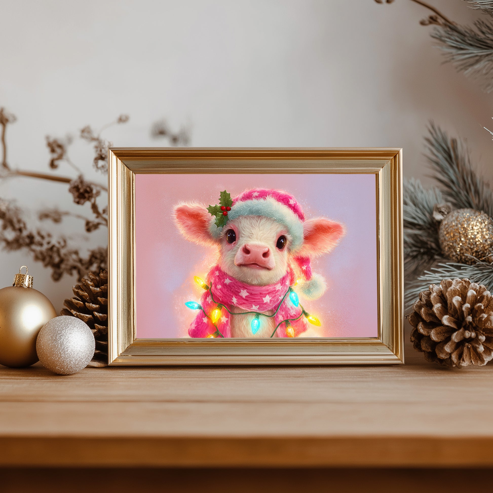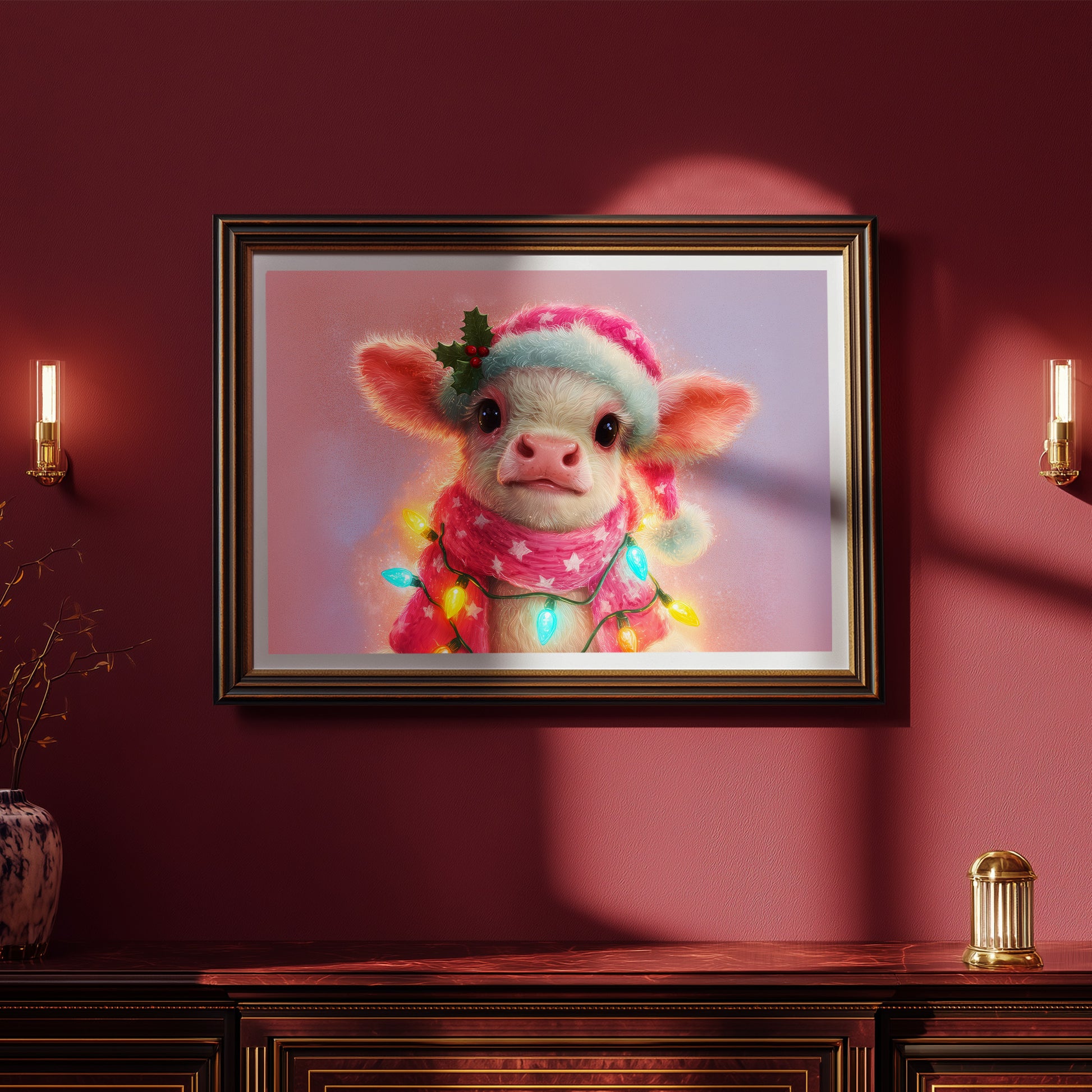 This adorable Christmas calf illustration showcases a sweet baby cow dressed in a pink Santa hat and matching scarf, wrapped in glowing holiday lights that add a magical festive shimmer. With its soft fur, big expressive eyes, and gentle winter glow, this artwork brings a heartwarming charm perfect for Christmas decorating. Ideal for nurseries, kids’ rooms, farmhouse-style interiors, or holiday gallery walls, this print adds warmth, joy, and seasonal whimsy to any space. High-resolution digital artwork ready for instant download and easy printing at home or through your preferred print service.