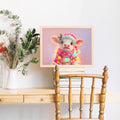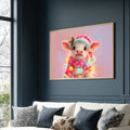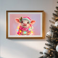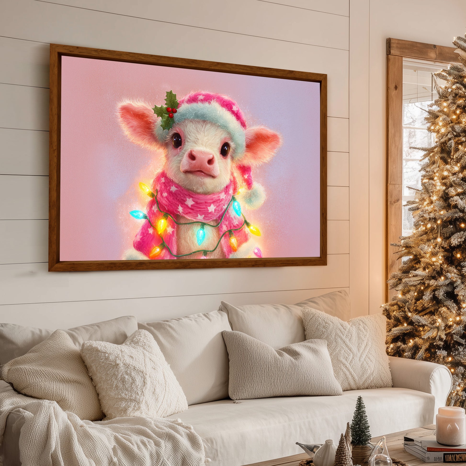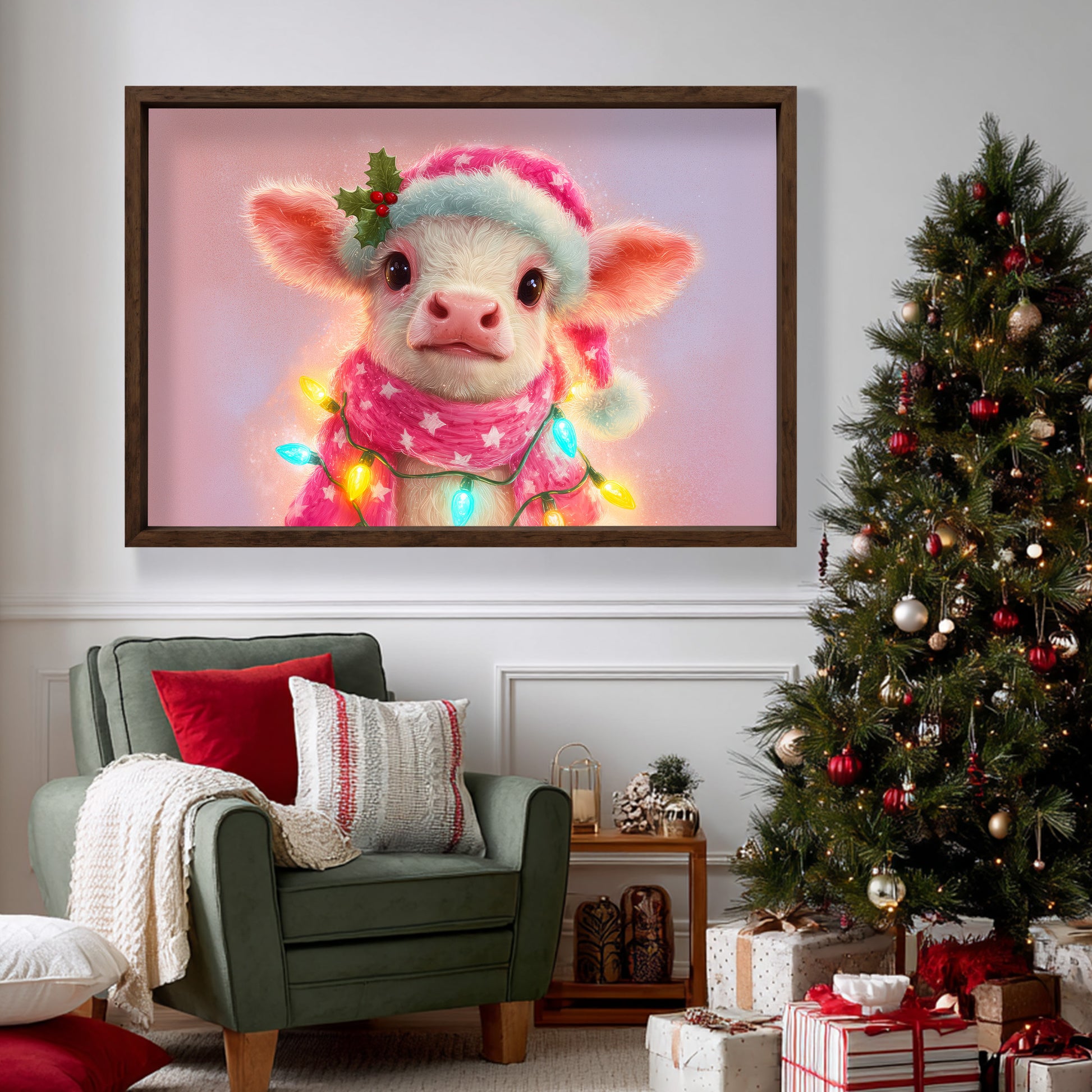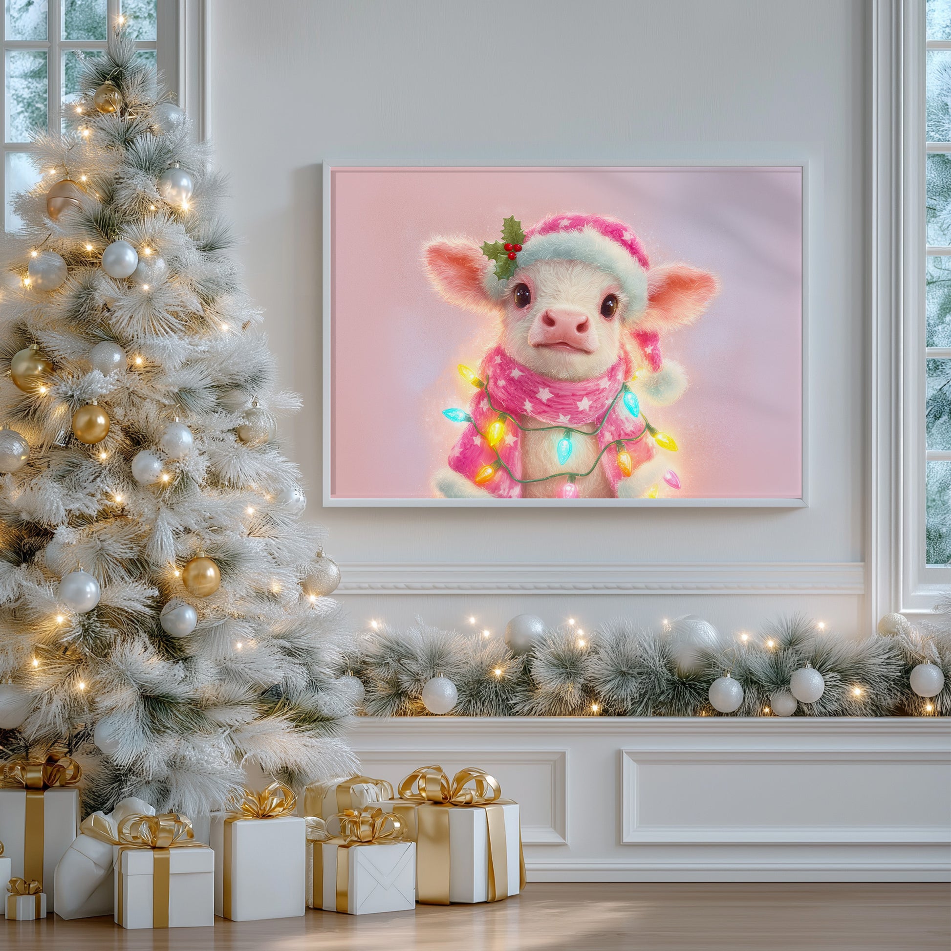 This adorable Christmas calf illustration showcases a sweet baby cow dressed in a pink Santa hat and matching scarf, wrapped in glowing holiday lights that add a magical festive shimmer. With its soft fur, big expressive eyes, and gentle winter glow, this artwork brings a heartwarming charm perfect for Christmas decorating. Ideal for nurseries, kids’ rooms, farmhouse-style interiors, or holiday gallery walls, this print adds warmth, joy, and seasonal whimsy to any space. High-resolution digital artwork ready for instant download and easy printing at home or through your preferred print service.