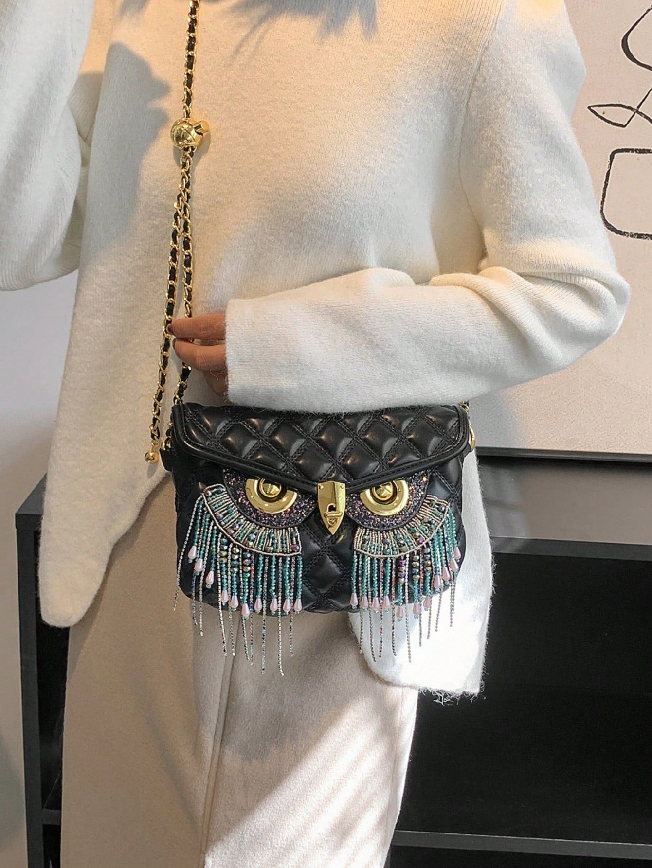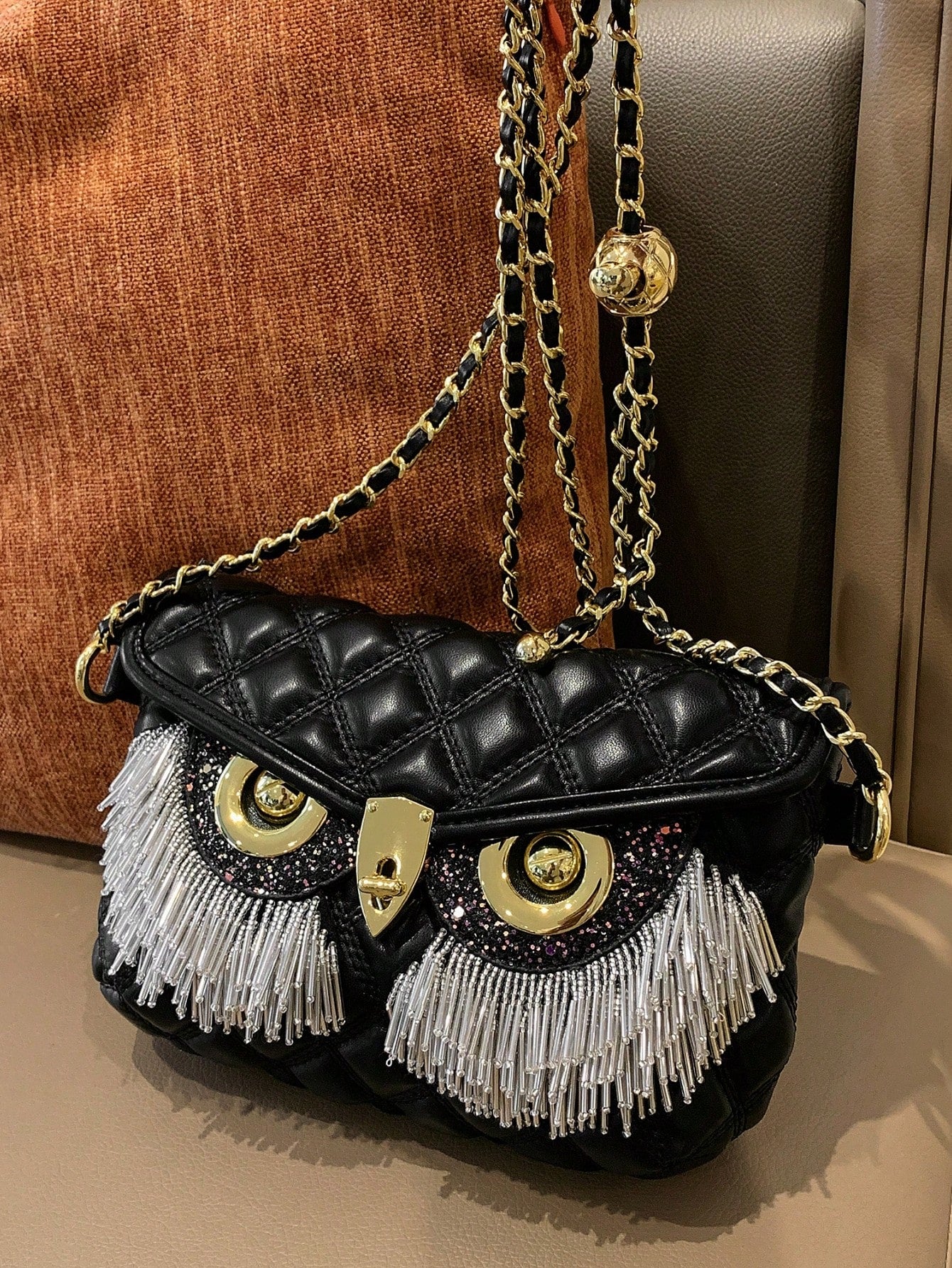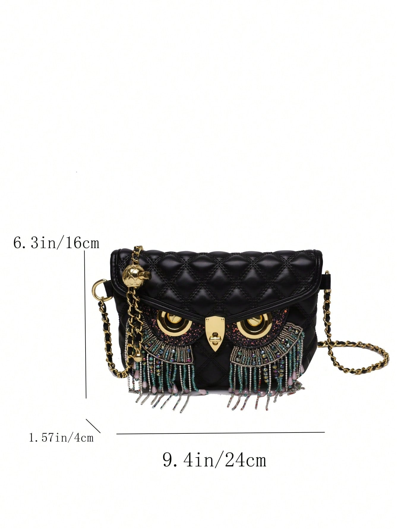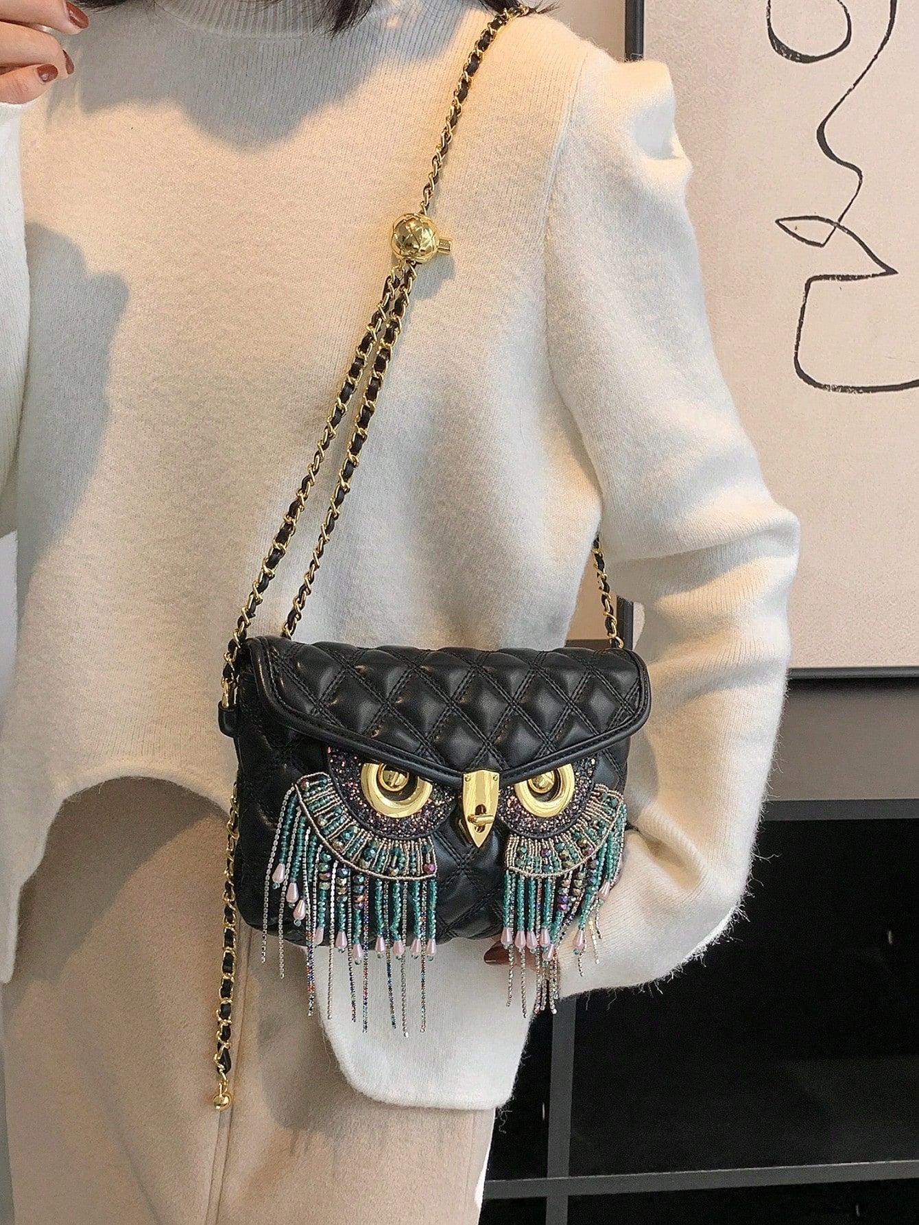 Diamonds and Pearls: Fashionable Chain Link Crossbody Evening Bag with Metallic Owl Print Detail