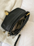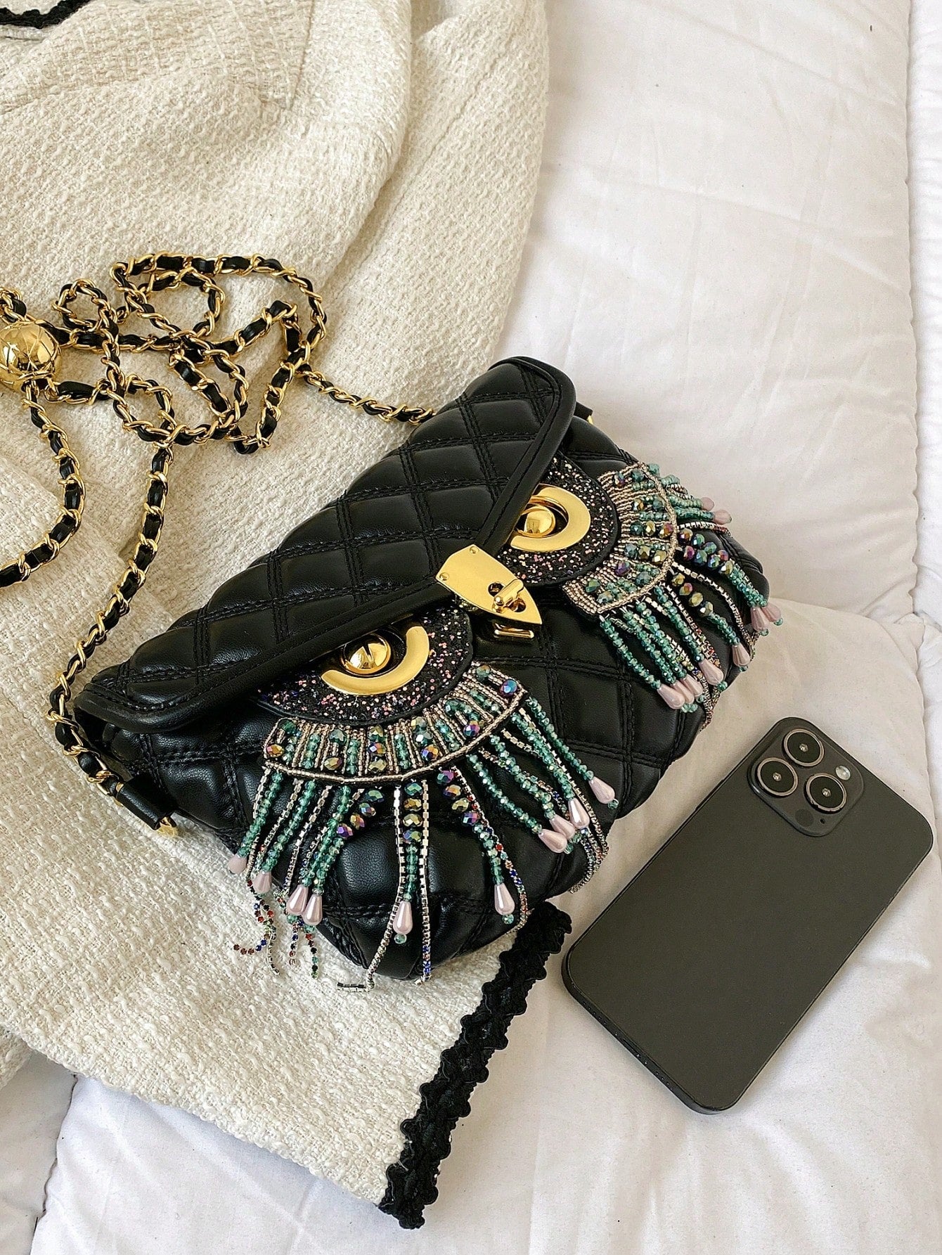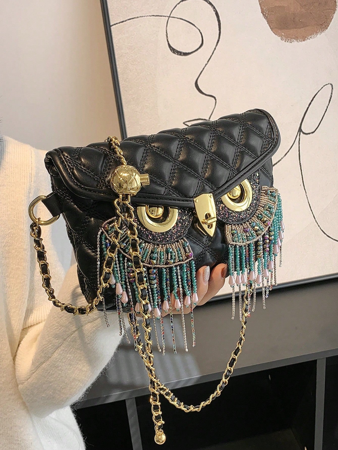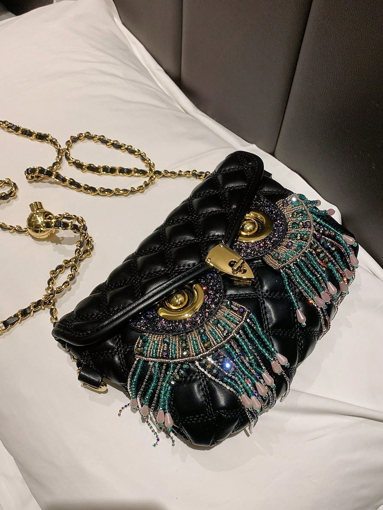 Diamonds and Pearls: Fashionable Chain Link Crossbody Evening Bag with Metallic Owl Print Detail